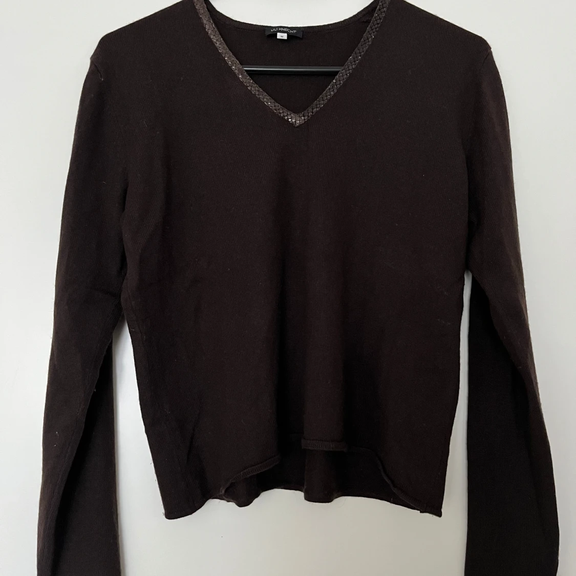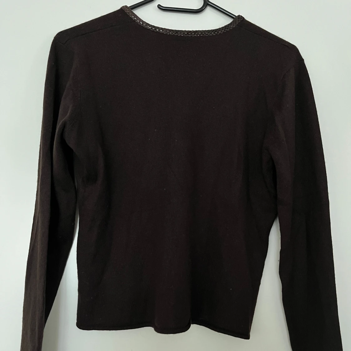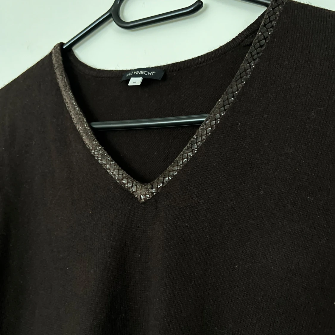 Brun långärmad tröja med V-ringning och dekorativ kant från Uli Knecht i storlek M (mer som en XS/S). I mycket fint skick. 53% silke och 47% kashmir. Mått: Längd ca 48 cm Byst ca 44 cm Midja ca 40 cm Ärmlängd mätt från axeln ca 55 cm Axelmått ca 40 cm