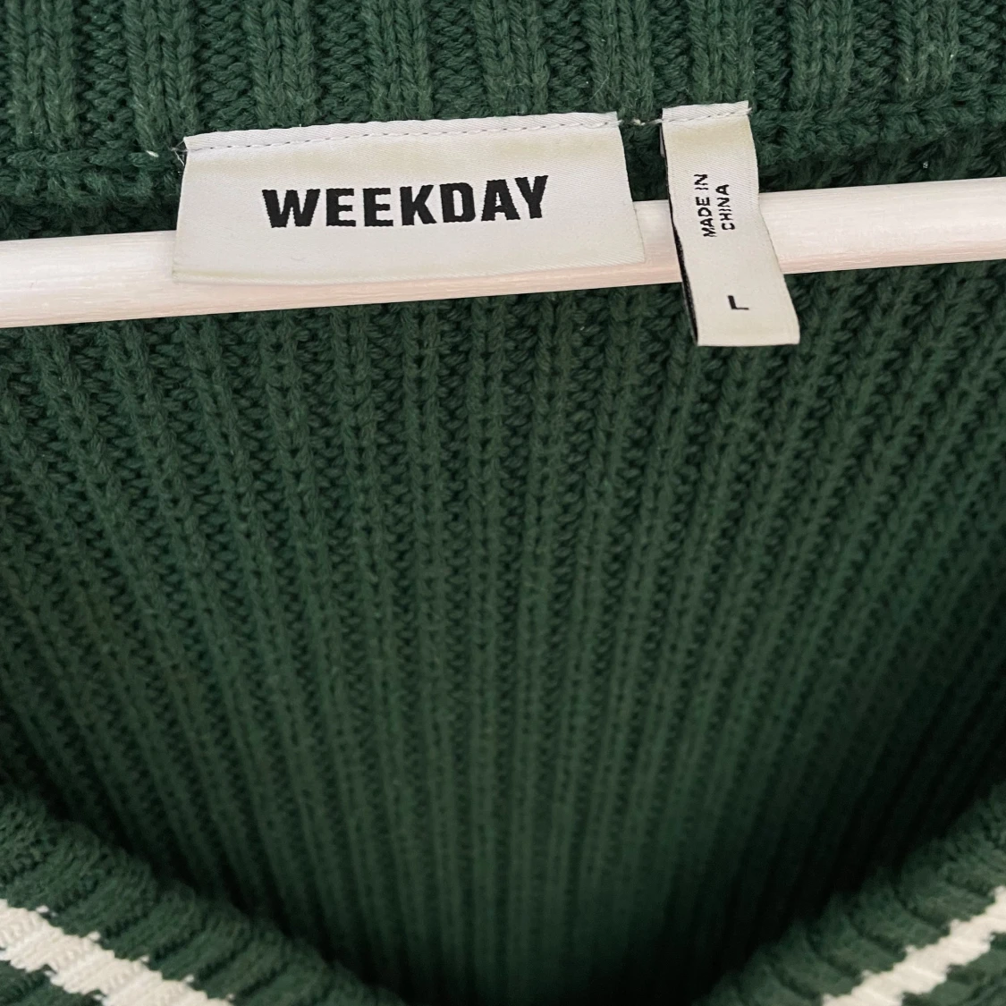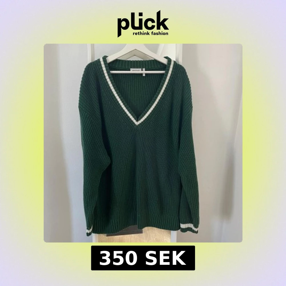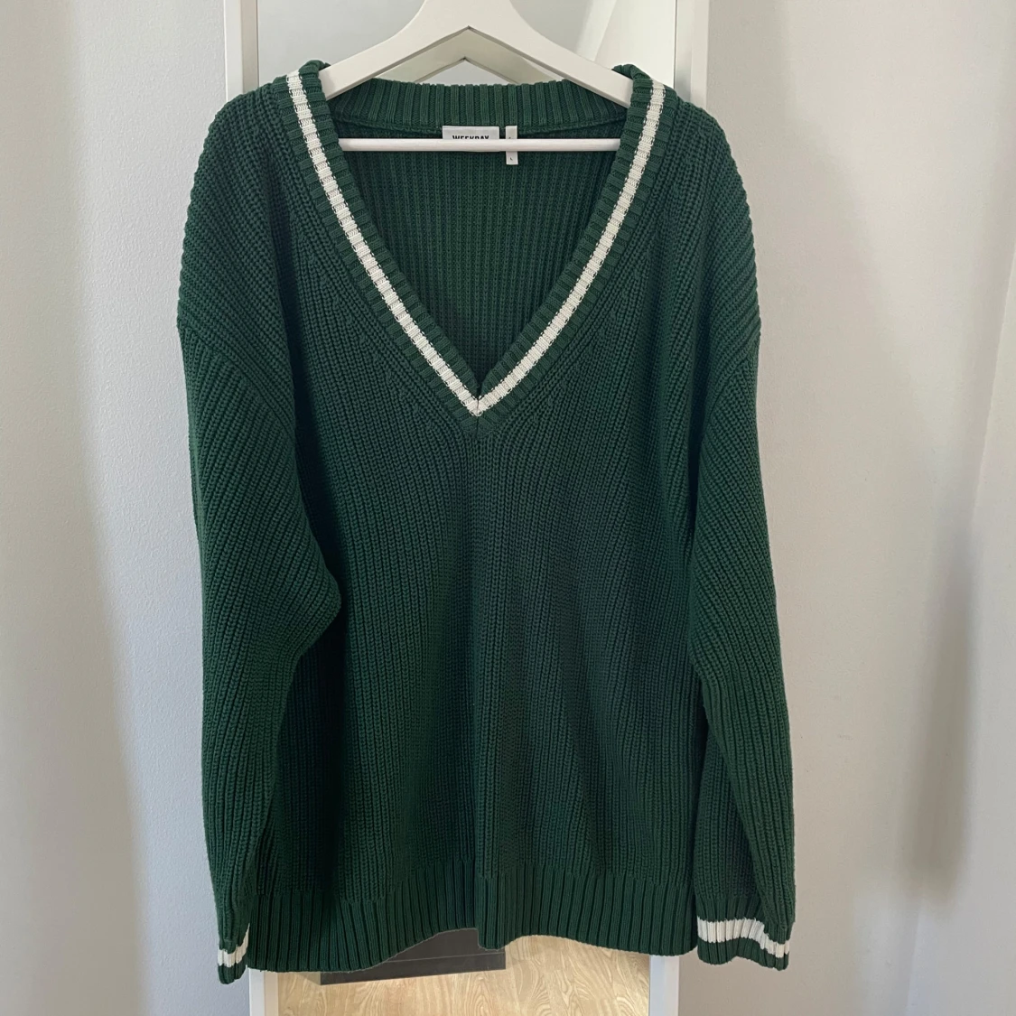 Mörkgrön stickad tröja från Weekday med v-ringning och vita ränder vid halsringningen och ärmsluten. Oversized passform och långa ärmar, perfekt för lager-på-lager. Snygg ribbad struktur som ger en chill vibe. Passar mindre storlekar för en mer oversize look. Tyvärr aldrig använd pga. sensory issues.