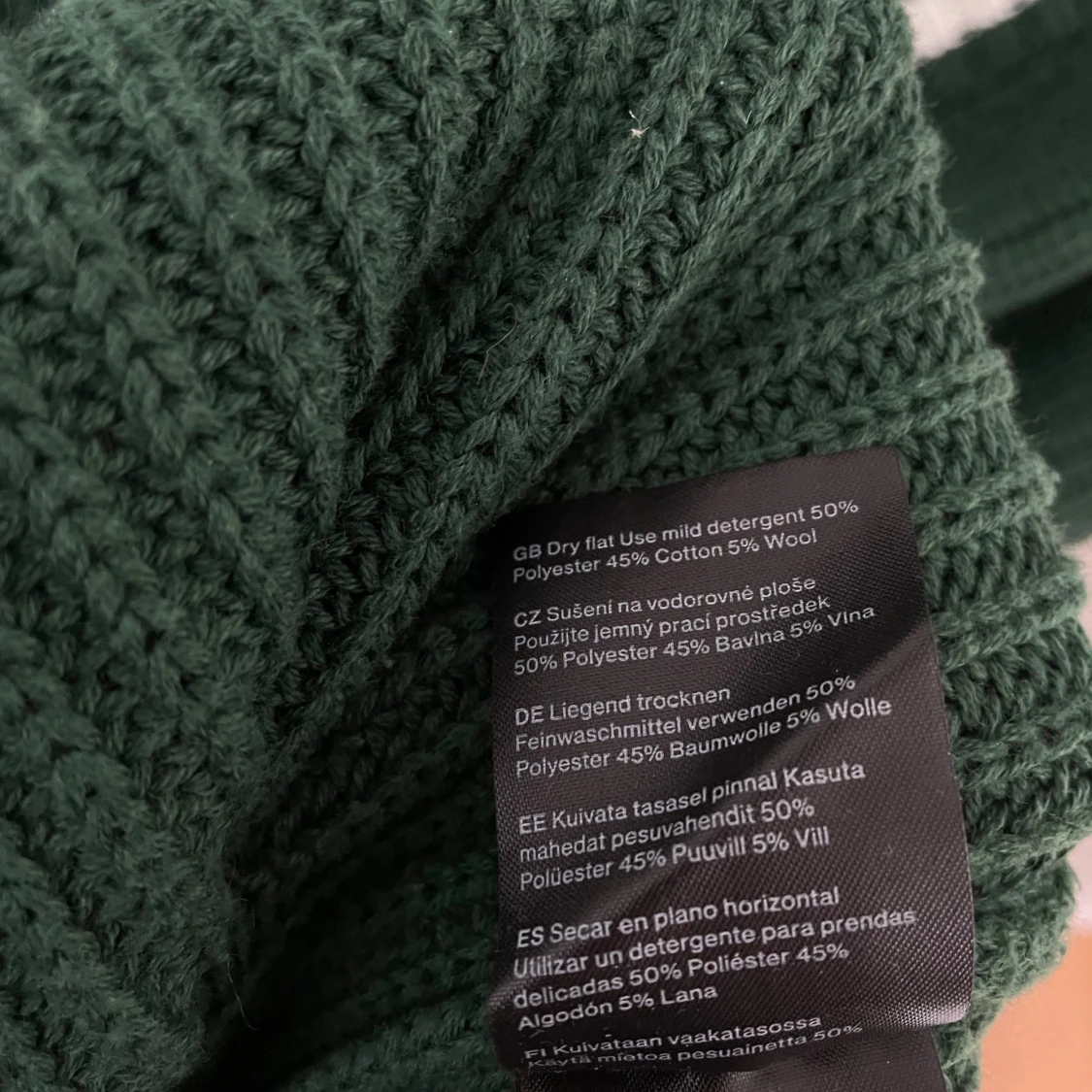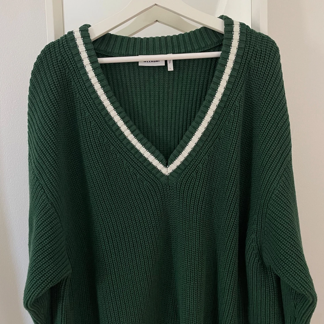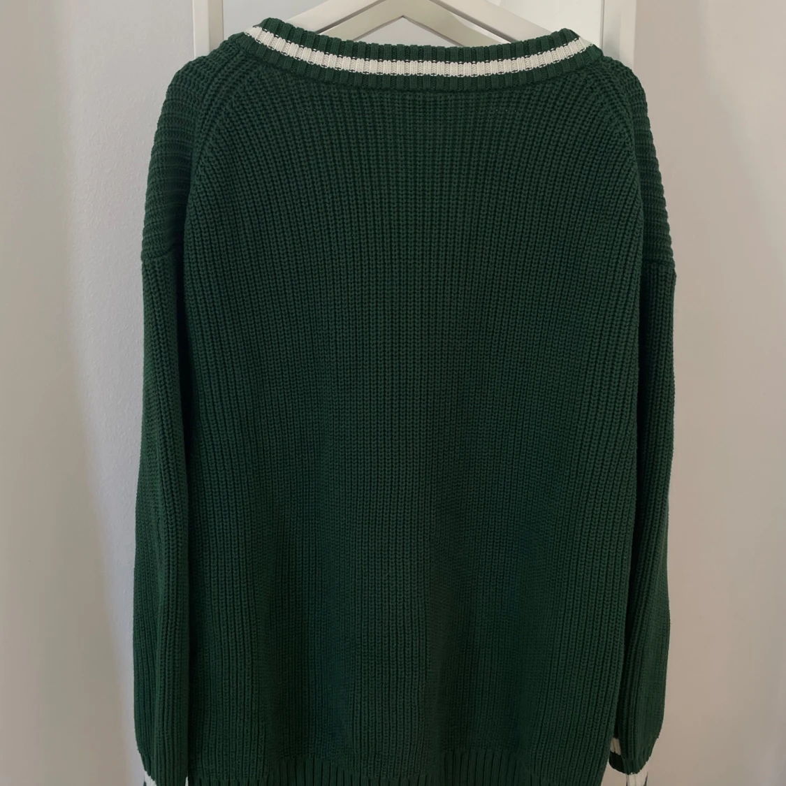 Mörkgrön stickad tröja från Weekday med v-ringning och vita ränder vid halsringningen och ärmsluten. Oversized passform och långa ärmar, perfekt för lager-på-lager. Snygg ribbad struktur som ger en chill vibe. Passar mindre storlekar för en mer oversize look. Tyvärr aldrig använd pga. sensory issues.