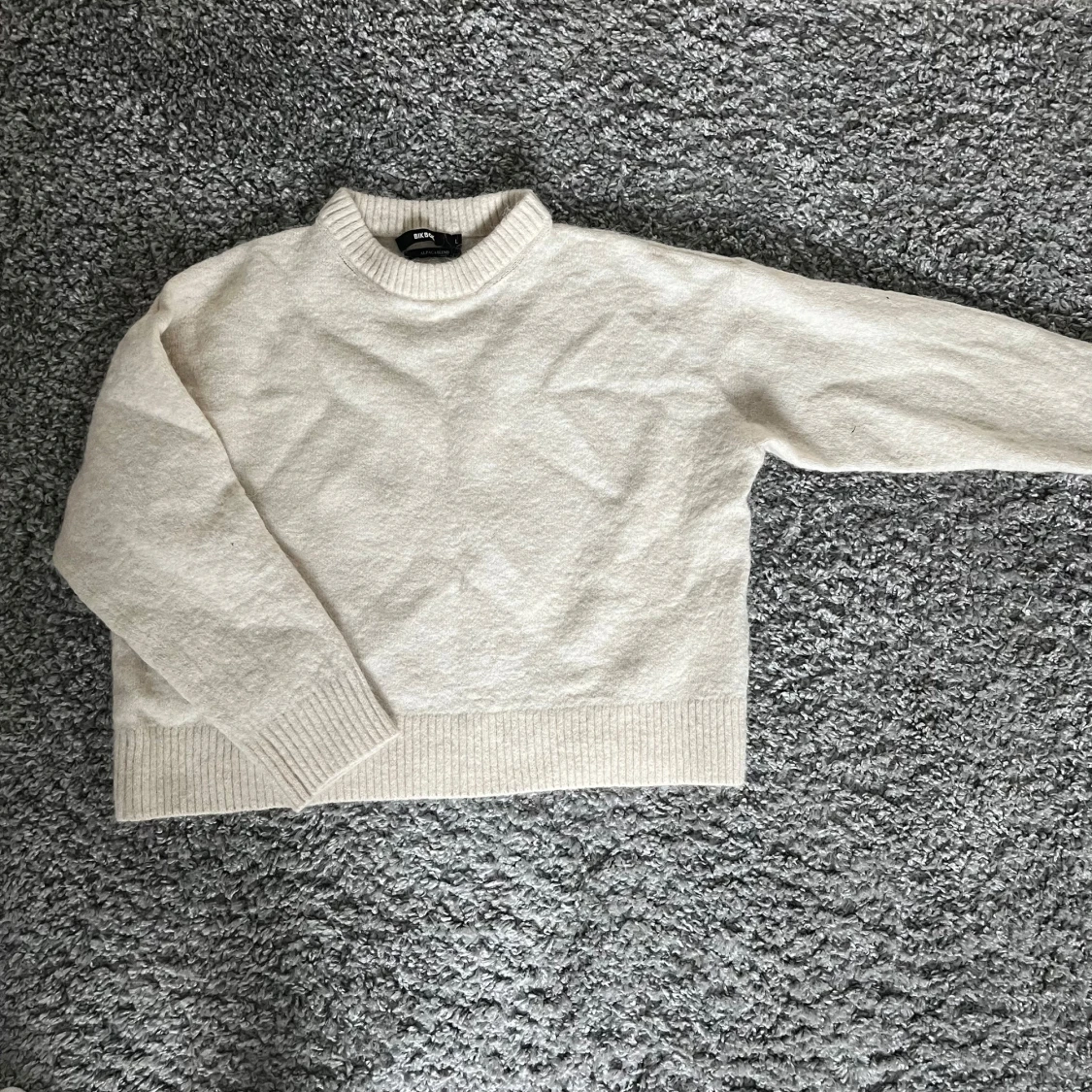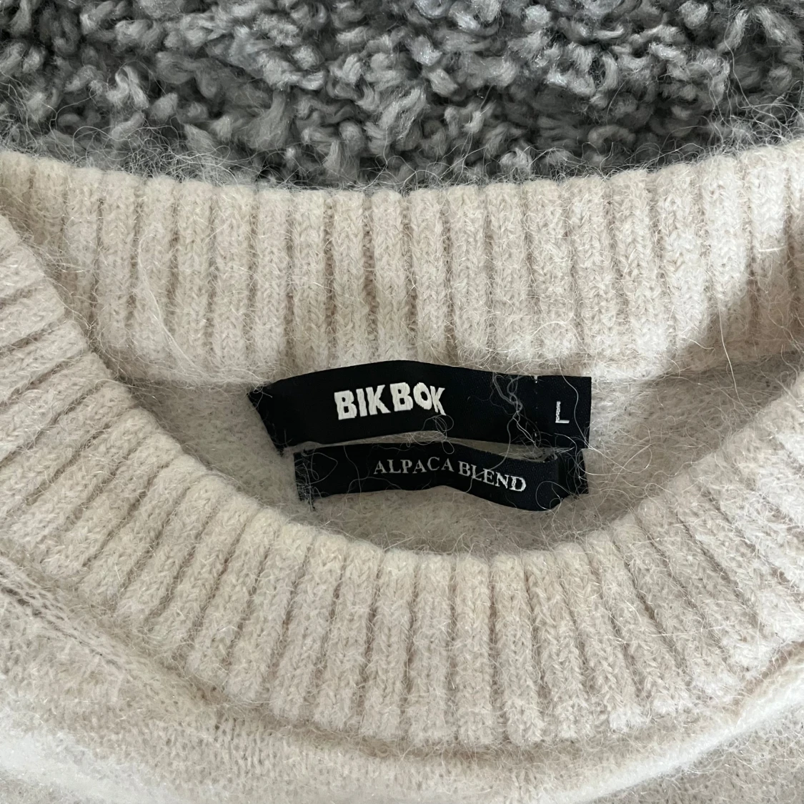 Säljer en mysig beige stickad tröja från Bik Bok i alpackablandning. Tröjan har en rund hals och långa ärmar med ribbade muddar. Perfekt för kyliga dagar! Den är i storlek L men sitter bra på mig som brukar ha S.