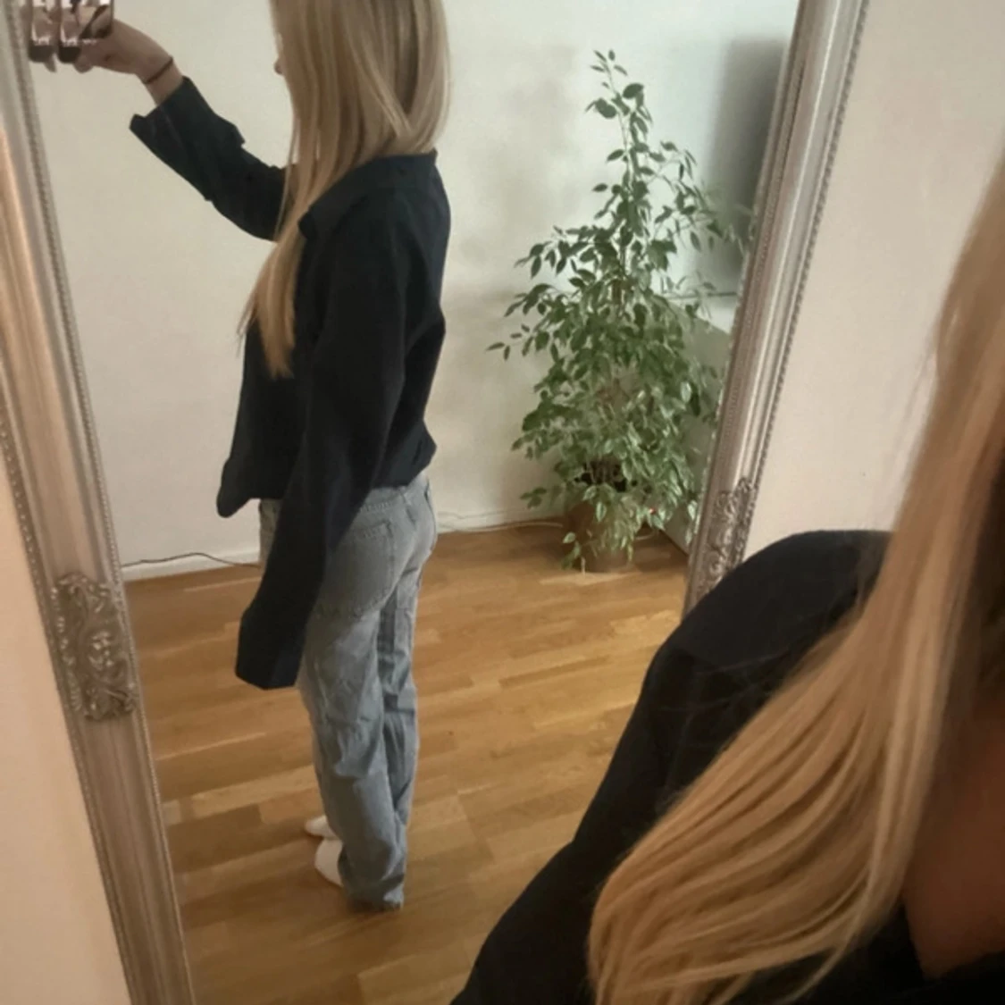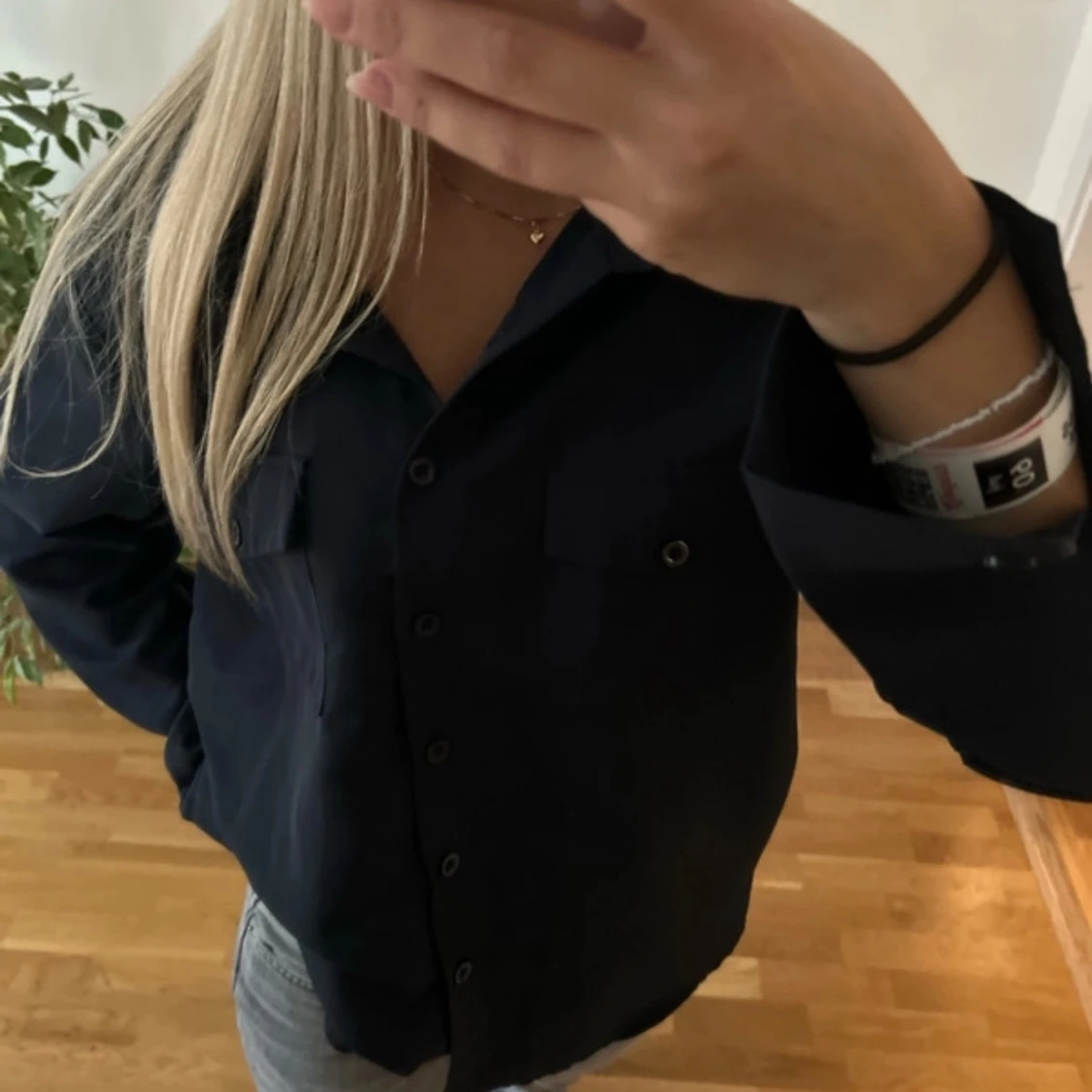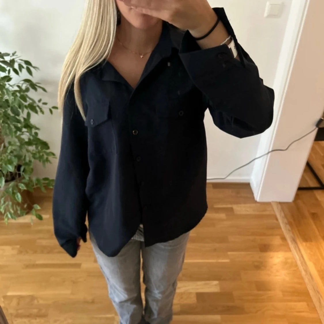 Mörkblå skjorta, jättebra skick, använd en gång. Bortklippt lapp därav vet ja inte storlek men skulle gissa på M. Funkar på mig med xs