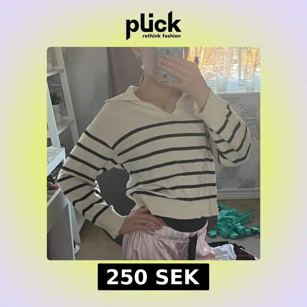 Säljer en stilren randig tröja i cream vitt och svart med en unik krage bak och en liten V ringning fram. Tröjan har långa ärmar och ribbade muddar vid ärmslut och nederkant. Perfekt för en stilren look. Använd runt 3 gånger. Kostade 300 kr när jag köpte den. Älskar den! Så himla fin och jätte jätte skön!! 😍😍