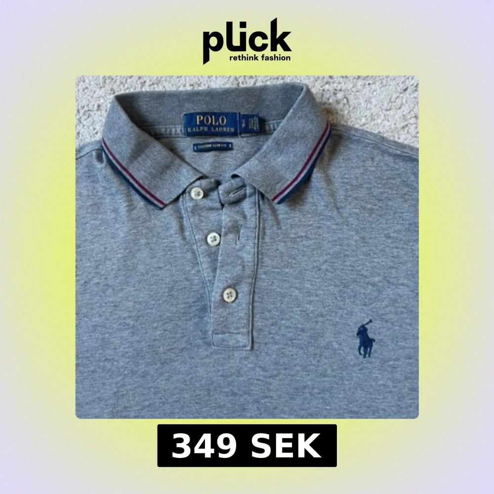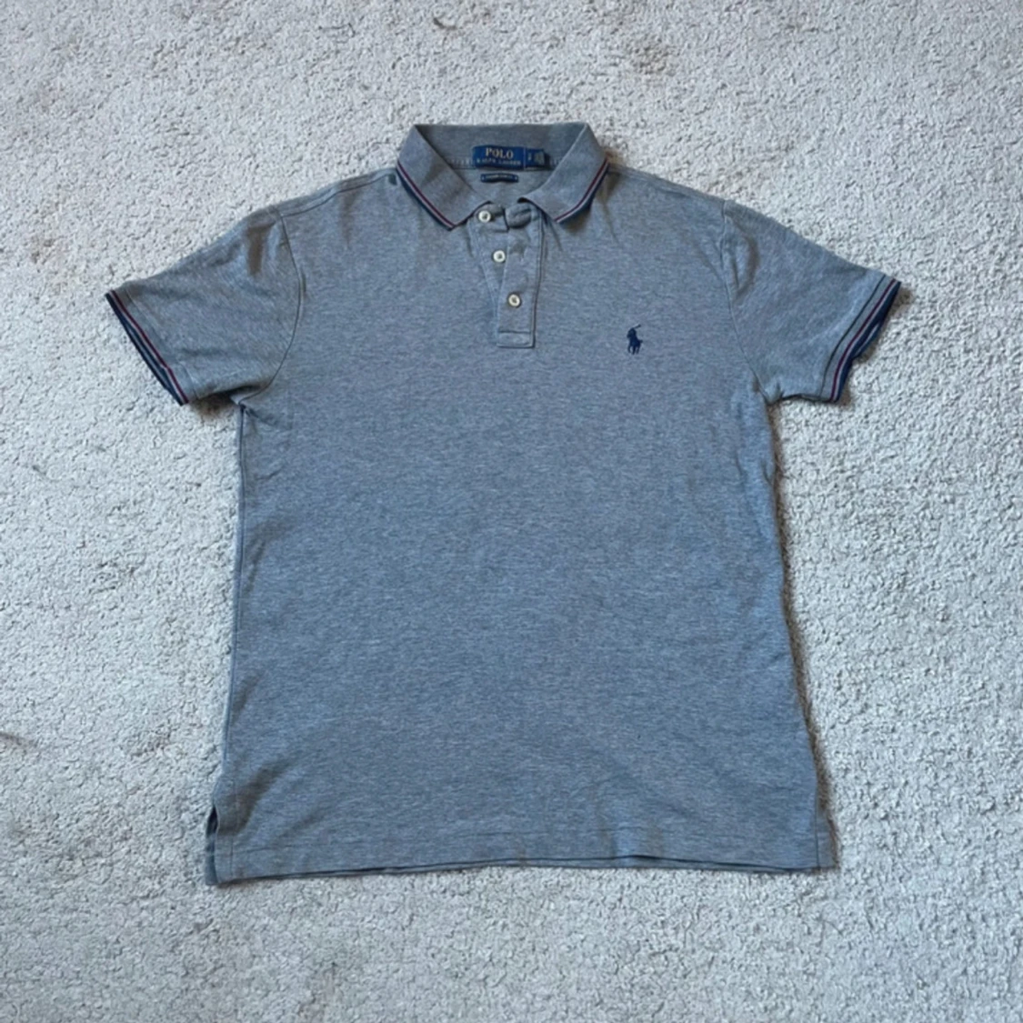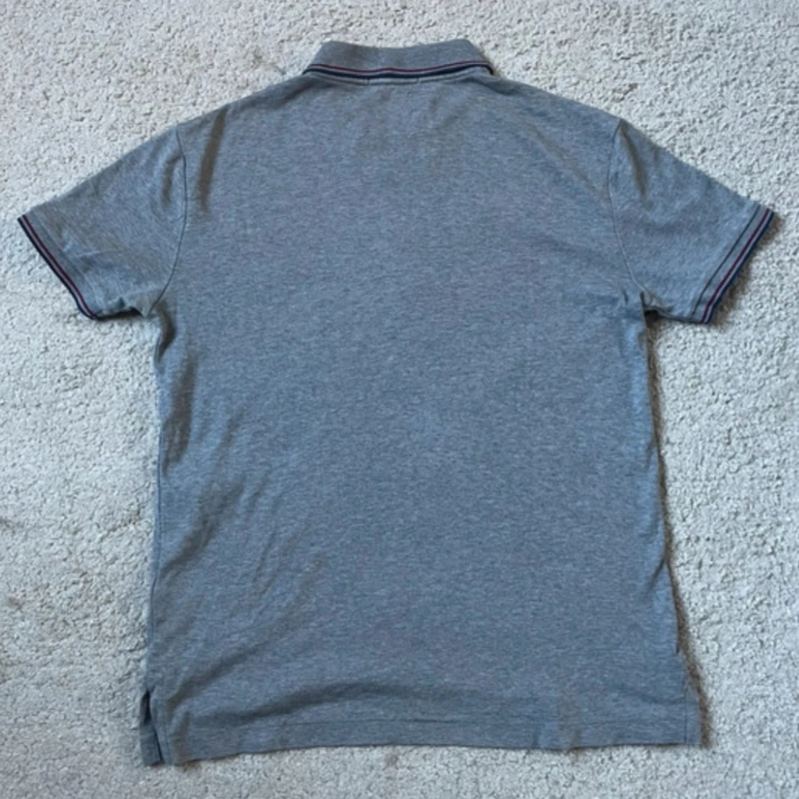 Snygg grå pikétröja från Polo Ralph Lauren med klassisk krage och knäppning framtill. Tröjan har marinblå och vinröda detaljer på krage och ärmslut samt den ikoniska broderade loggan på bröstet. Modellen är slim fit och i mjuk bomull. Storlek s men sitter xs (slim)