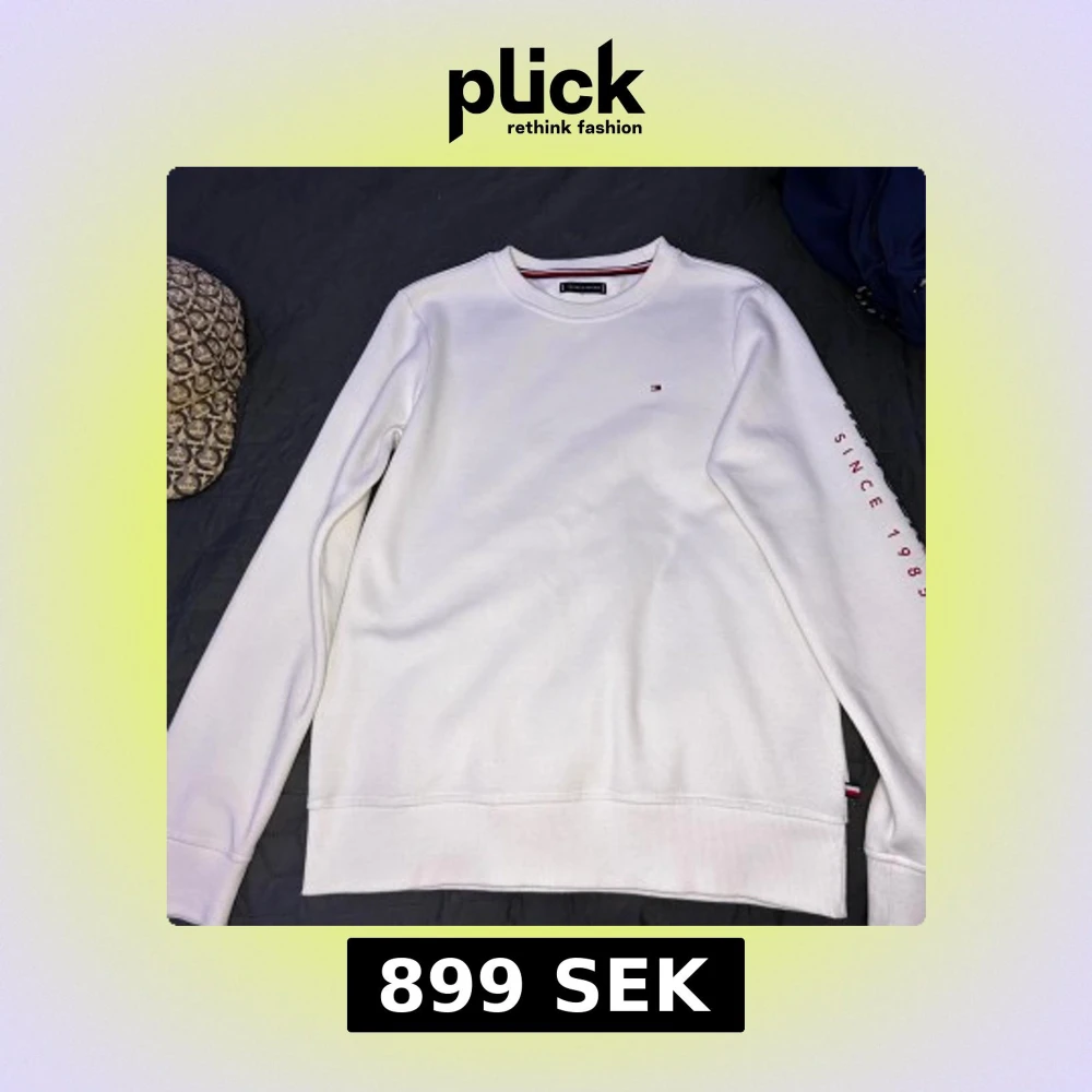 Vit sweatshirt från Tommy Hilfiger med tryck på vänstra ärmen, Limitiserad och väldigt sällsynt att få tag I, Storlek Small, Köpt runt 2020 och använt ett fåtal gånger så skicket är felfritt. Öppen att diskutera priset, kontakta mig vid fler frågor!