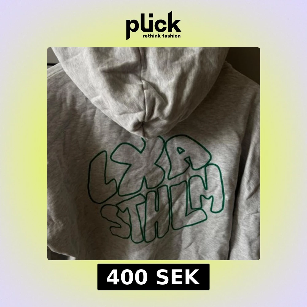 Säljer en grå hoodie från LXA i storlek XS. Tröjan har en stor huva, snörning och ett coolt grönt tryck med texten 'LXA STHLM' på ryggen. Mjuk insida och ribbade muddar vid ärmslut och nederkant. Perfekt för chill dagar. Skulle behöva strykas men annars inga defekter🩶💚