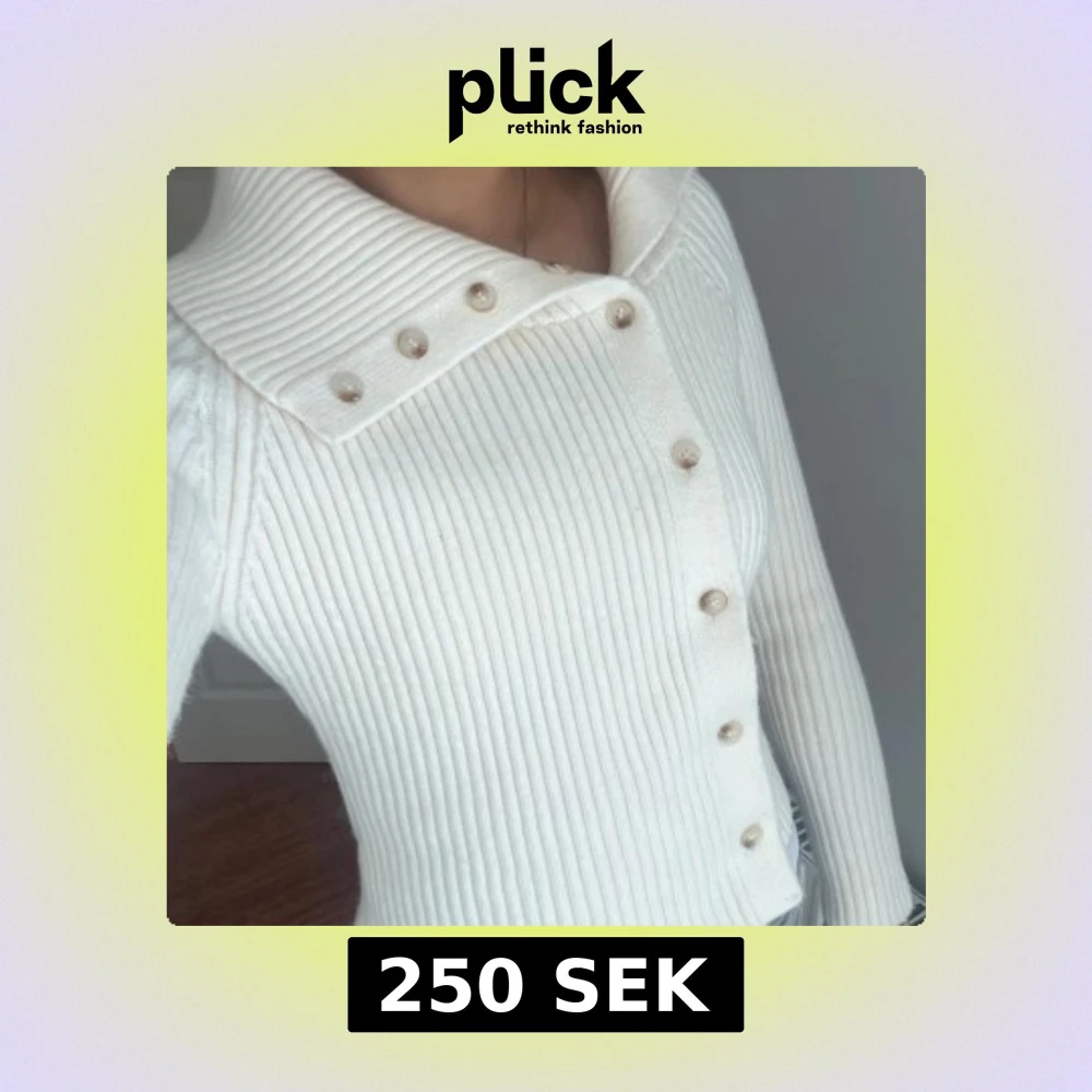 Snygg vit ribbad kofta med stora knappar framtill och en bred krage. Perfekt för att hålla sig varm och stilren under kyligare dagar. Passar bra till både jeans och kjol.