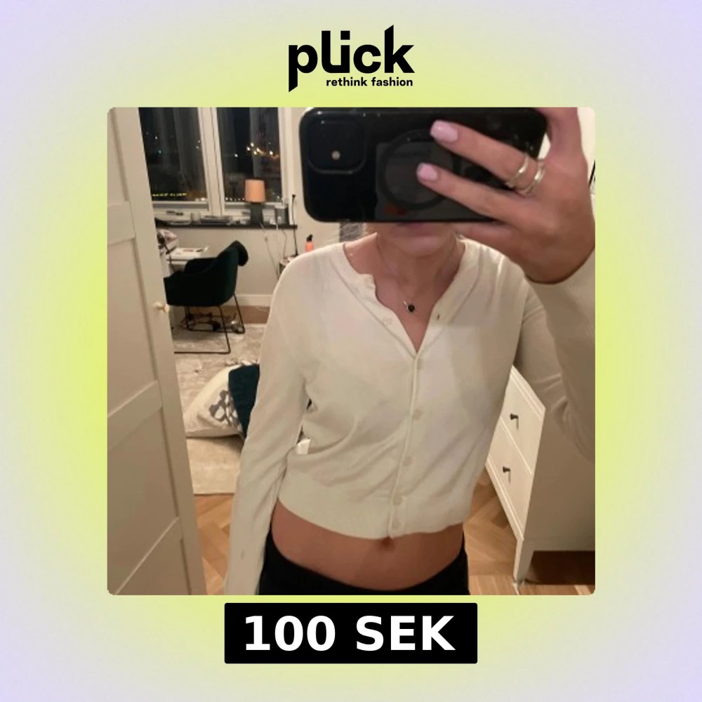 Säljer en vit kofta med knappar framtill. Koftan har långa ärmar och är perfekt för en stilren look. Passar bra till både jeans och kjol. Perfekt för vår och sommar! En liten defekt på armen!