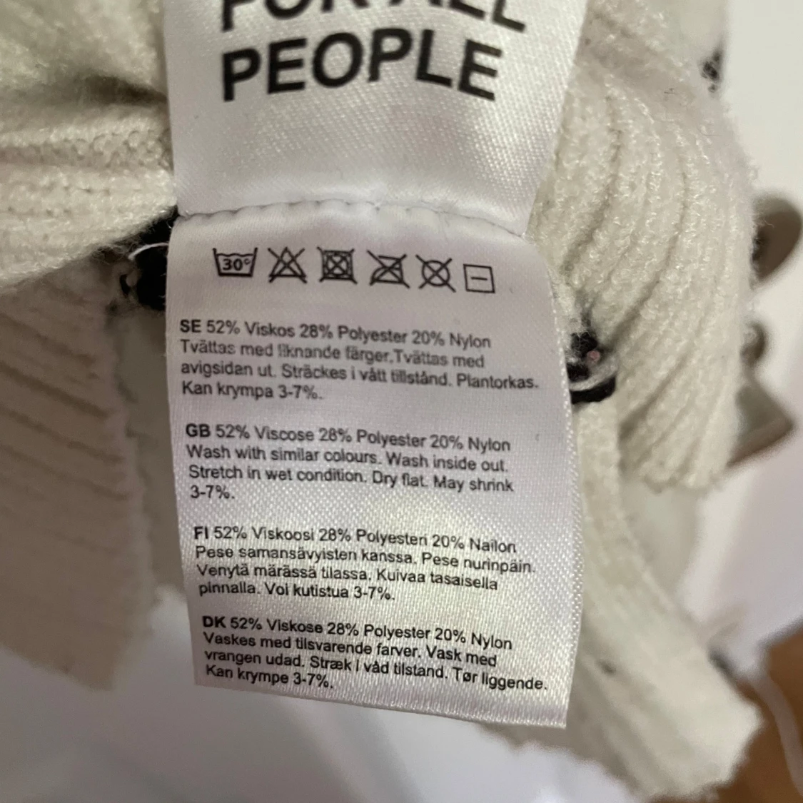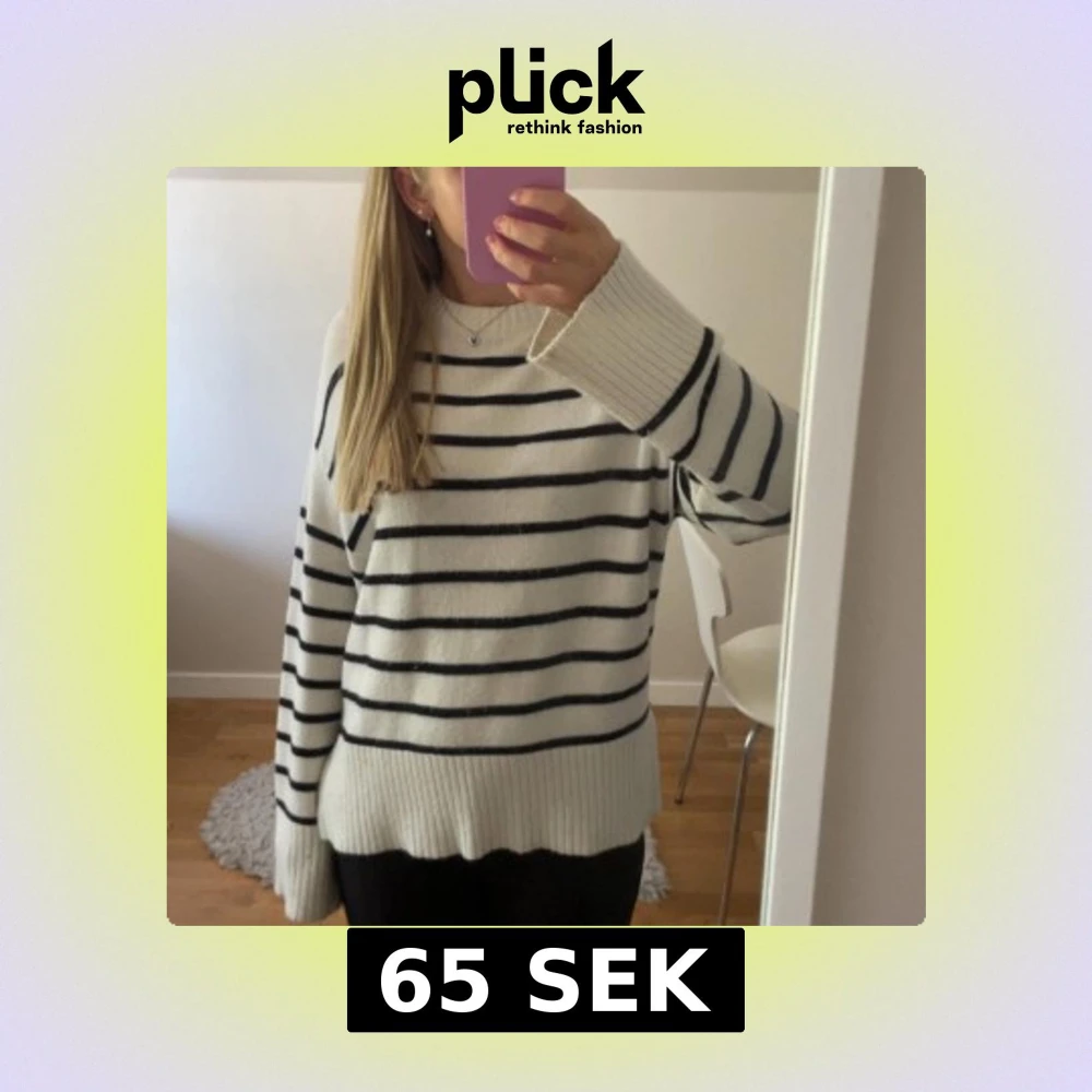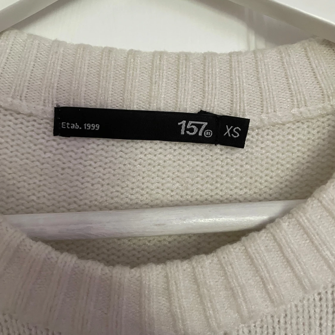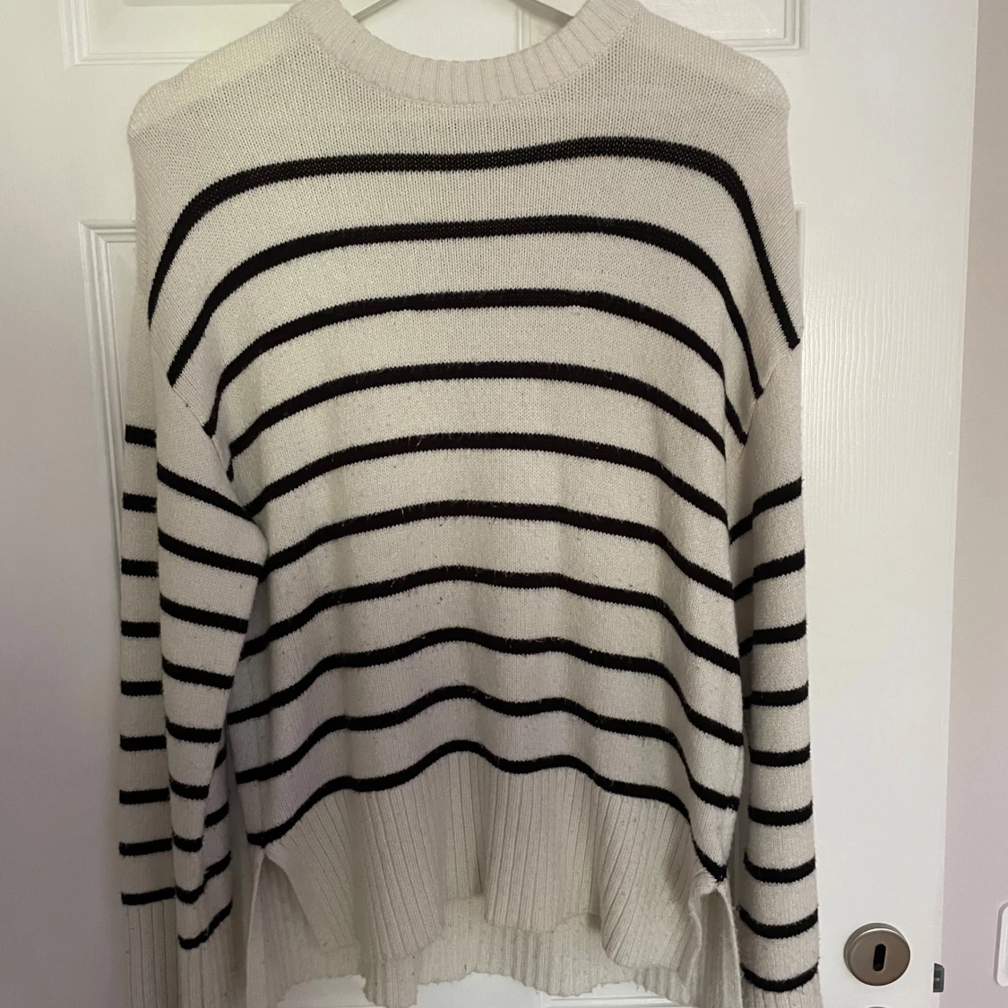 Säljer en vit stickad tröja med svarta horisontella ränder från 157. Tröjan har rund hals, långa ärmar och breda ribbade muddar vid ärmslut och nederkant. Materialet är en mjuk mix av viskos, polyester och nylon. Perfekt för dig som gillar chill och stilren look.