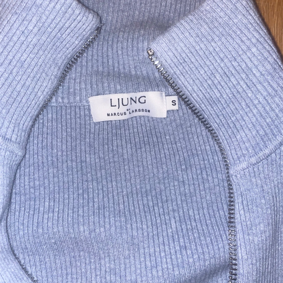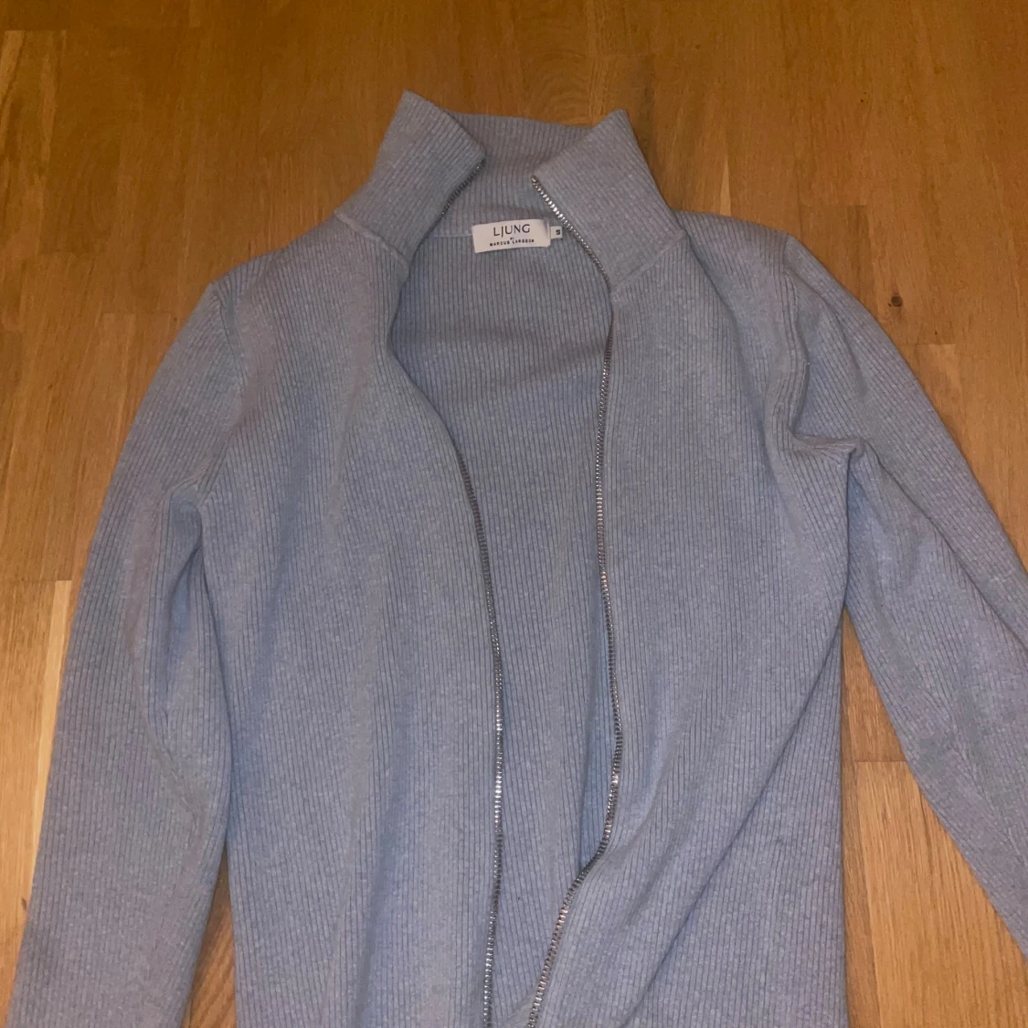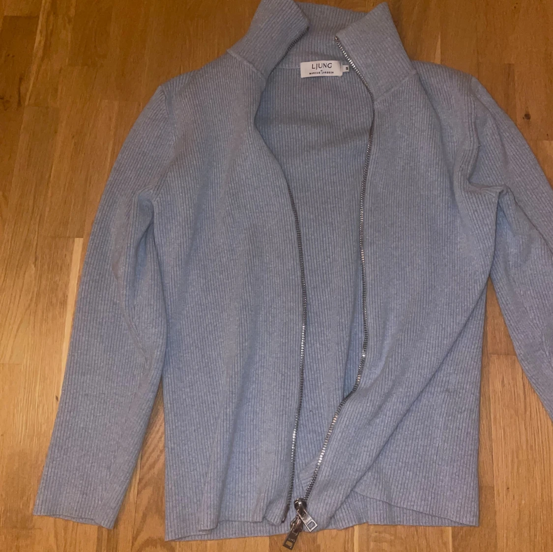 Säljer en ljusgrå ribbad kofta från Ljung by Marcus Larsson i storlek S. Koftan har dragkedja hela vägen, hög krage och är tillverkad i mjukt stickat material. Perfekt för lager-på-lager och chill vardagsstil.
