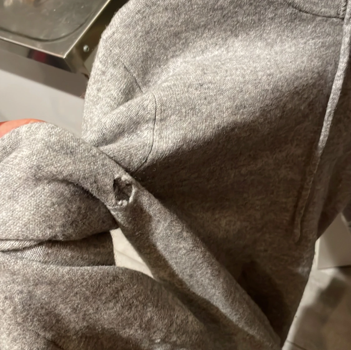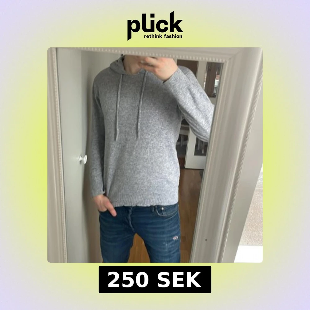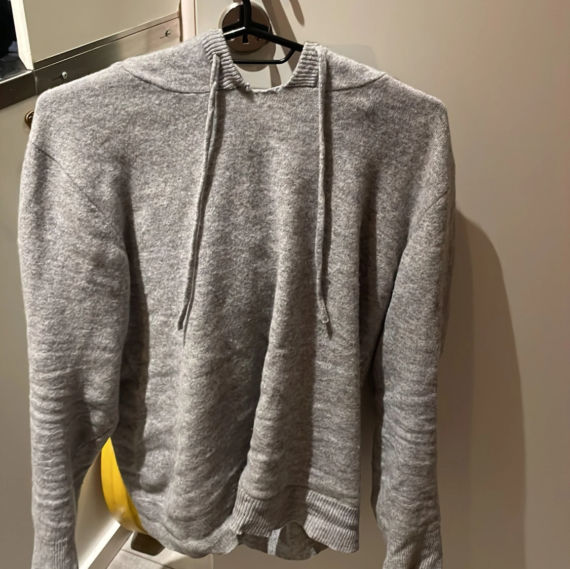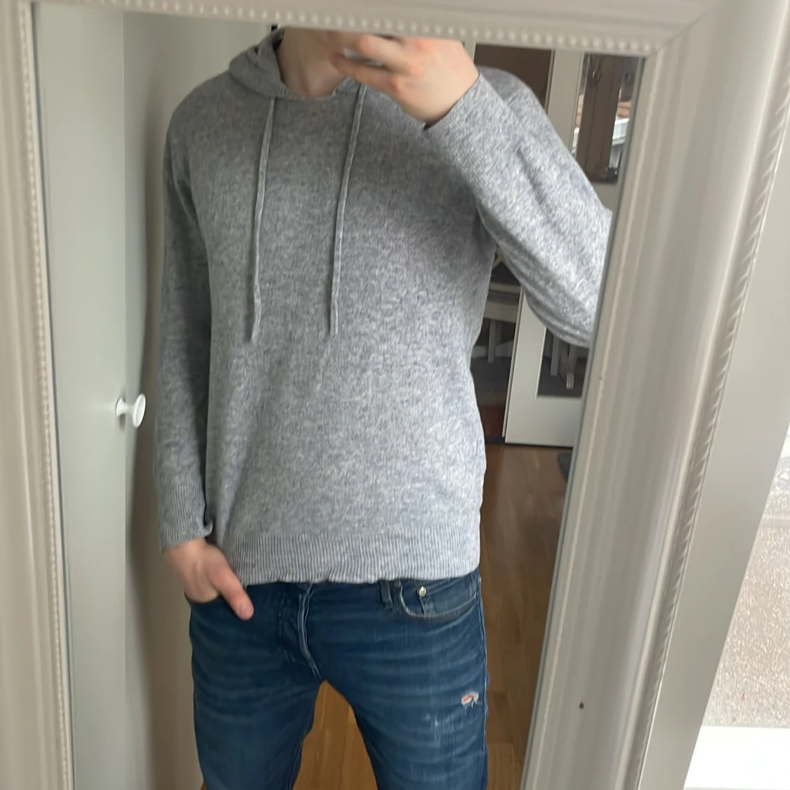 Säljer en stilren grå merinoull hoodie. Den har ett hål under armhålan men den kan lätt sys igen!