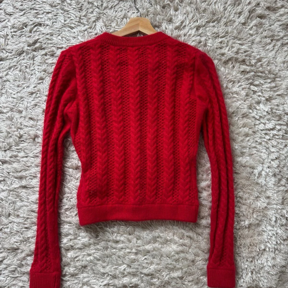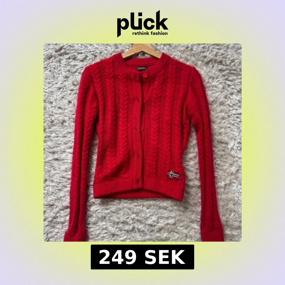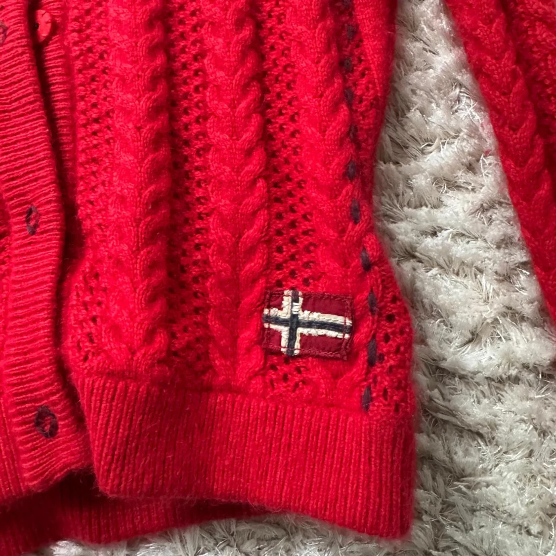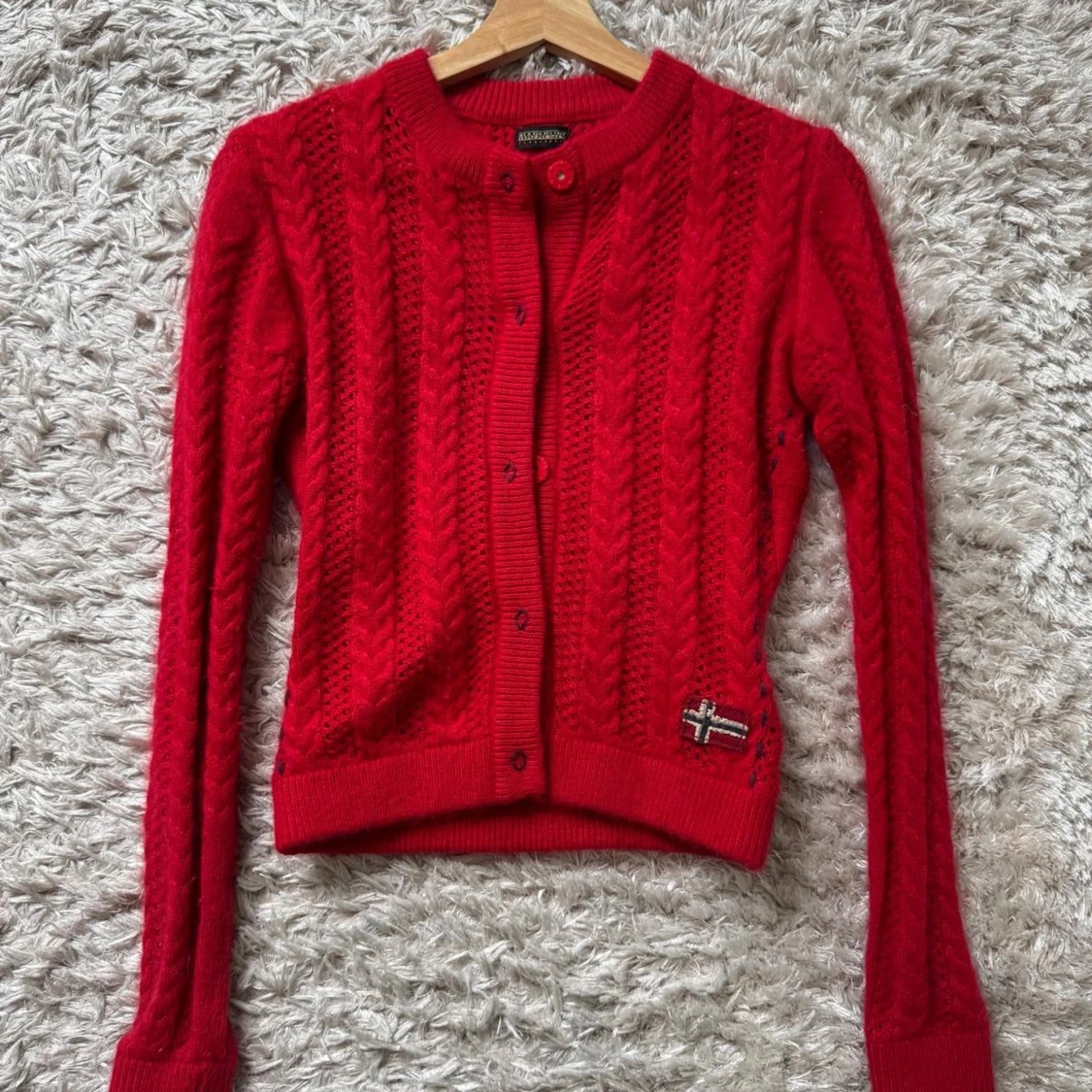 Riktigt snygg röd kofta från Napapijri med kabelstickat mönster och knappar framtill. Långärmad och med norsk flagga broderad nertill. Perfekt för dig som gillar klassisk stil med en twist. Materialet är mjukt och stickat, känns både varmt och trendigt.