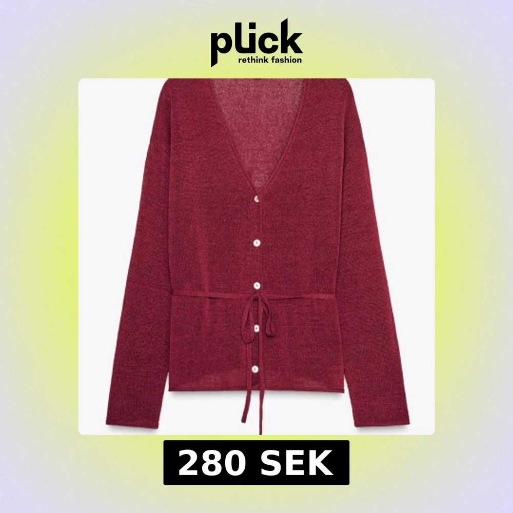 Snygg vinröd kofta med v-ringning, knappar framtill och knytband i midjan. Långärmad och i mjukt stickat material som ger en chill och stilren vibe. Perfekt att slänga över en topp eller klänning för en extra touch.