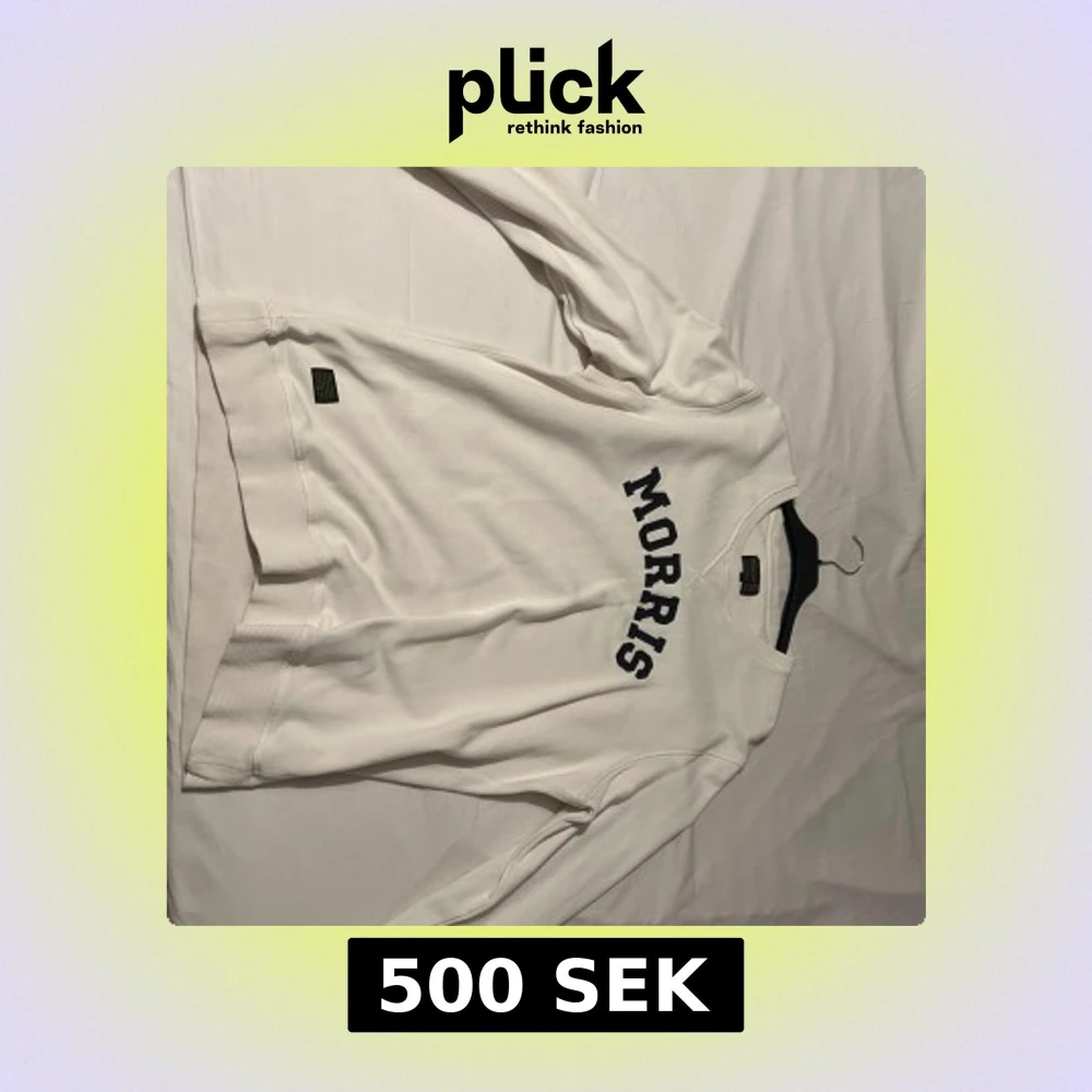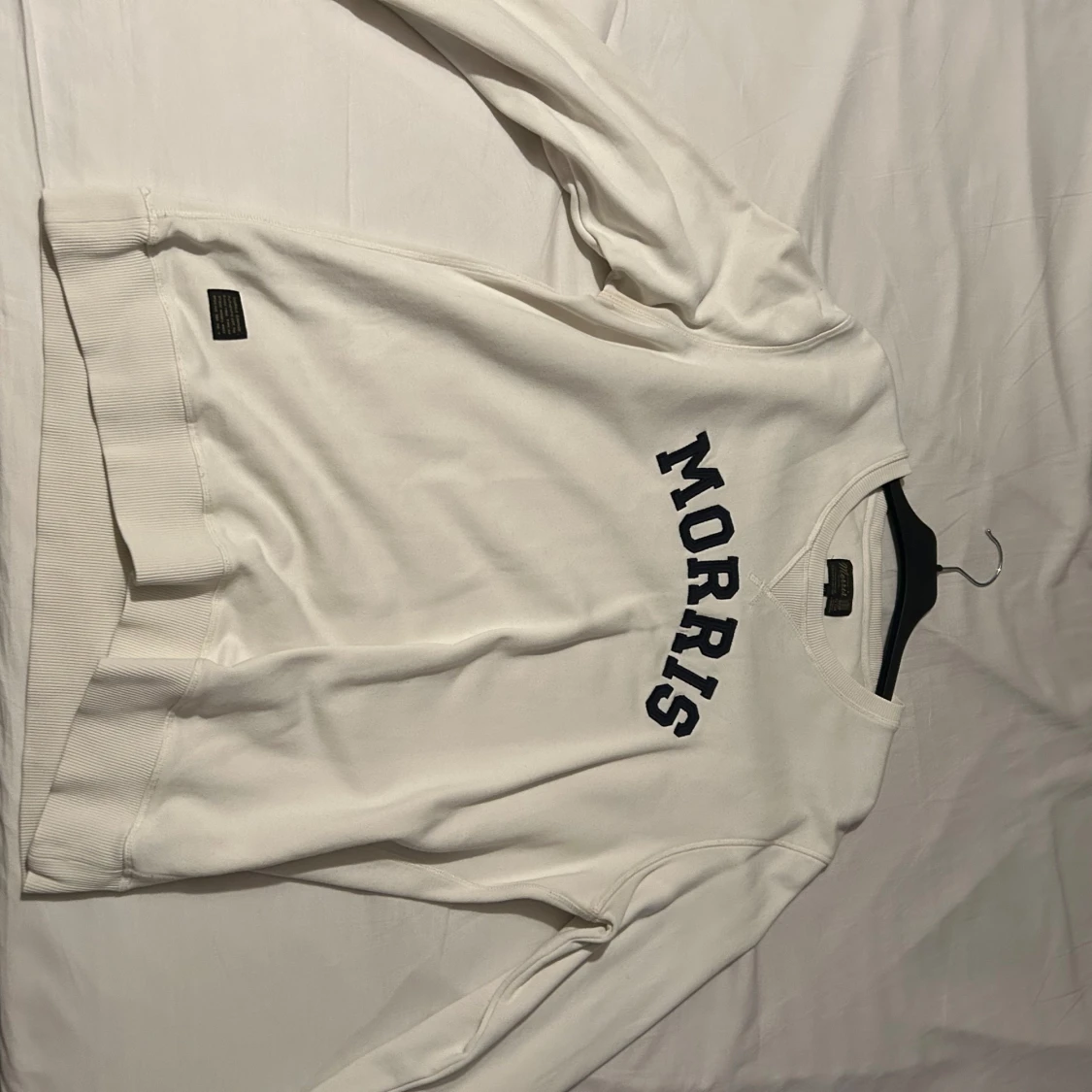 Säljer en stilren vit tröja från Morris med mörkblå text på bröstet. Tröjan har långa ärmar och en rund halsringning. Perfekt för en avslappnad look.