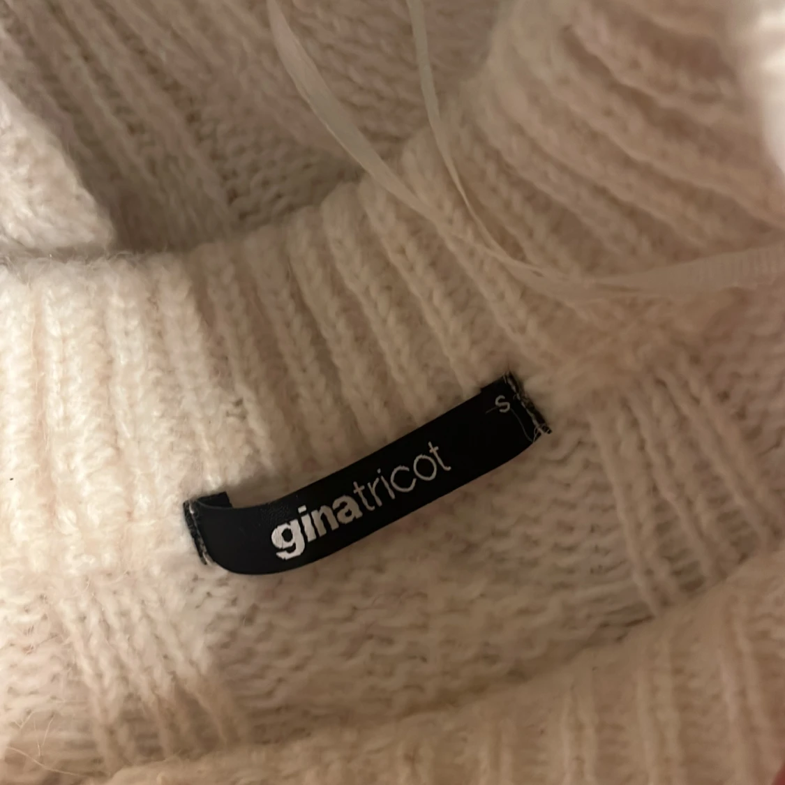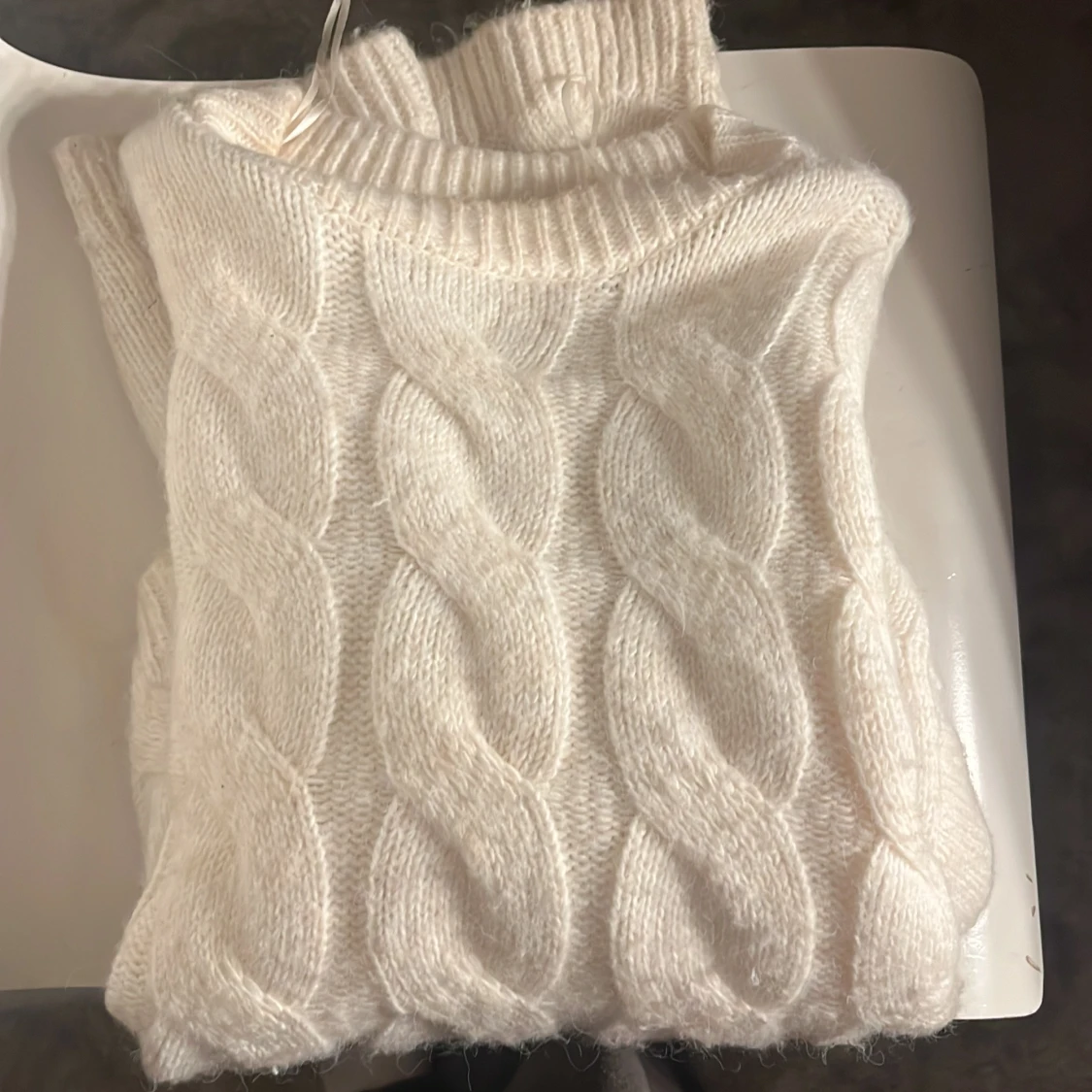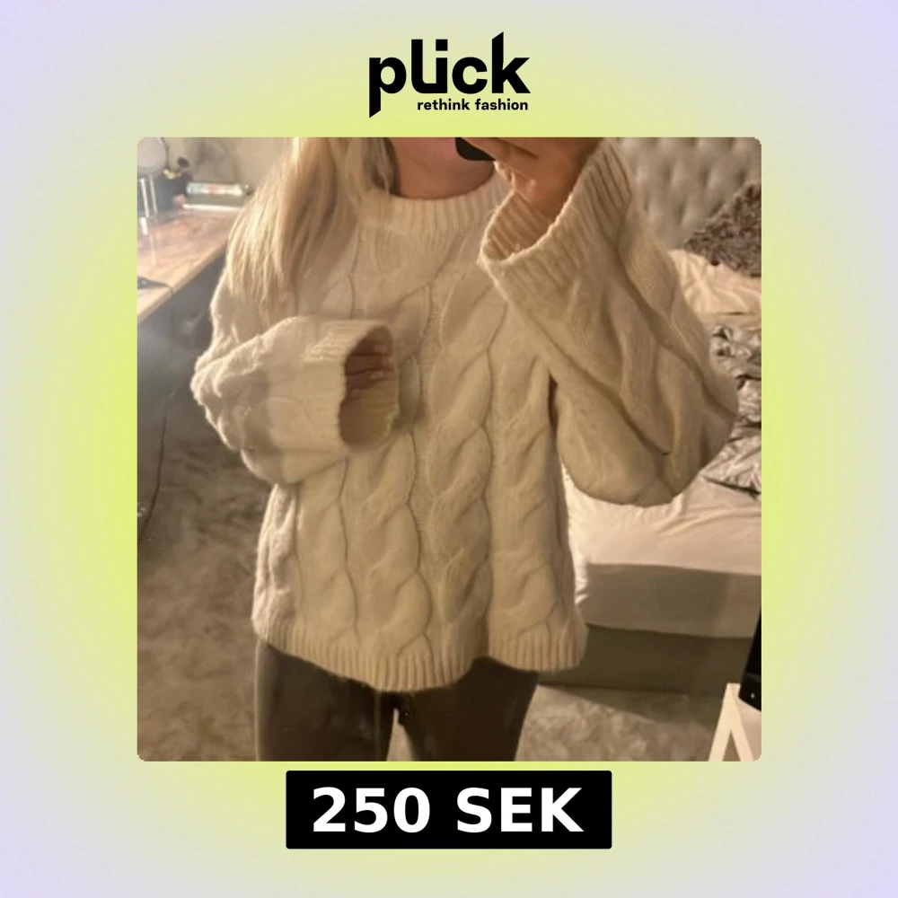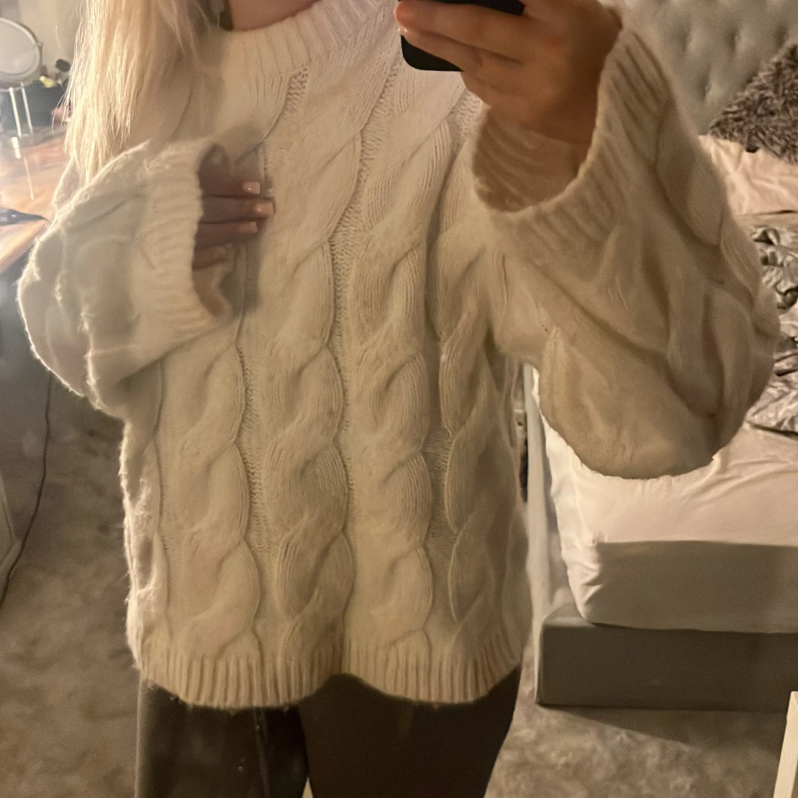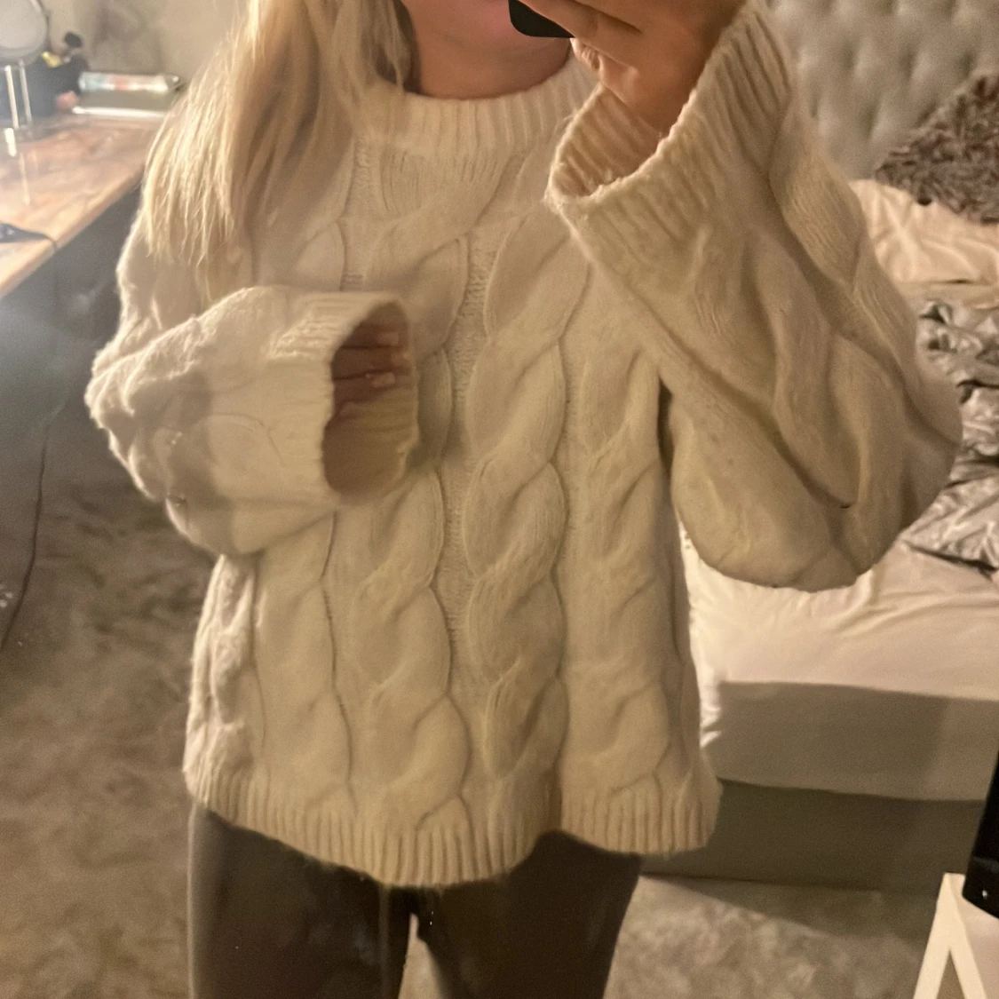 Mysig vit stickad tröja med ett klassiskt flätmönster. Perfekt för kyliga dagar med sin varma och bekväma design. Tröjan har långa ärmar och en rund halsringning.