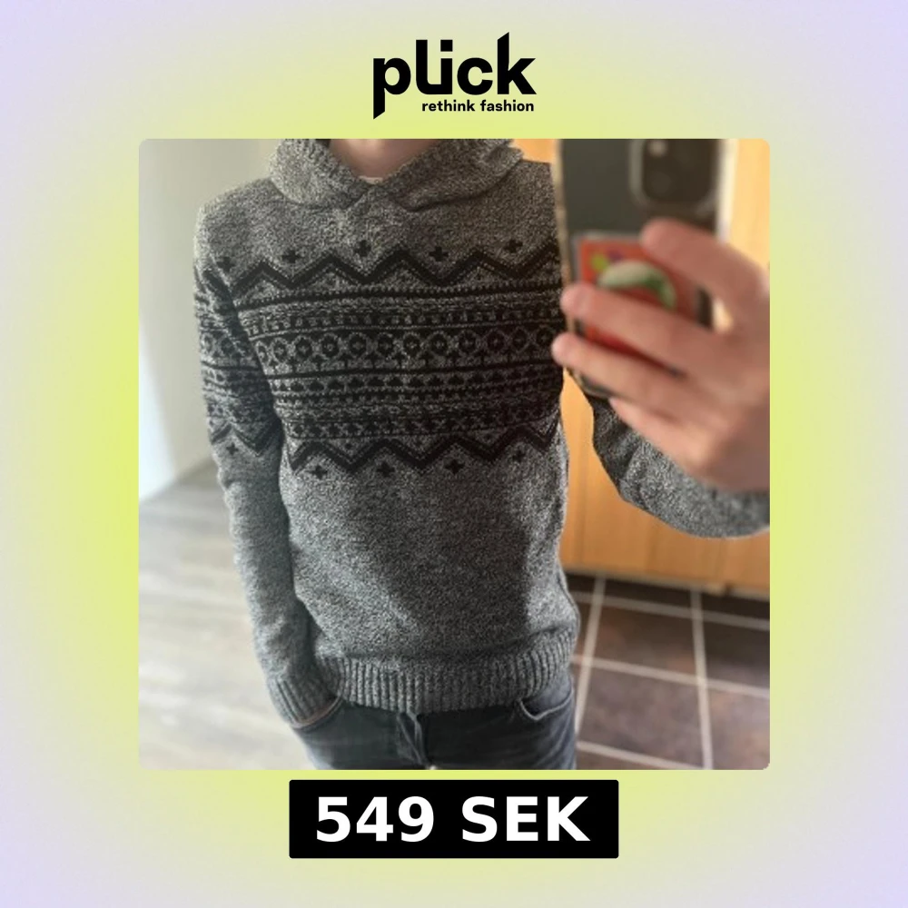 Säljer en grå stickad hoodie med svart mönster över bröstet och armarna. Tröjan har huva, långa ärmar och ribbade muddar vid ärmslut och nederkant. Perfekt för kalla dagar och riktigt snygg till jeans. Passar S