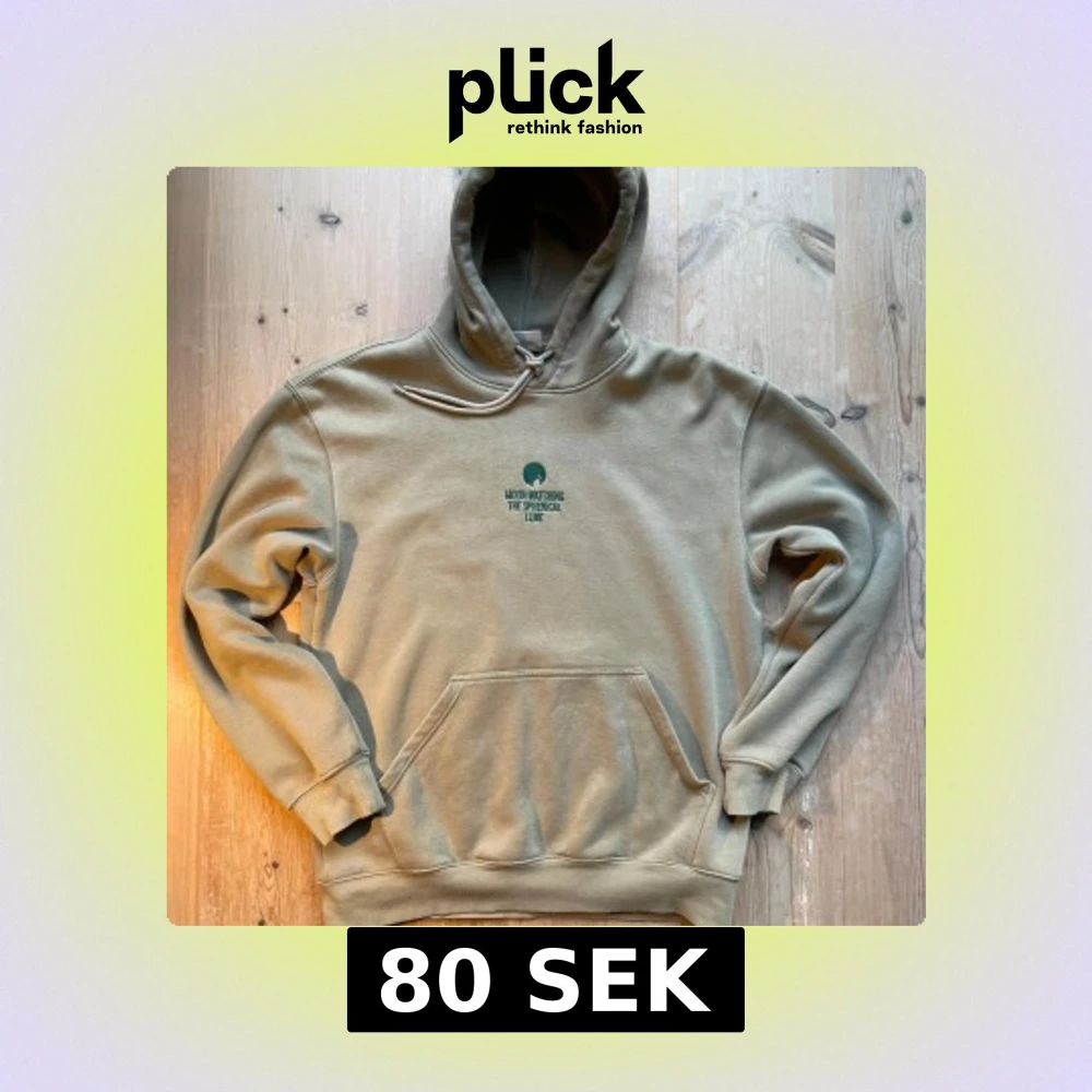 Säljer en grön hoodie från H&M med avslappnad passform. Tröjan har huva med snörning, magficka och broderad text 'Moon Watching The Spherical Lune' i mörkare grönt på bröstet. Skriv vid intresse!