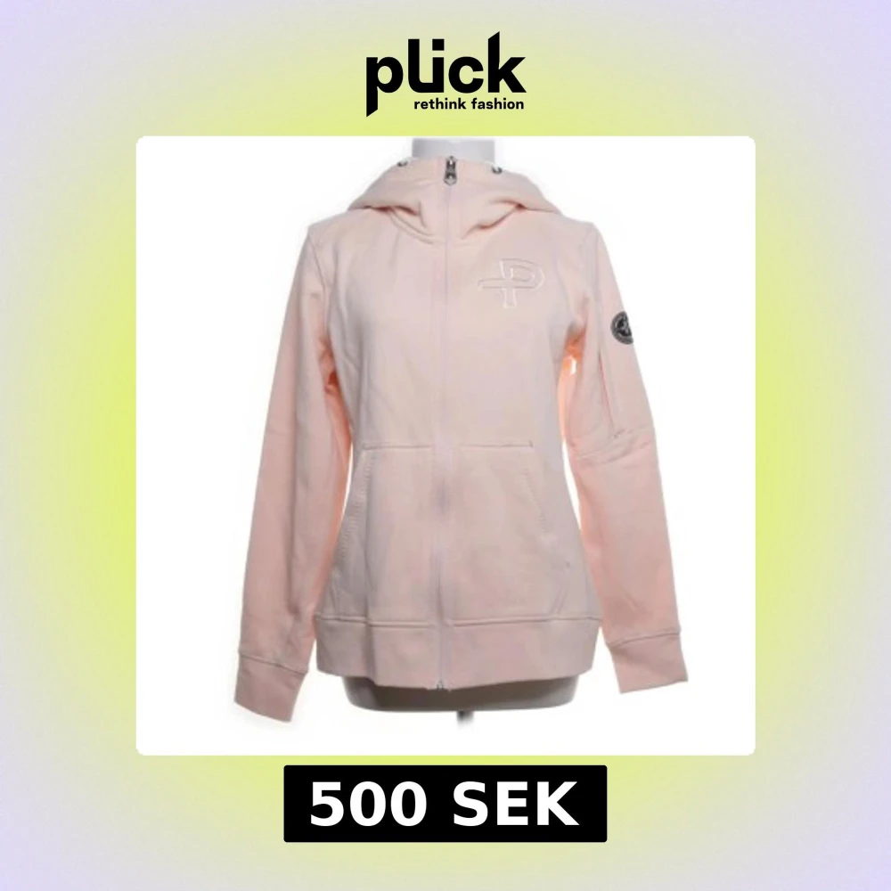 Säljer en ljusrosa hoodie från Pelle P med dragkedja och känguruficka. Den har en broderad logga på bröstet och en rund patch på ärmen.