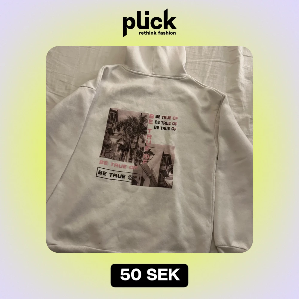 Säljer en vit hoodie med ett coolt tryck på baksidan. Trycket har en bild av palmer och texten 'BE TRUE'. Perfekt för en avslappnad stil och passar till alla årstider. Den har en klassisk känguruficka och en bekväm huva. Ganska tunn hoodie så inte så himla varm, passar nog bäst på sommaren när man är lite kylig💕