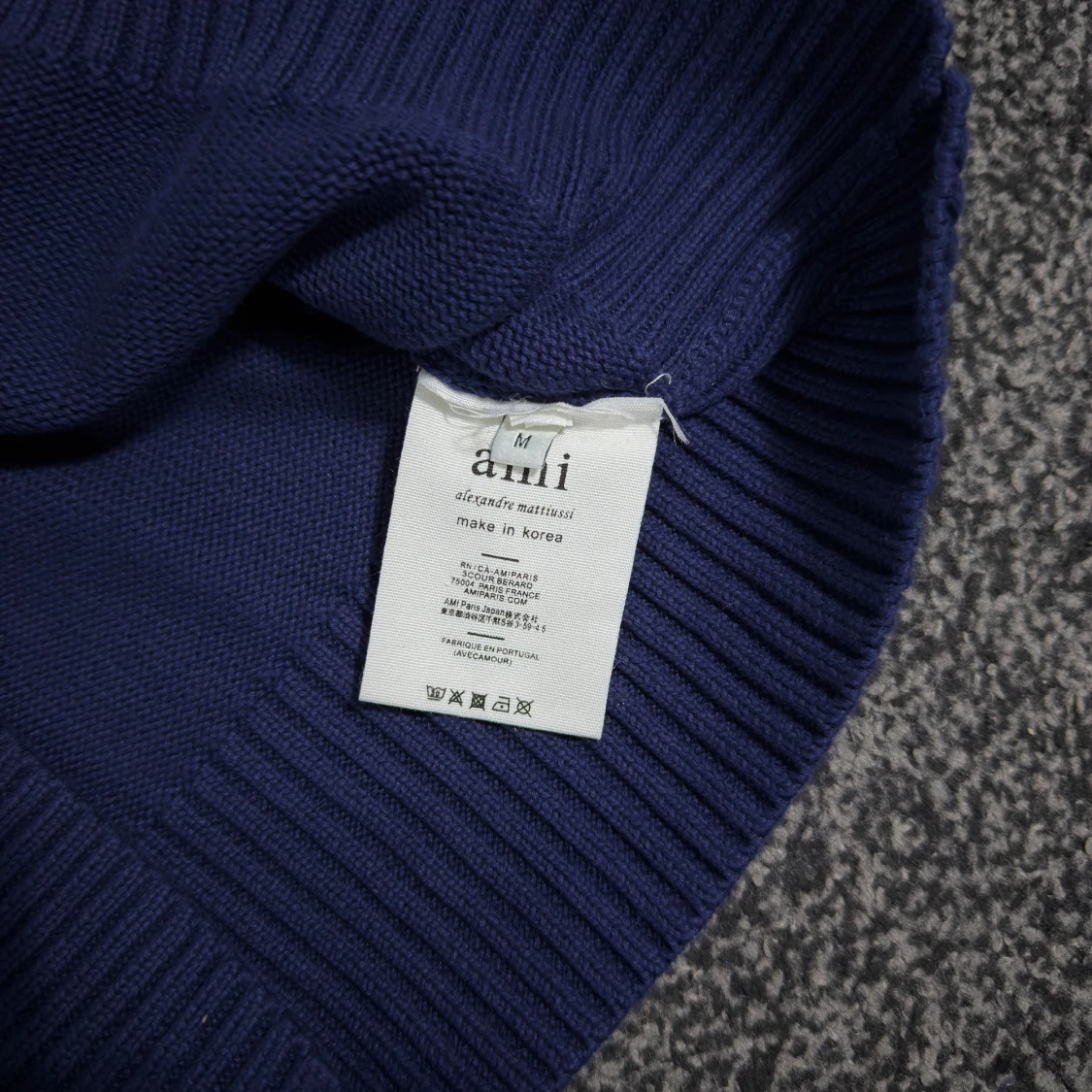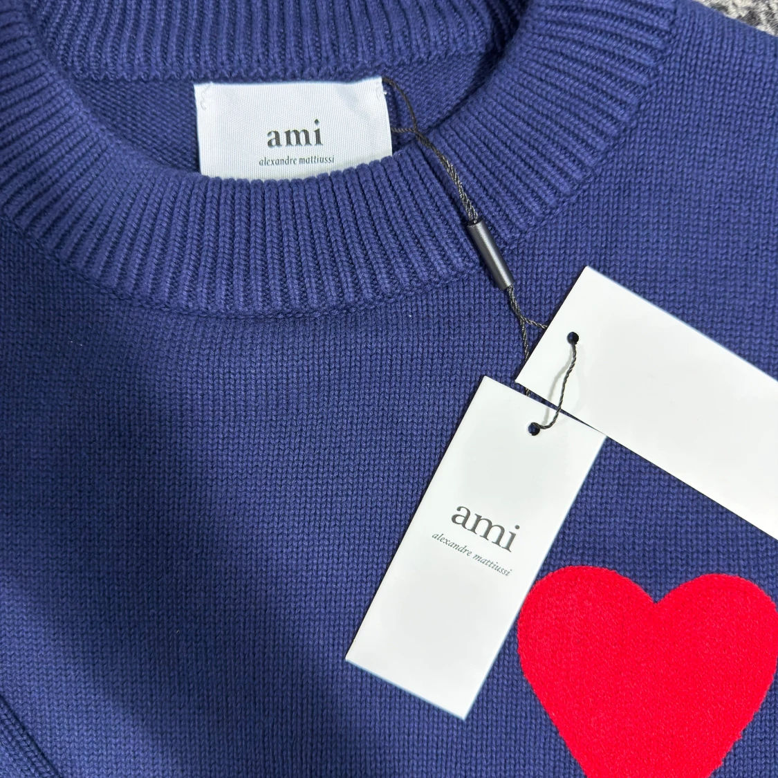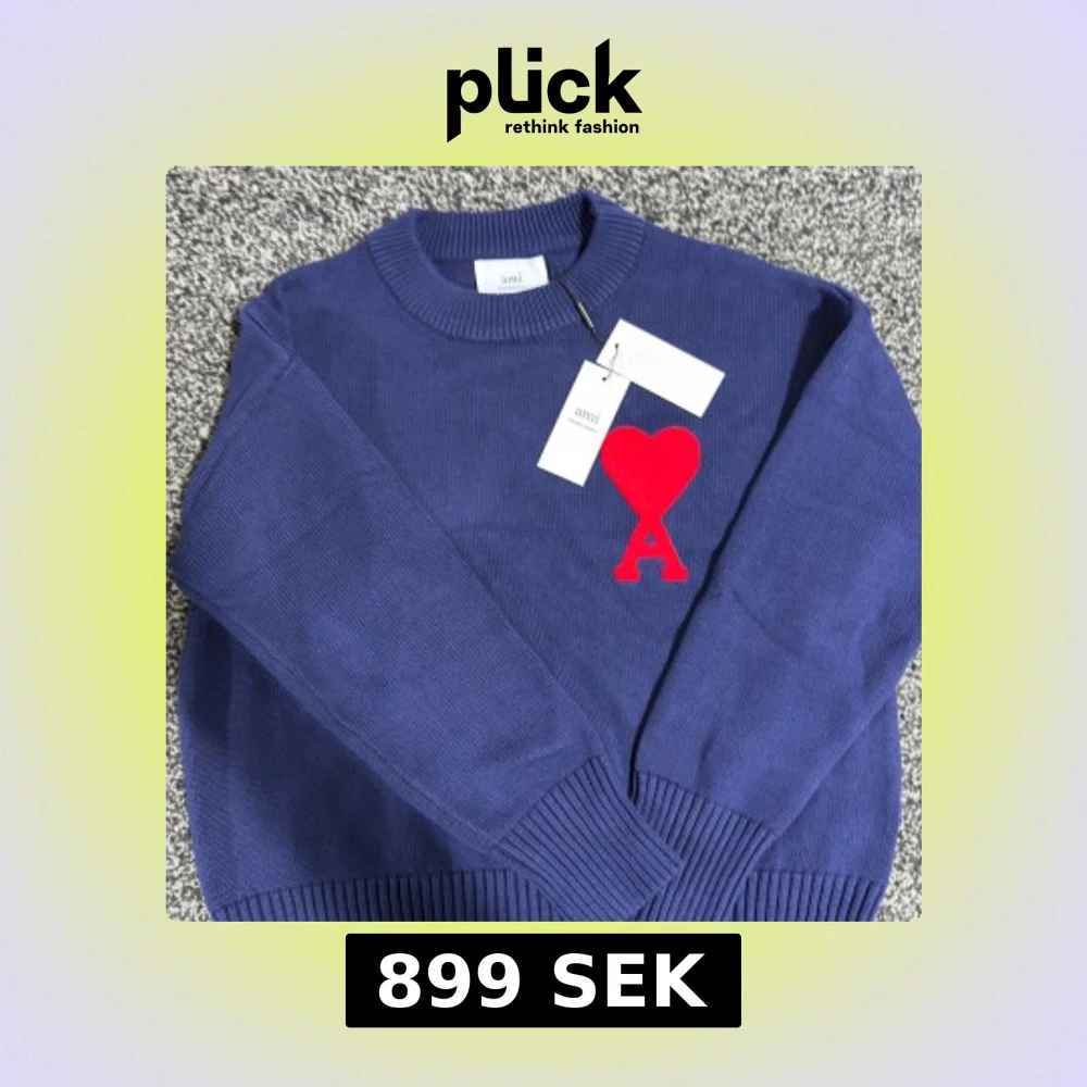 Säljer en blå stickad tröja från Ami med rund halsringning och ett stort rött hjärta med bokstaven A broderat på bröstet. Tröjan har långa ärmar och ribbade muddar vid ärmslut och nederkant. Perfekt för dig som vill ha något stilrent men ändå unikt.