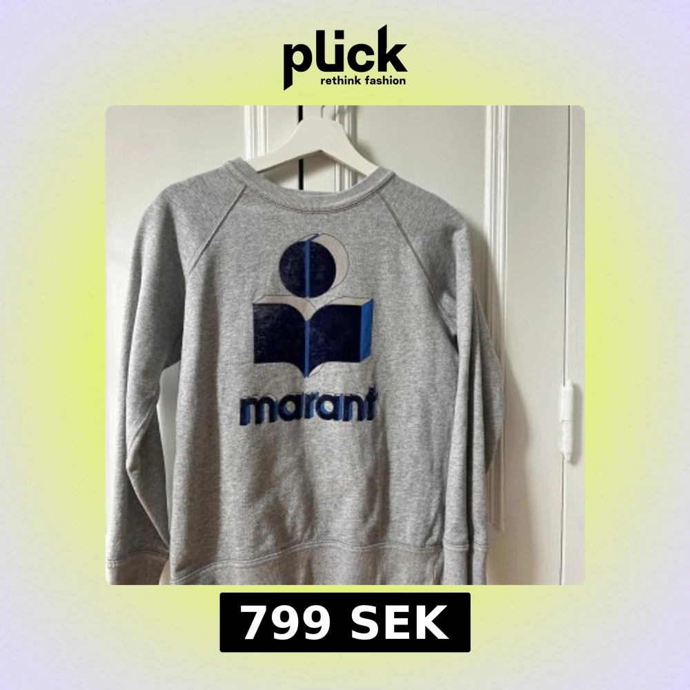 Säljer en grå sweatshirt från Isabel Marant med ett stort tryck i blått och vitt på ryggen. Tröjan har långa ärmar och ribbade muddar vid ärmslut och nederkant. Perfekt för en avslappnad stil.