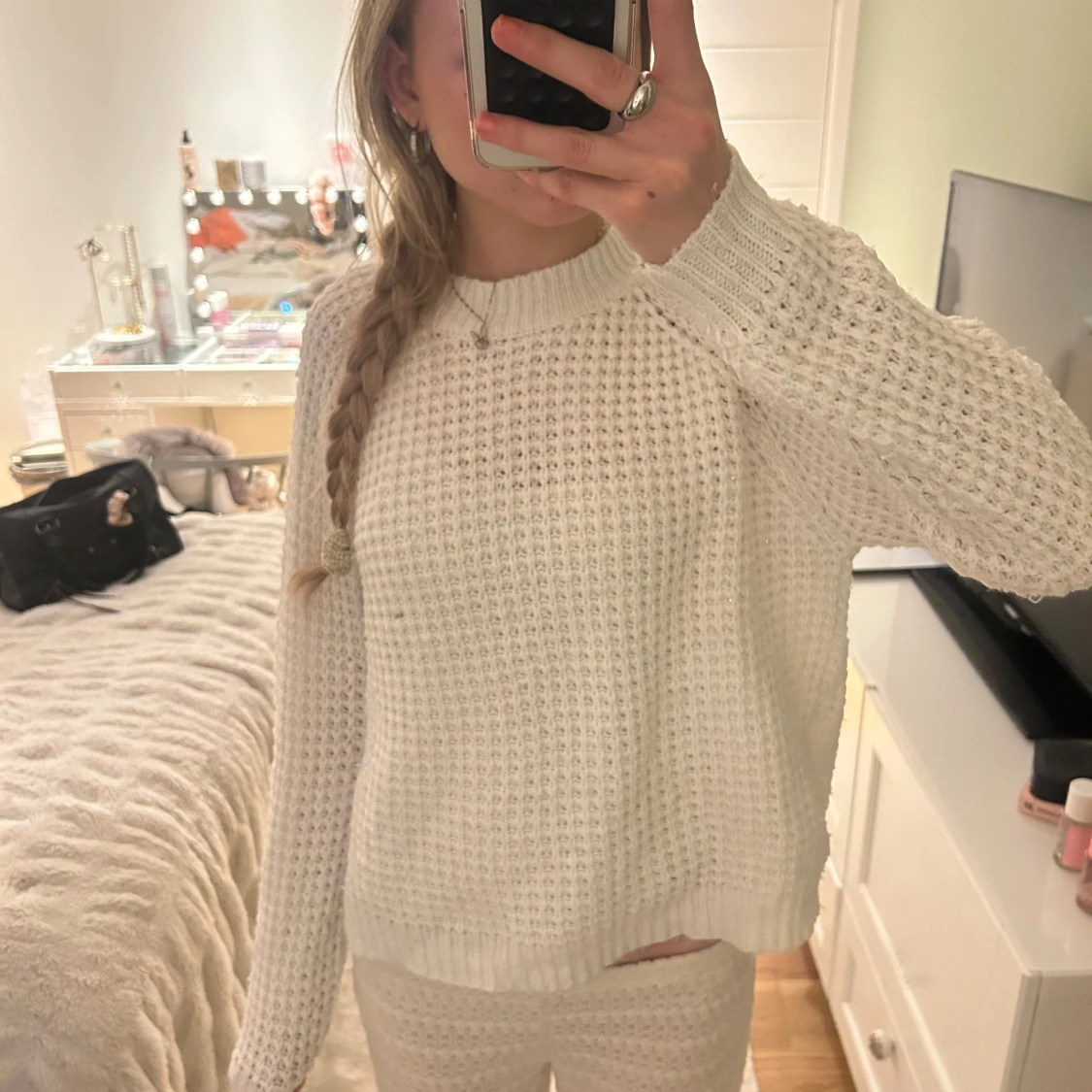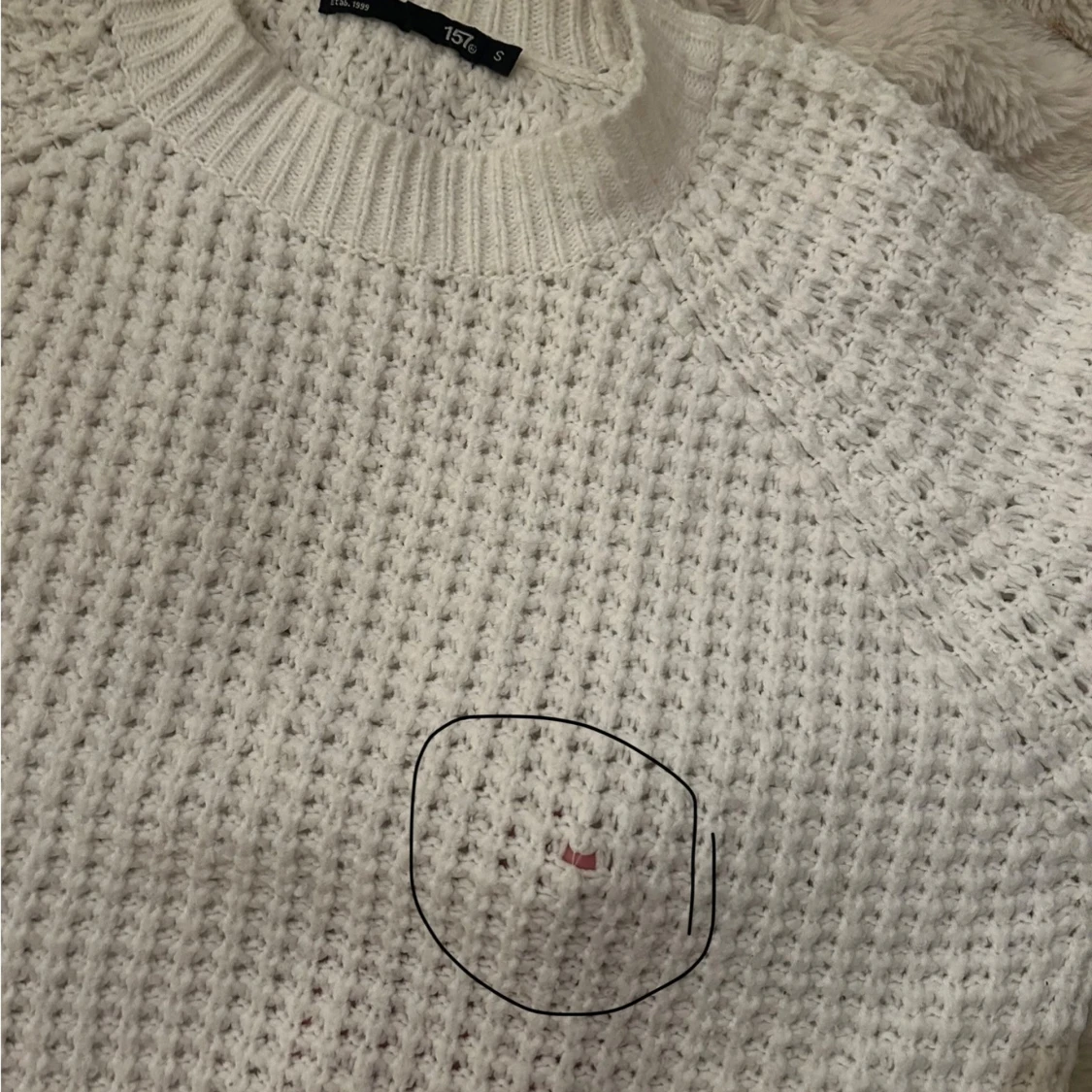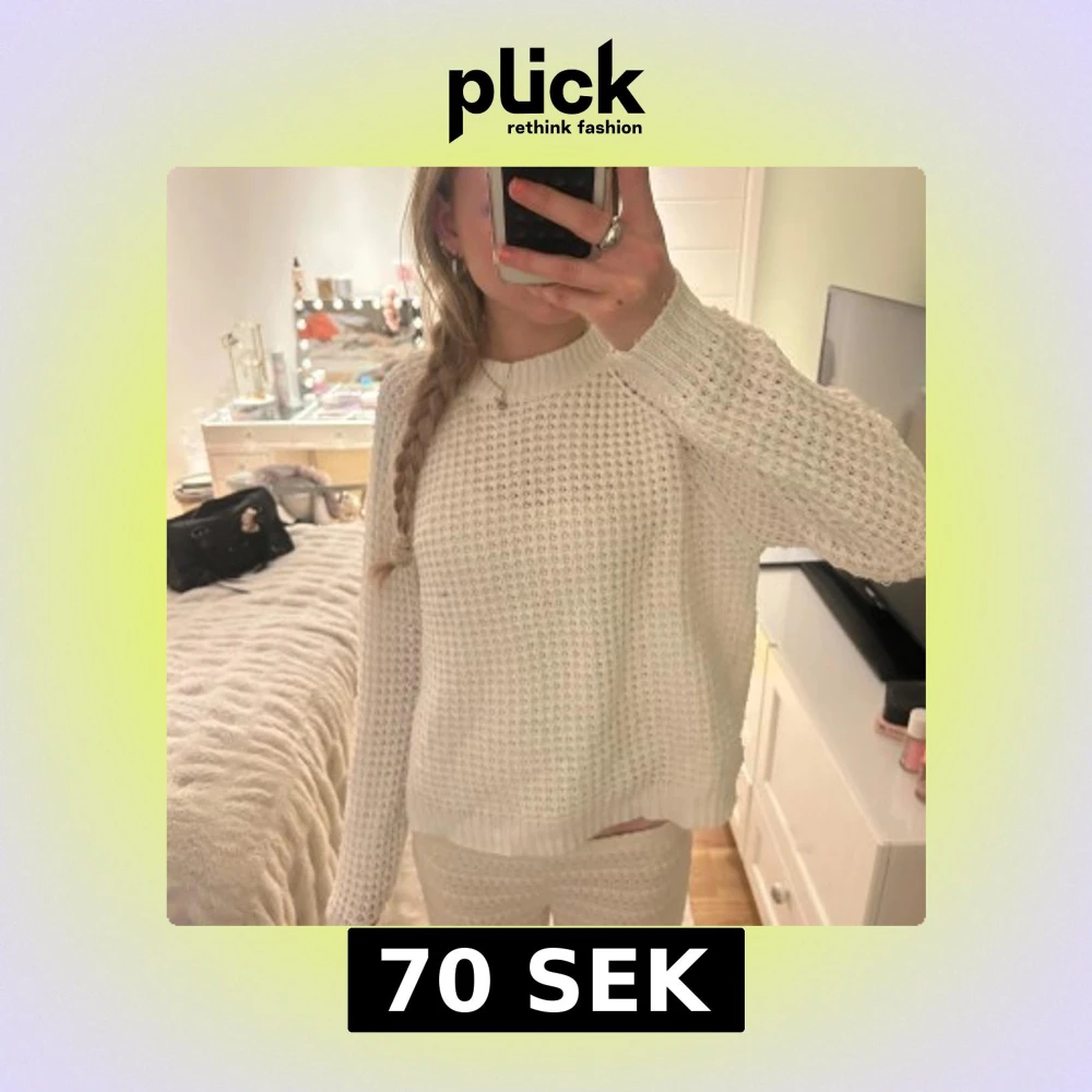 Mysig vit stickad tröja från lager157 med grovstickat mönster och rund halsringning. Tröjan har långa ärmar och ribbade muddar vid hals, ärmslut och nederkant. Perfekt för kyligare dagar.tycörr lite trasig men inget som man lägger märke till eller något som kan förstöra hela tröjan