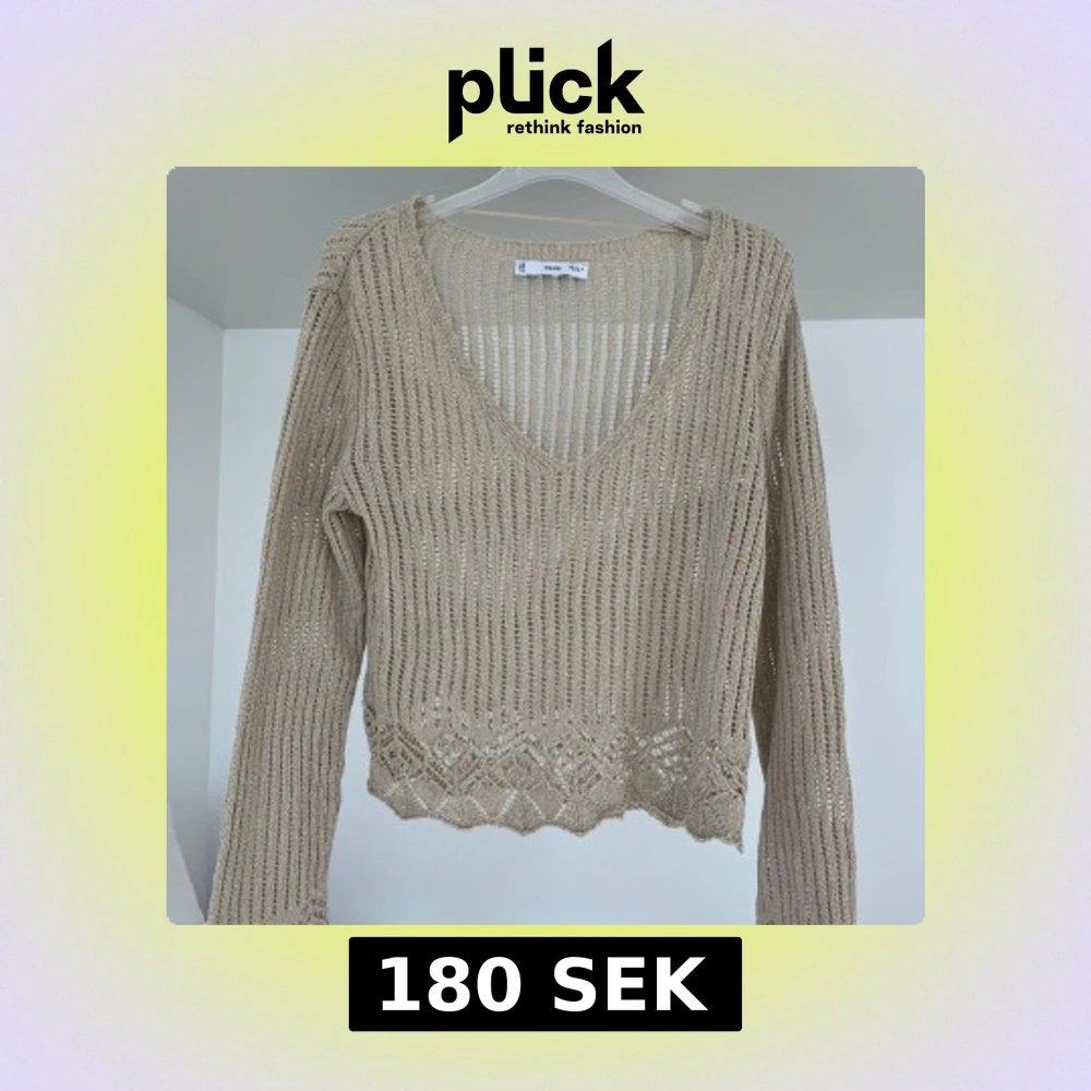 Säljer en glittrig guldig/beige stickad tröja från NA-KD med v-ringning och lång ärm. Tröjan har ett genombrutet mönster och dekorativ kant nertill. Perfekt för lager-på-lager och ger en chill vibe.