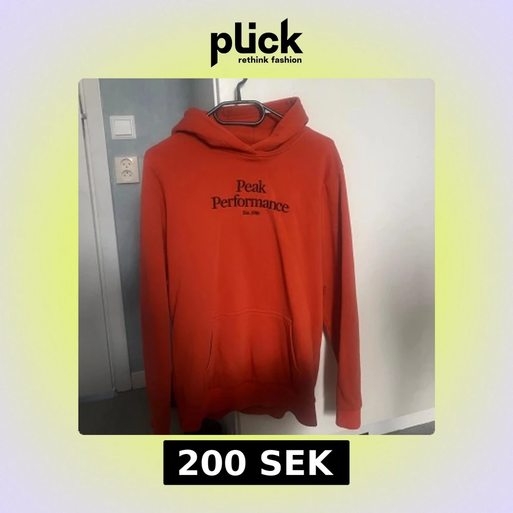 Säljer en orange hoodie från Peak Performance med svart logga tryckt på bröstet. Tröjan har huva och en stor magficka framtill. Perfekt för dig som gillar en enkel och stilren look.
