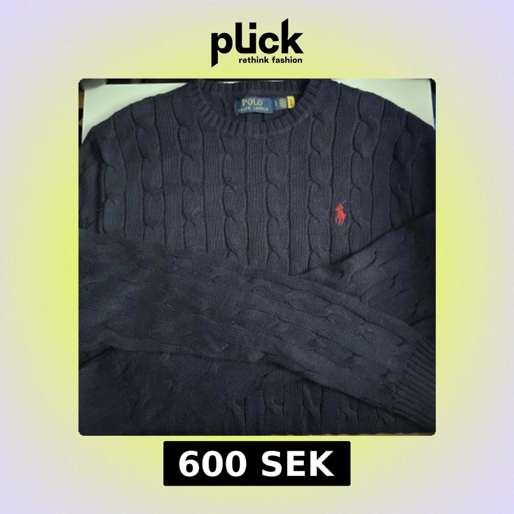 Lite smutsig för den har bara legat i garderoben, Kabelstickad mörkblå tröja från Polo Ralph Lauren med klassisk röd broderad logga på bröstet. Tröjan har rund halsringning och långa ärmar, perfekt för lager-på-lager-stil. Materialet är mjukt och skönt stickat. Skriv om du är intresserad eller vill ha mer bilder