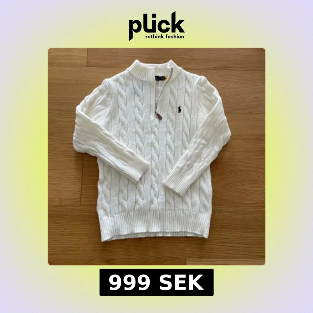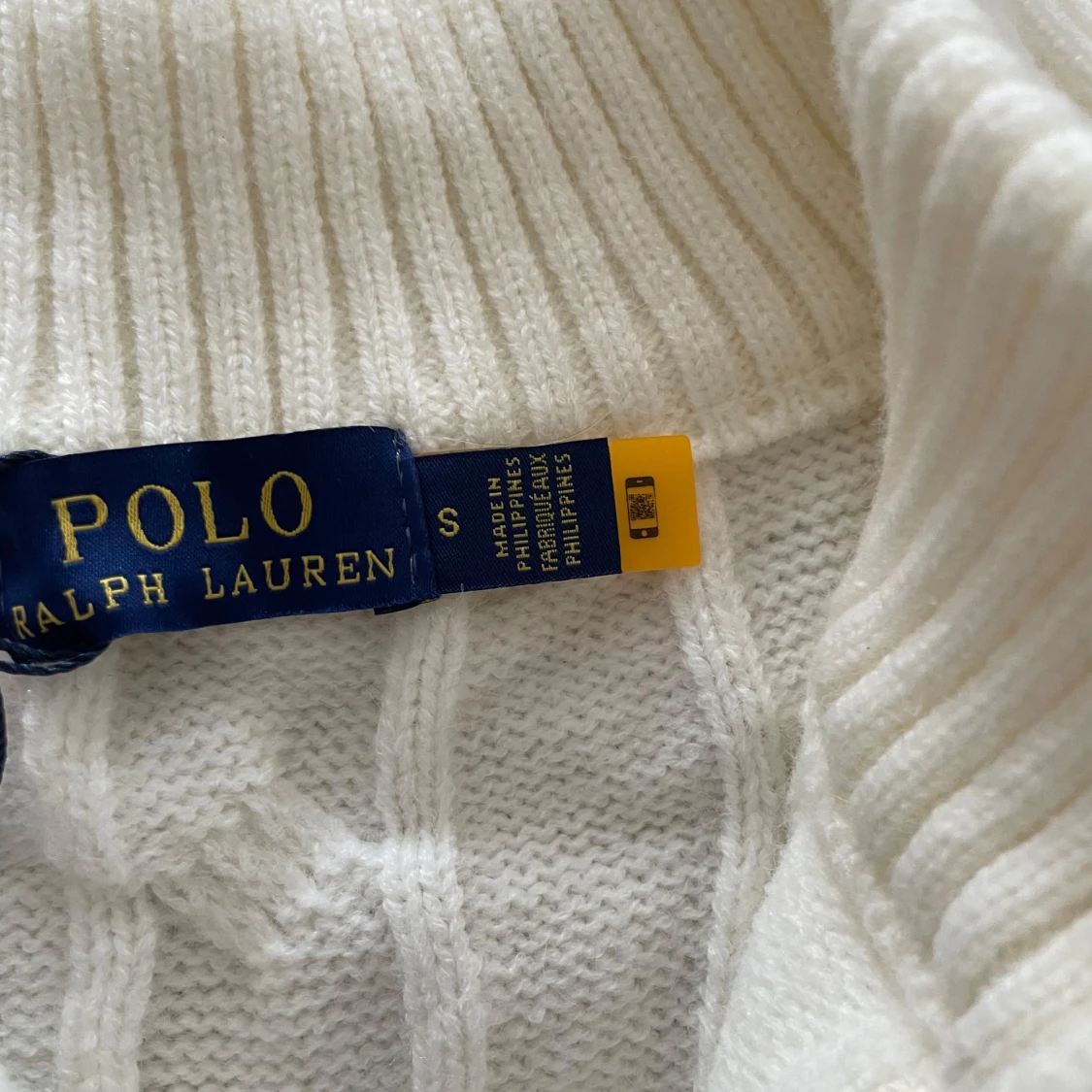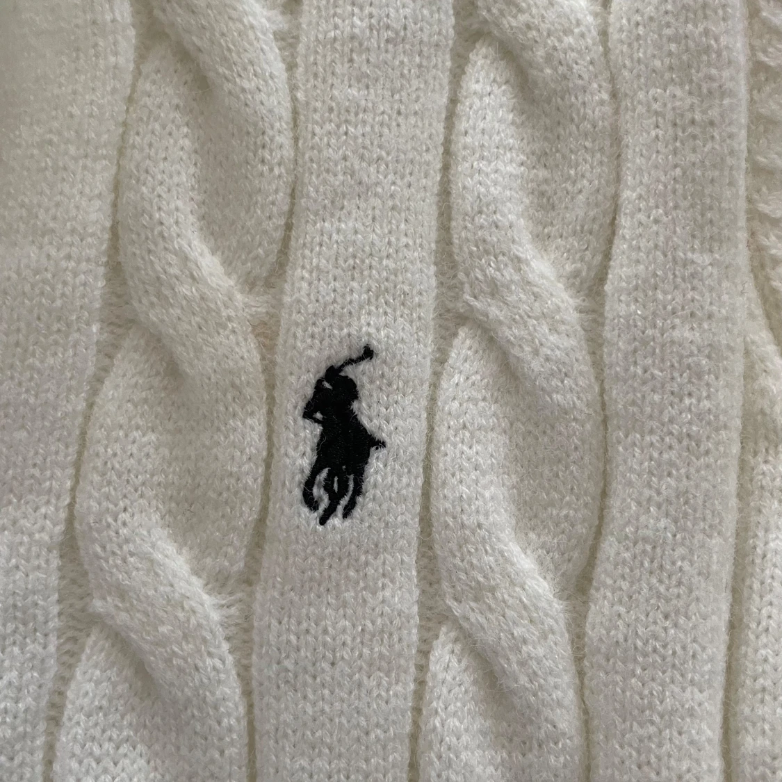 Vit kabelstickad tröja från Polo Ralph Lauren med halv dragkedja och broderad logga på bröstet. Tröjan har lång ärm, ribbade muddar och hög krage. Perfekt för lager-på-lager och klassisk stil.