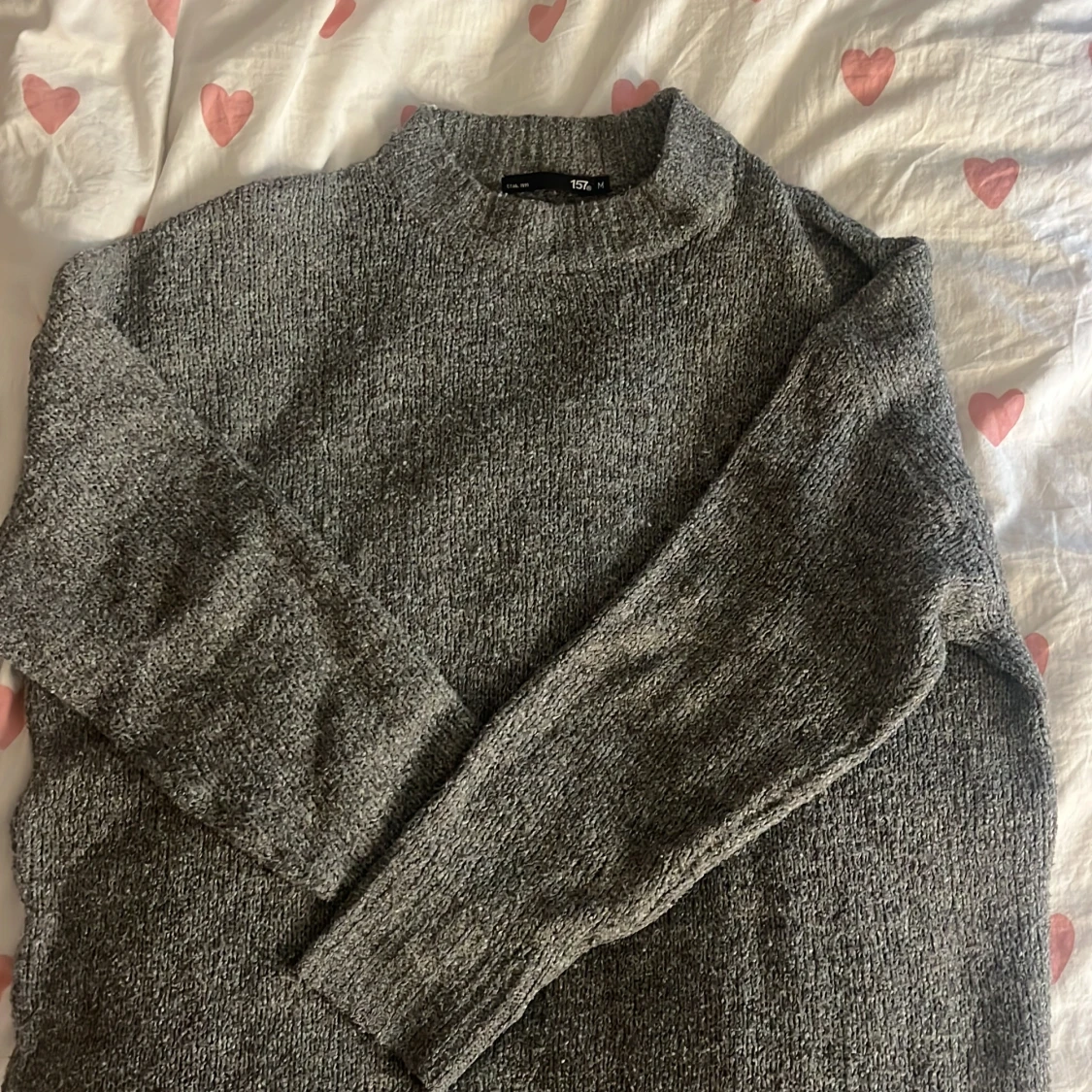 Mysig grå stickad tröja från 157 i storlek M. Tröjan har en klassisk rund halsringning och långa ärmar. Perfekt för lager-på-lager och chill dagar. Enkel att matcha med jeans eller kjol för en avslappnad look. Bra skick något nopprig men inget som märks!
