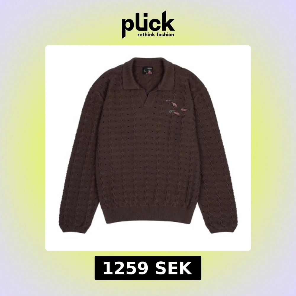 Brun stickad pikétröja från Derschutze med broderad fiskare och fiskar på ryggen samt små broderier framtill. Tröjan har krage, v-ringning och lång ärm. Helt ny testat 1 gång.