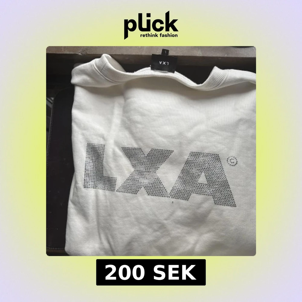 Säljer en vit sweatshirt från LXA med stor logga framtill i strass. Tröjan har rund halsringning och långa ärmar. Perfekt för en stilren och trendig look.( Tvättad en gång. En pytteliten svart fläck på ryggen och några typ 10 små stenar som trillat av. Annars är den verkligen i nyskick). Skriv för bilder.