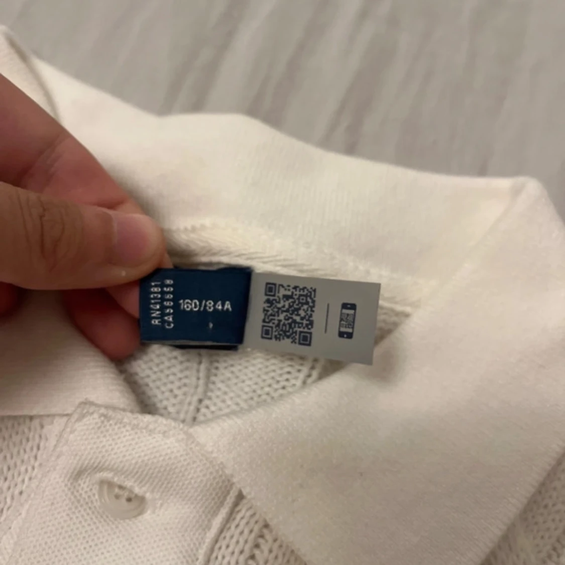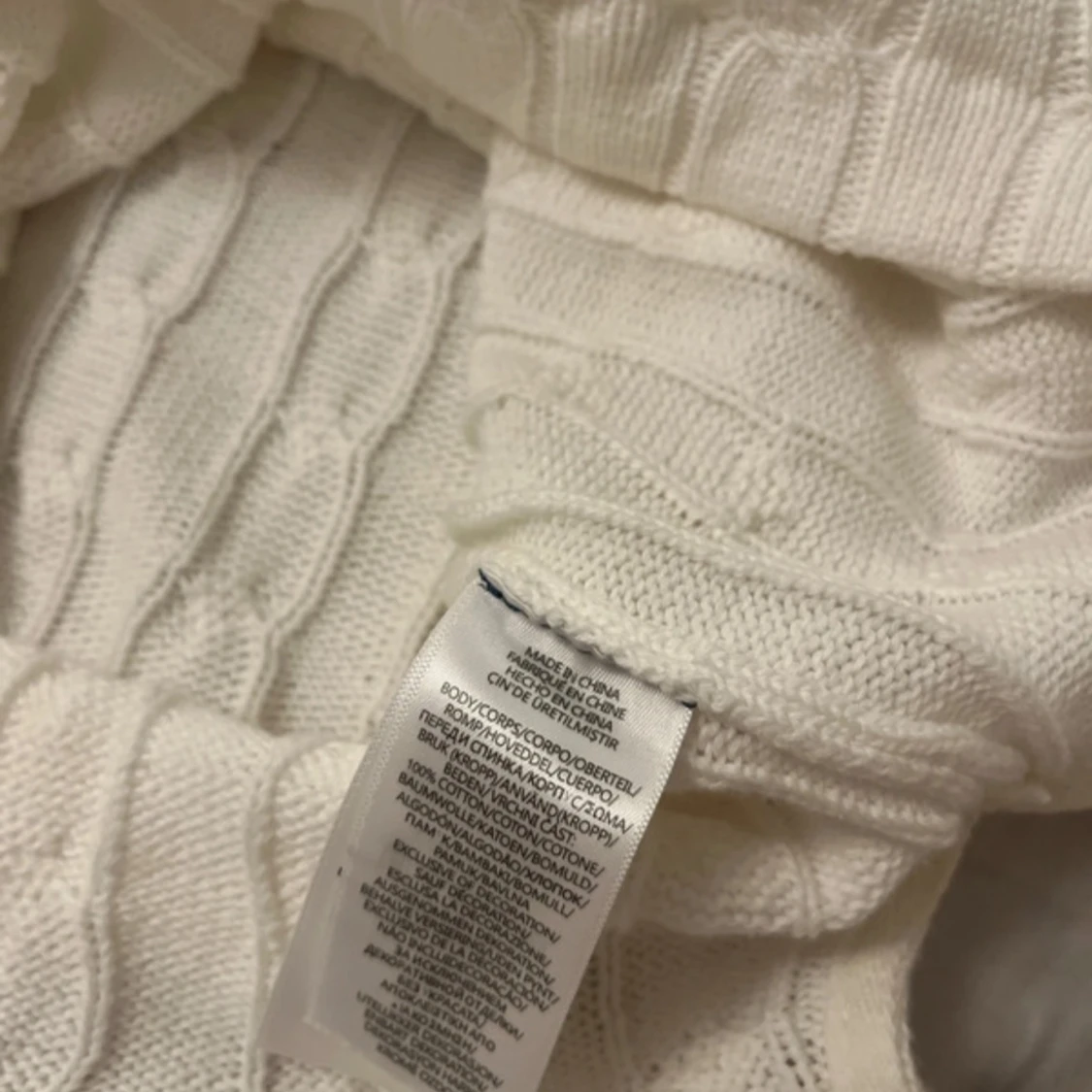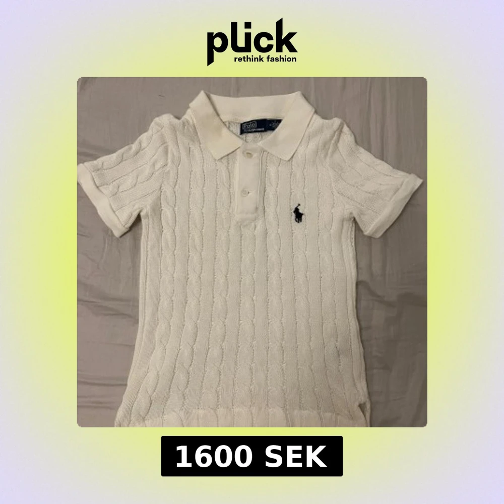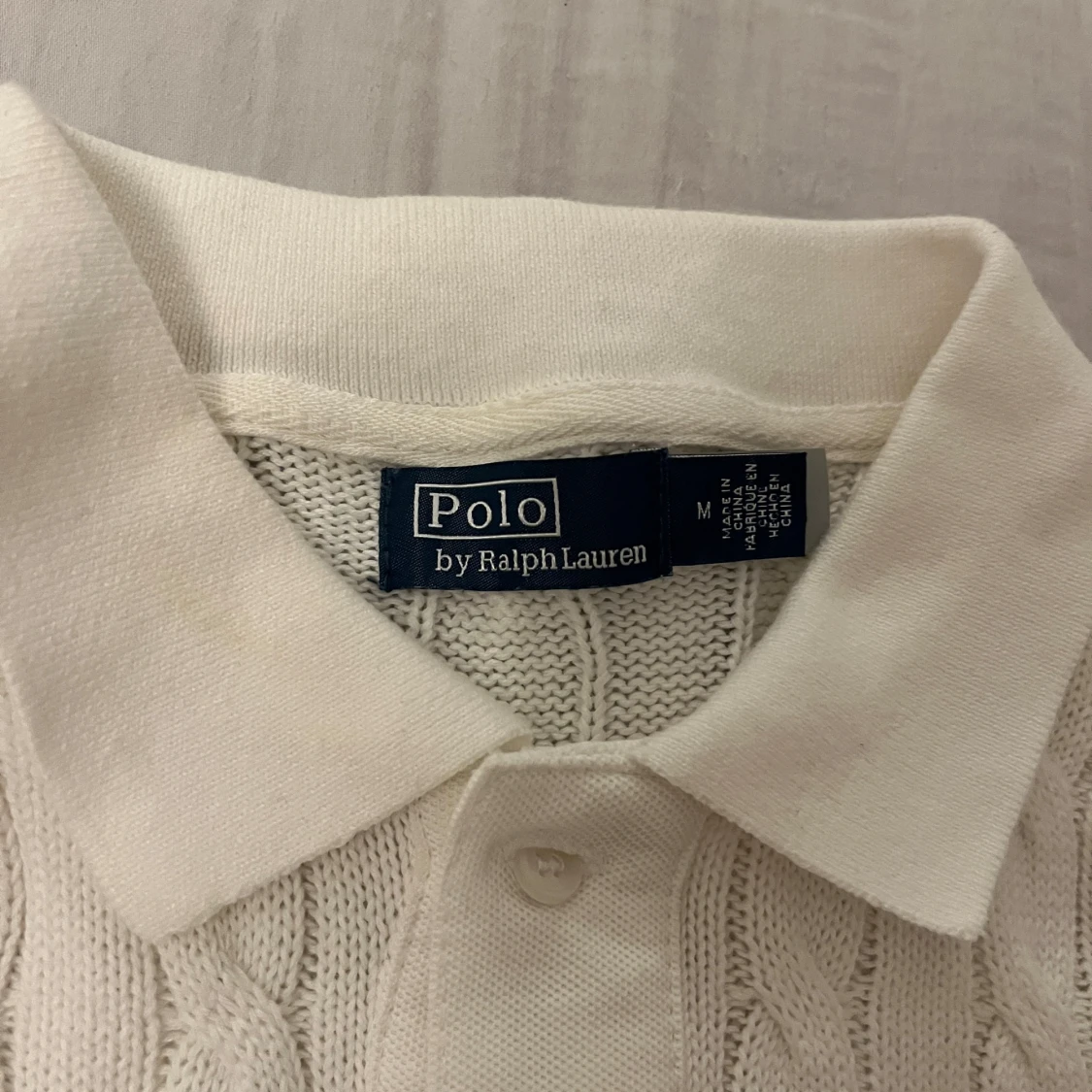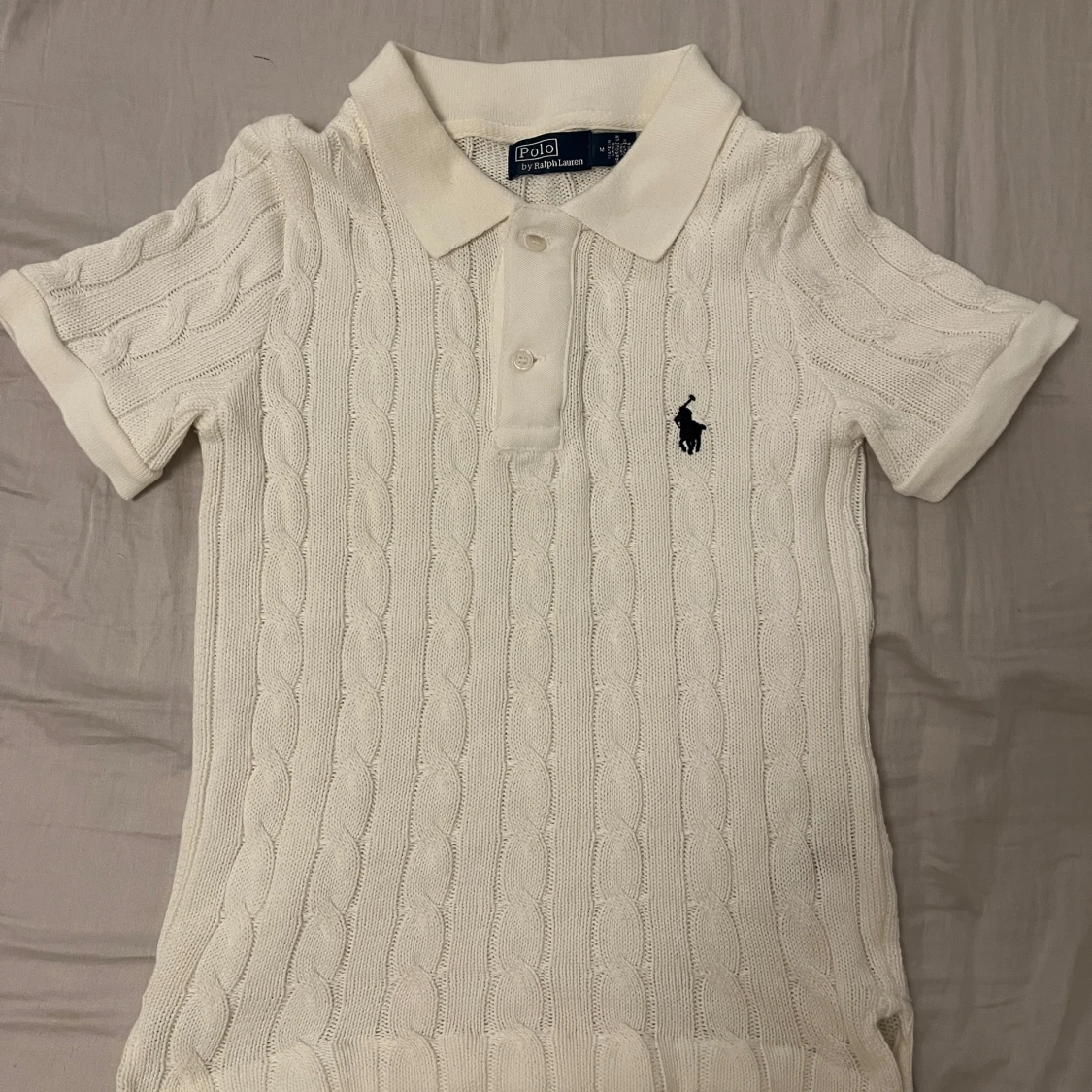Vit stickad pikétröja från Polo Ralph Lauren med klassisk krage, korta ärmar och broderad marinblå logga på bröstet. Tröjan är i bomull och har ribbade muddar vid ärmslut och nederkant. Använd 1 gång☺️