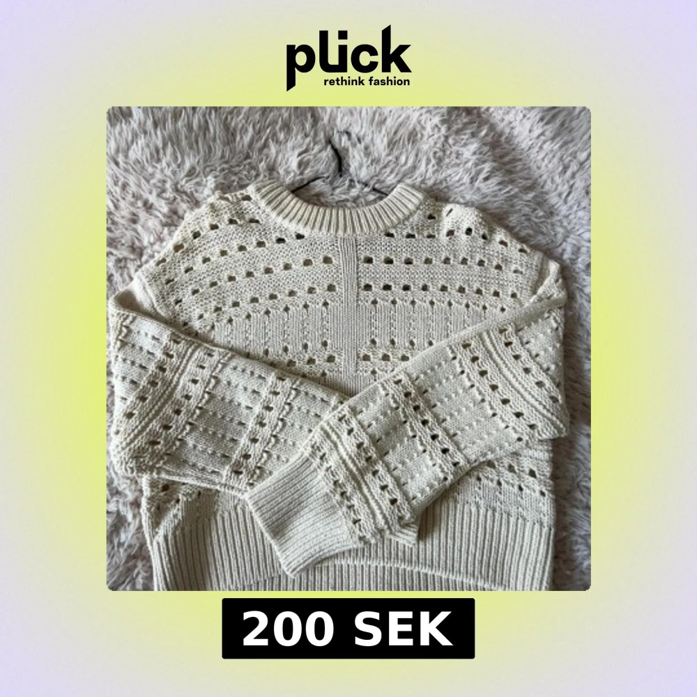 Säljer en beige stickad tröja med hålmönster och rund hals. Tröjan har lång ärm och ribbade muddar vid ärmslut och nederkant. Perfekt för lager-på-lager och perfekt till våren