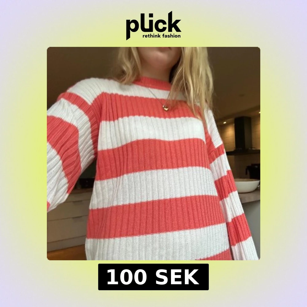 Jättefin randig stickad tröja i en jättefin korallfärg! Står ingen storlek eller märke men skulle gissa på att den är i strl M eller lite större. Inte sticksig alls☺️