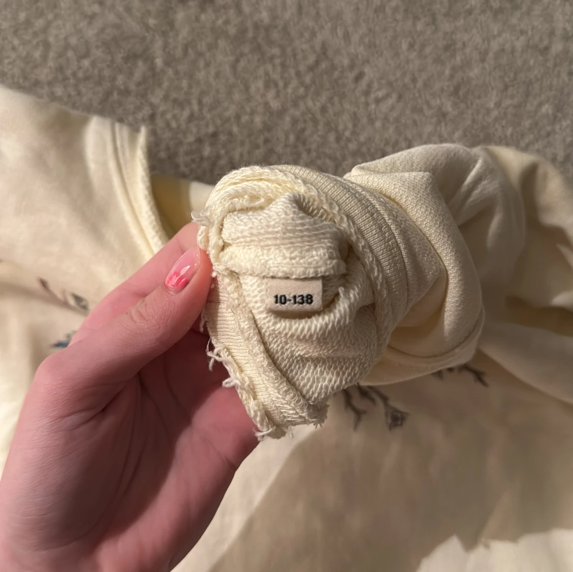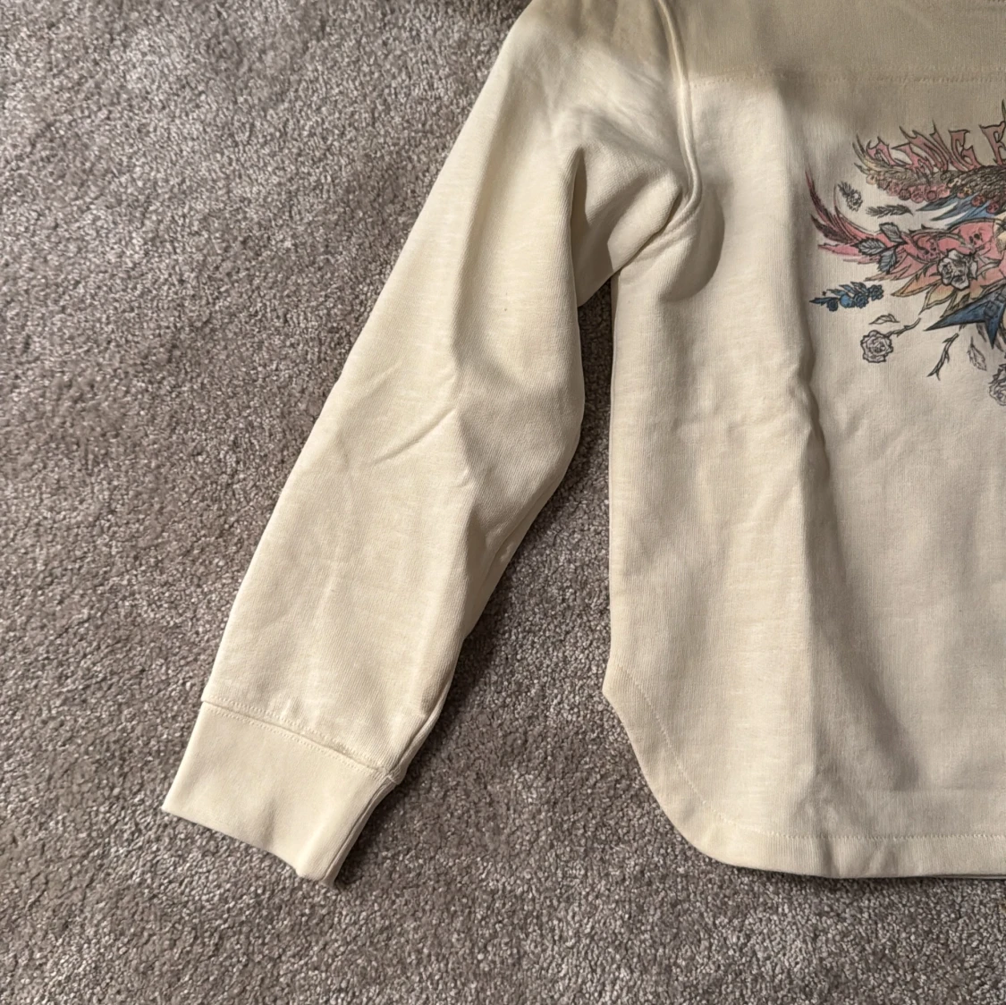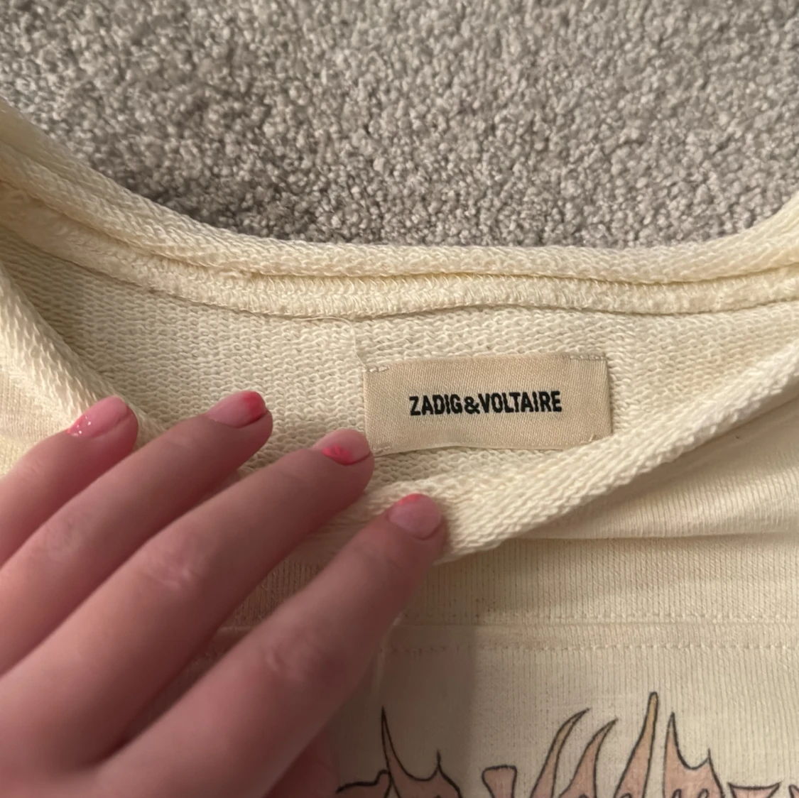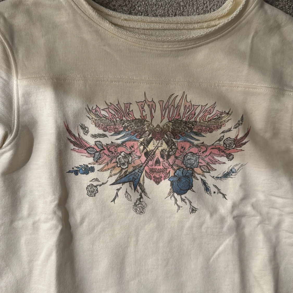 Säljer en vit långärmad tröja från Zadig & Voltaire med coolt tryck framtill i rosa, blått och beige. Tröjan har rund halsringning och mjukt bomullsmaterial. Perfekt för dig som gillar unika prints och streetstyle.