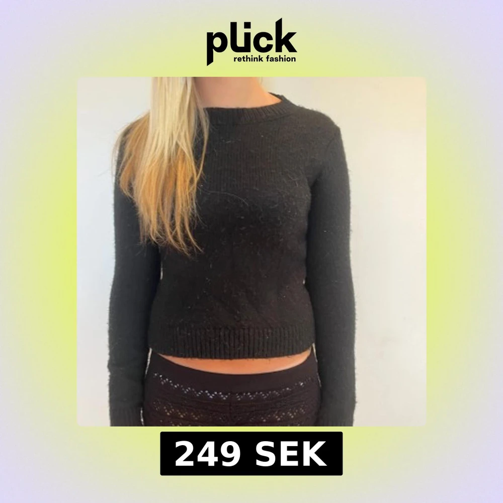 En svart stickad tröja med rund halsringning och långa ärmar. Tröjan har ribbade muddar vid ärmslut och nederkant.