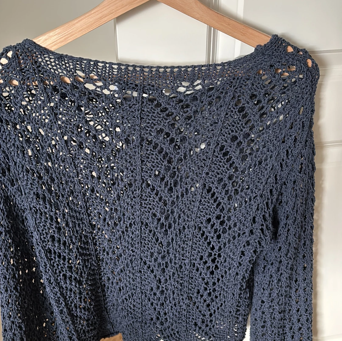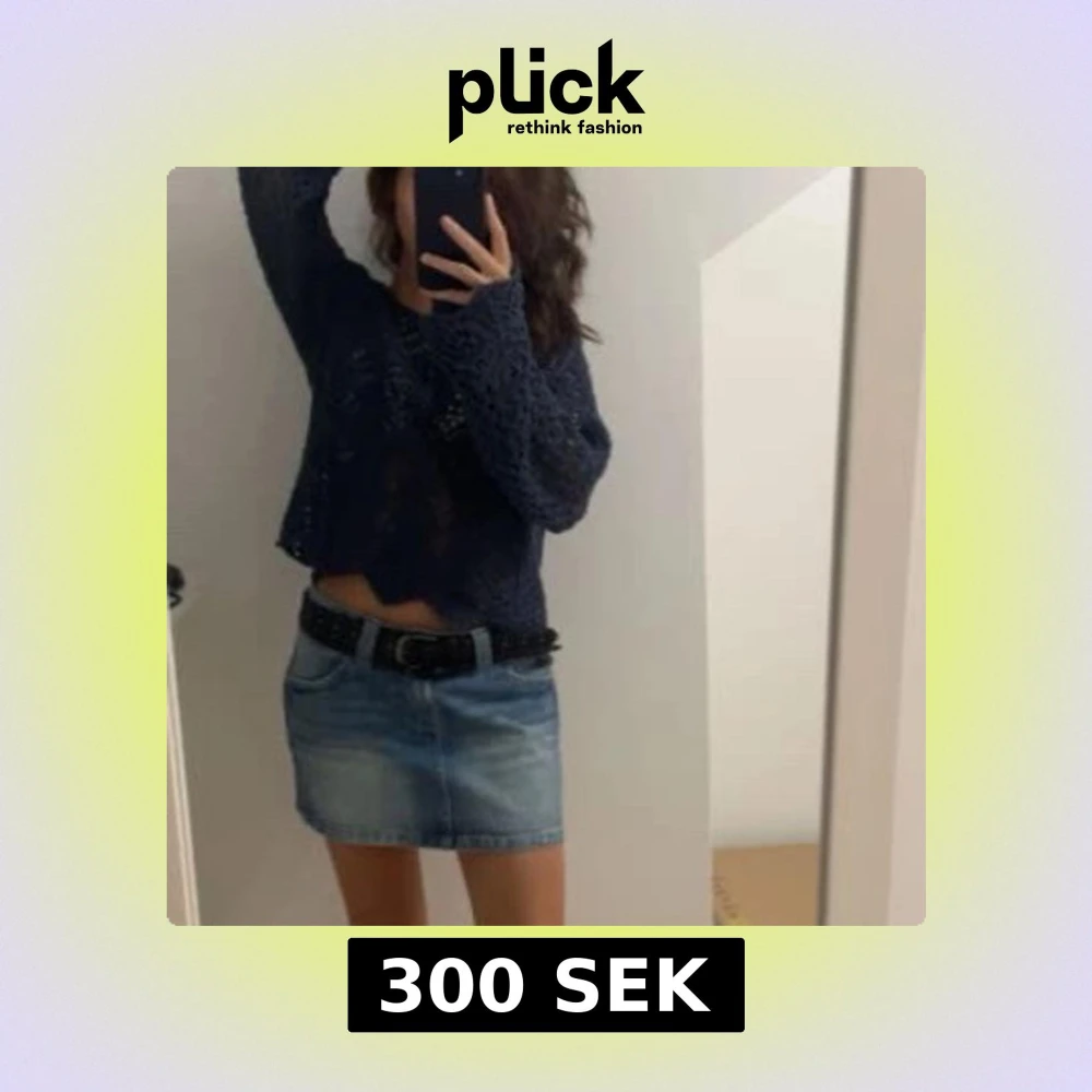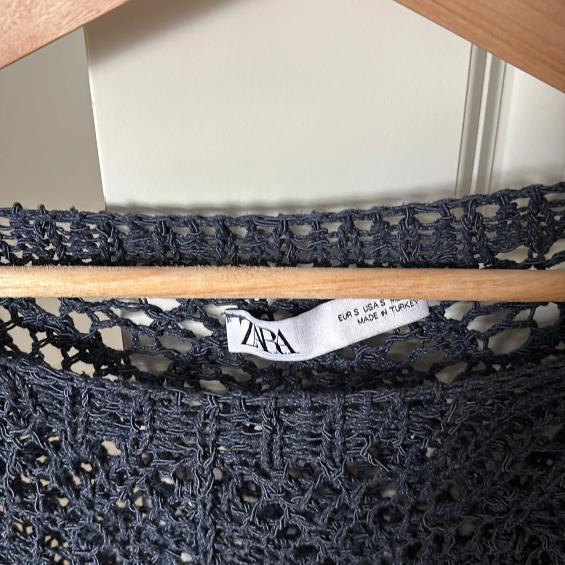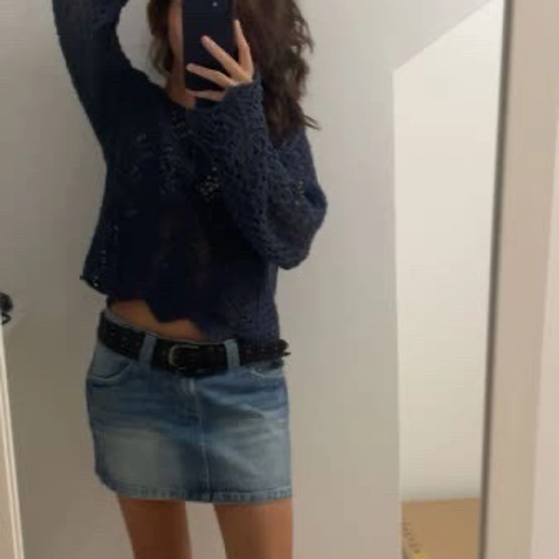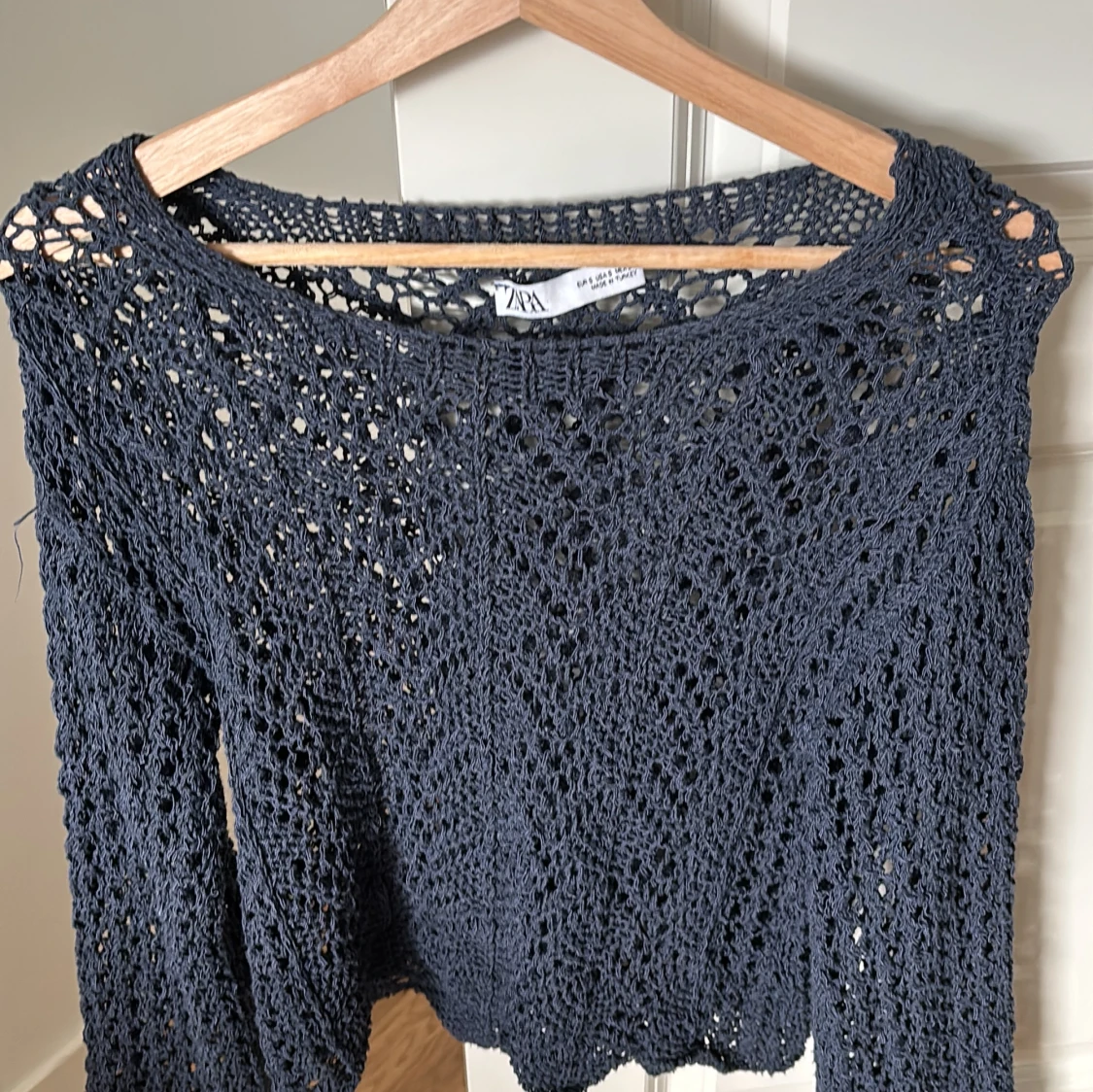 Säljer en mörkblå stickad tröja från Zara i storlek S. Tröjan är virkad med snyggt mönster, har lång ärm och är croppad. Perfekt att styla med kjol eller jeans för en chill vibe. Materialet känns luftigt och passar bra till vår och sommar.