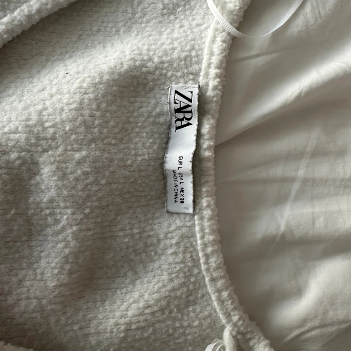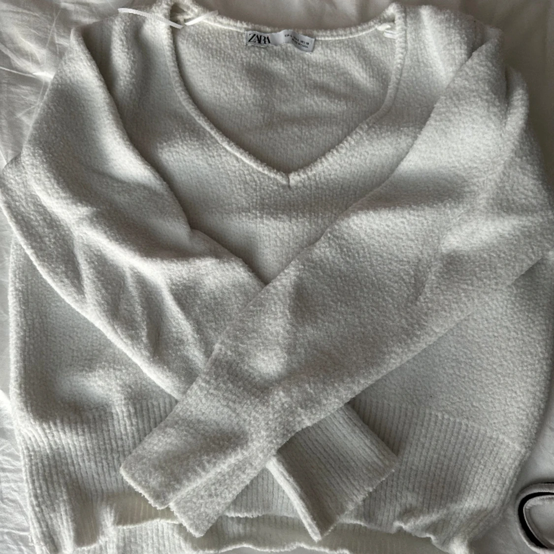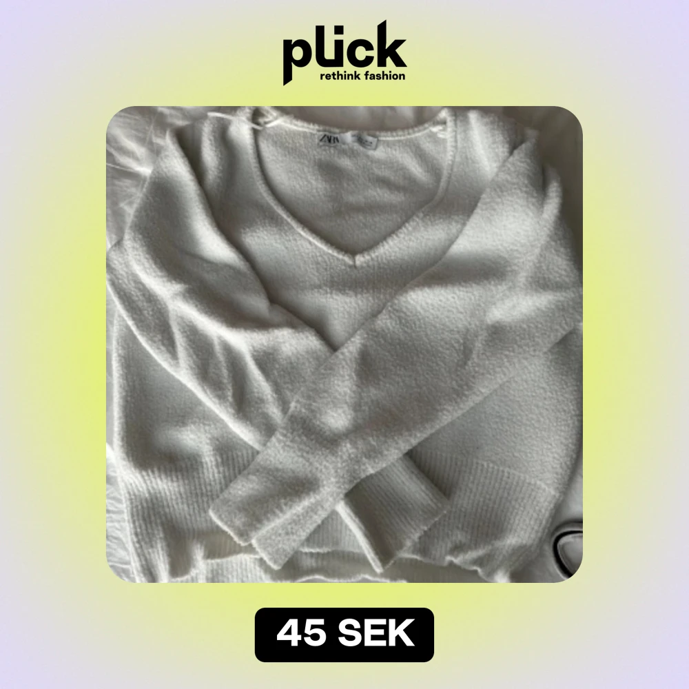 En vit stickad tröja som är väldigt liten i storleken, därav att jag köpte L(hade zs-s egentligen när jag köpte den). Använd därav priset. Den är även fin att ha bakomfram så v-ringningen är där bak.