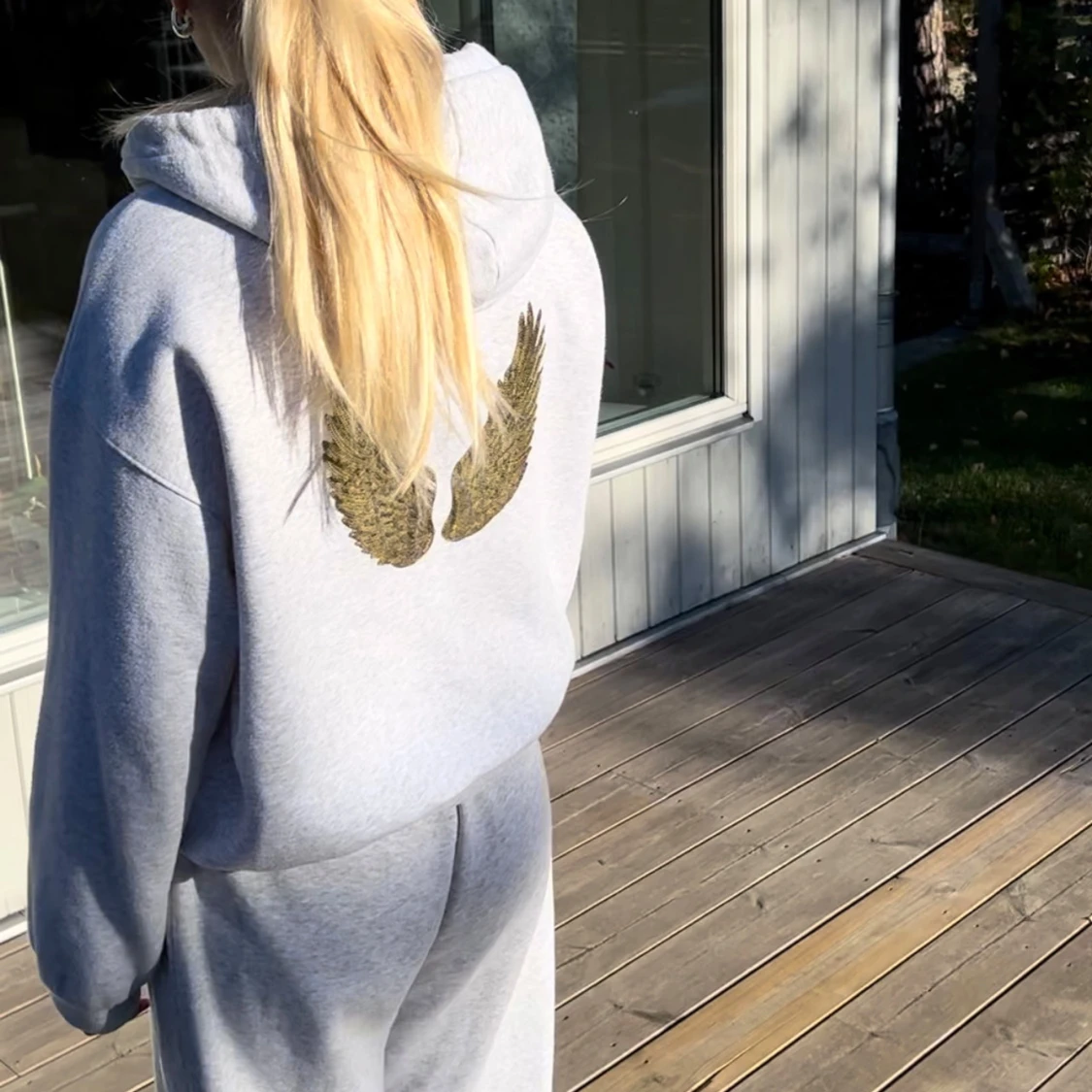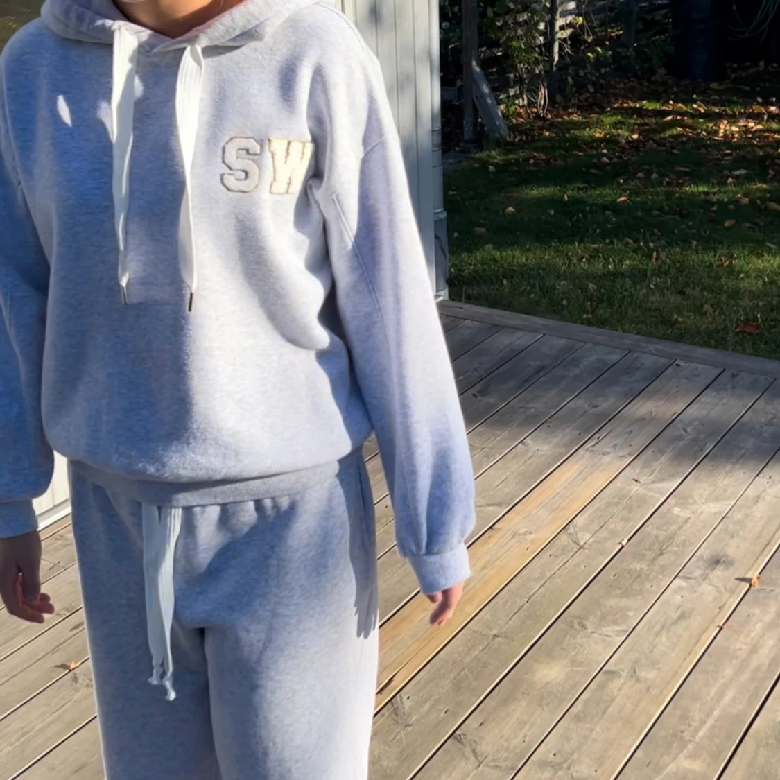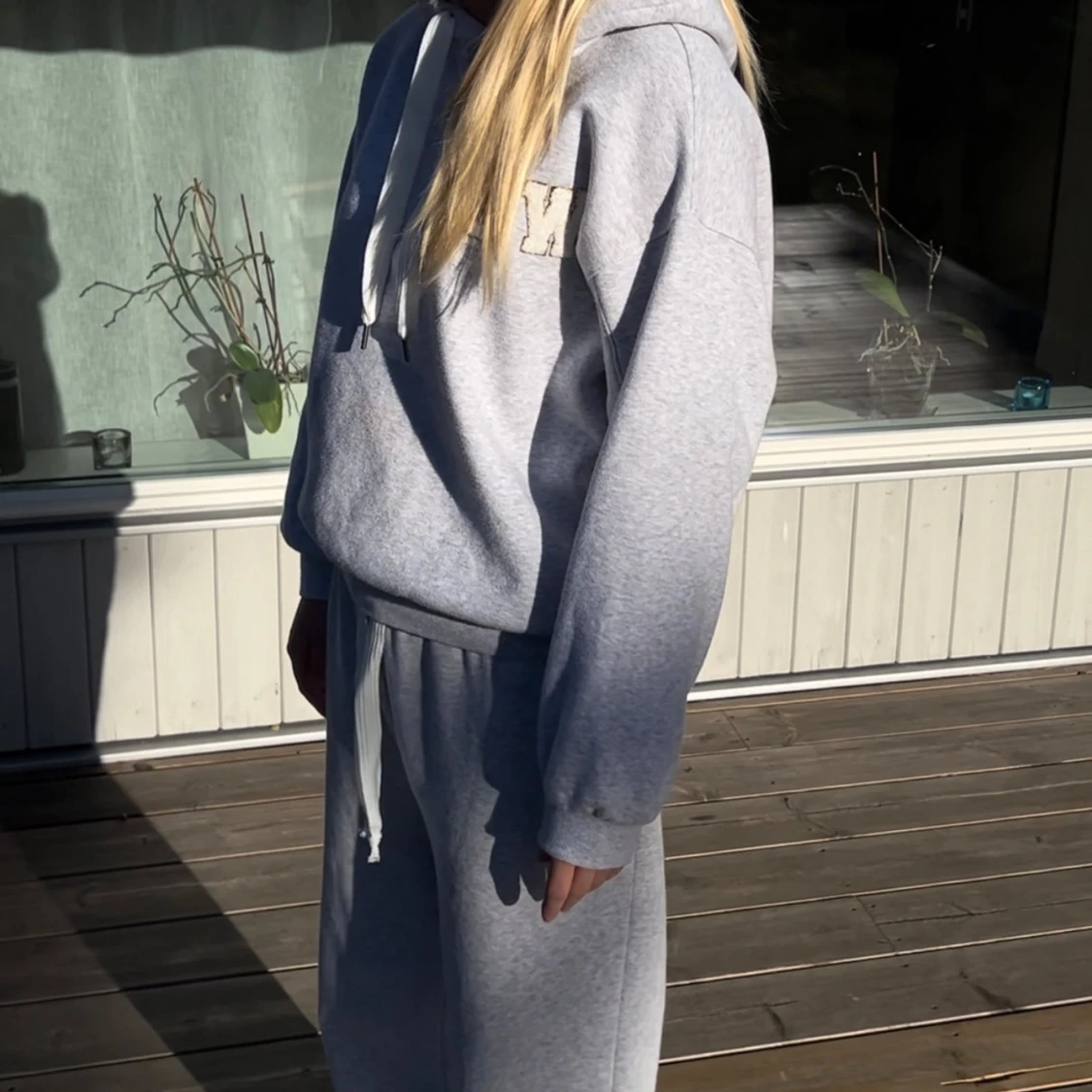 Grått mjukissett, lite oversized, så passar allt ifrån mindre S till större M. Nyskick