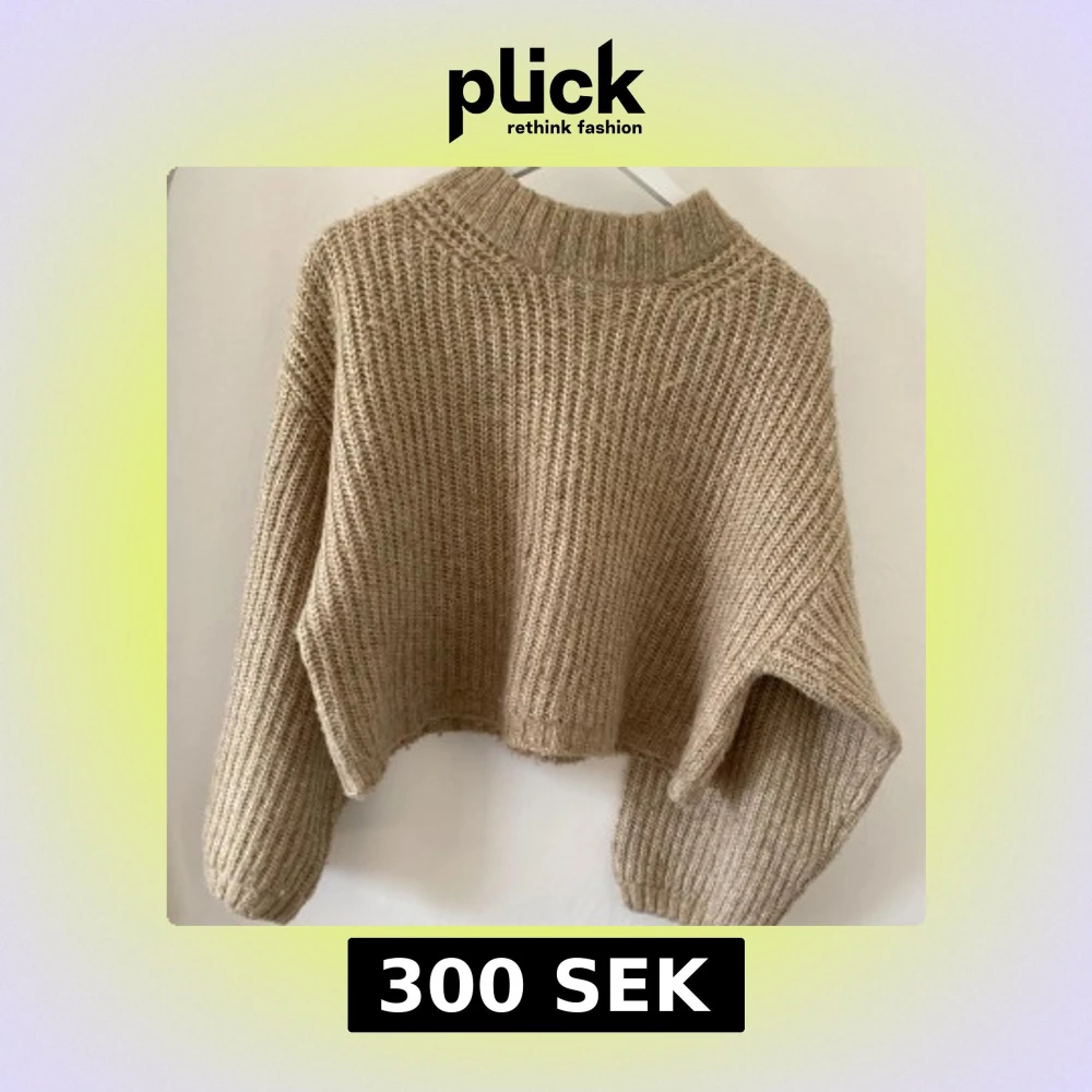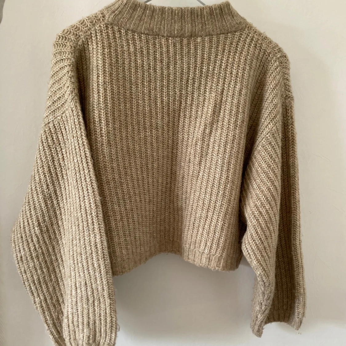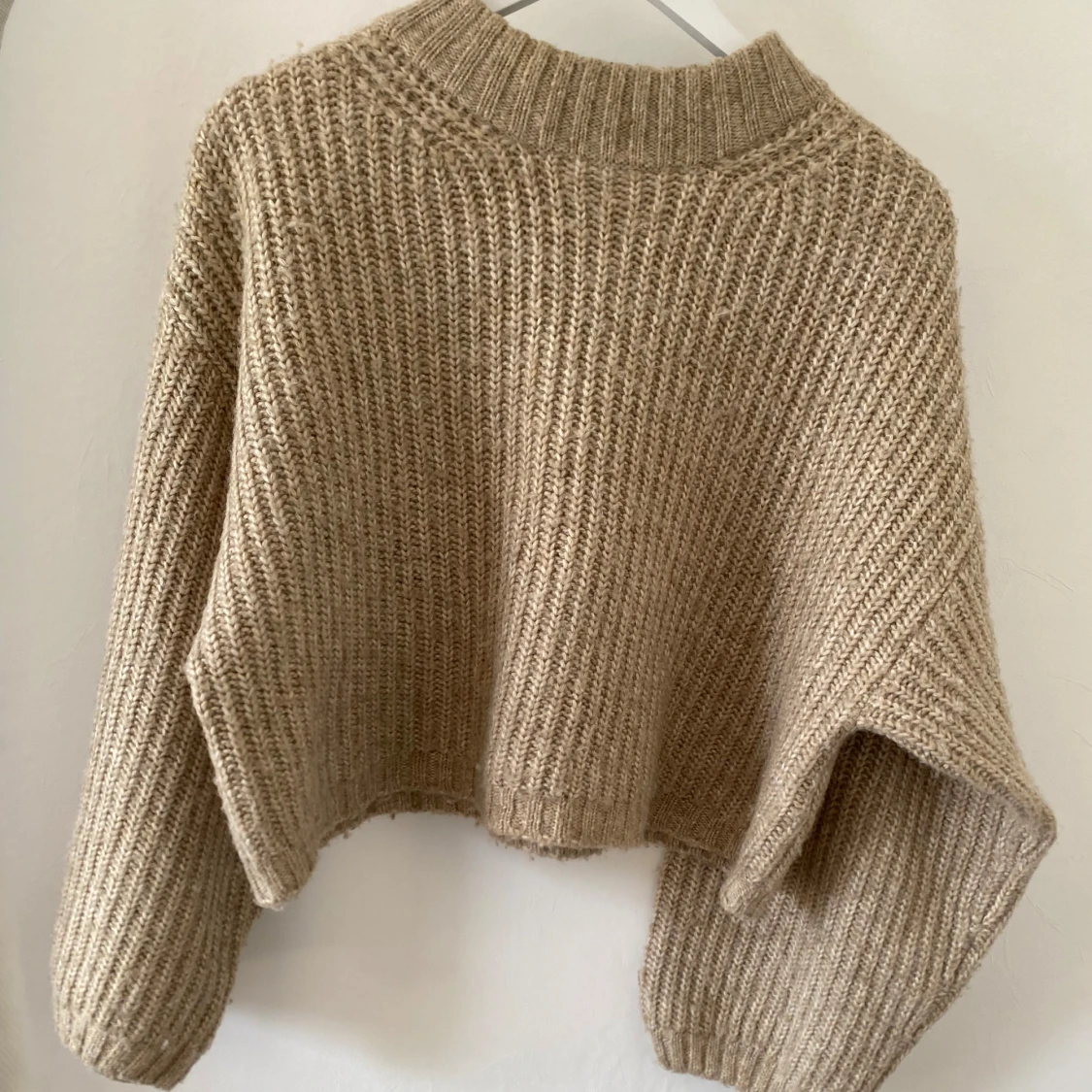 Säljer en beige stickad tröja med croppad passform och breda, långa ärmar. Tröjan har en ribbad struktur och en hög, ribbad halsringning som ger en chill och trendig vibe.
