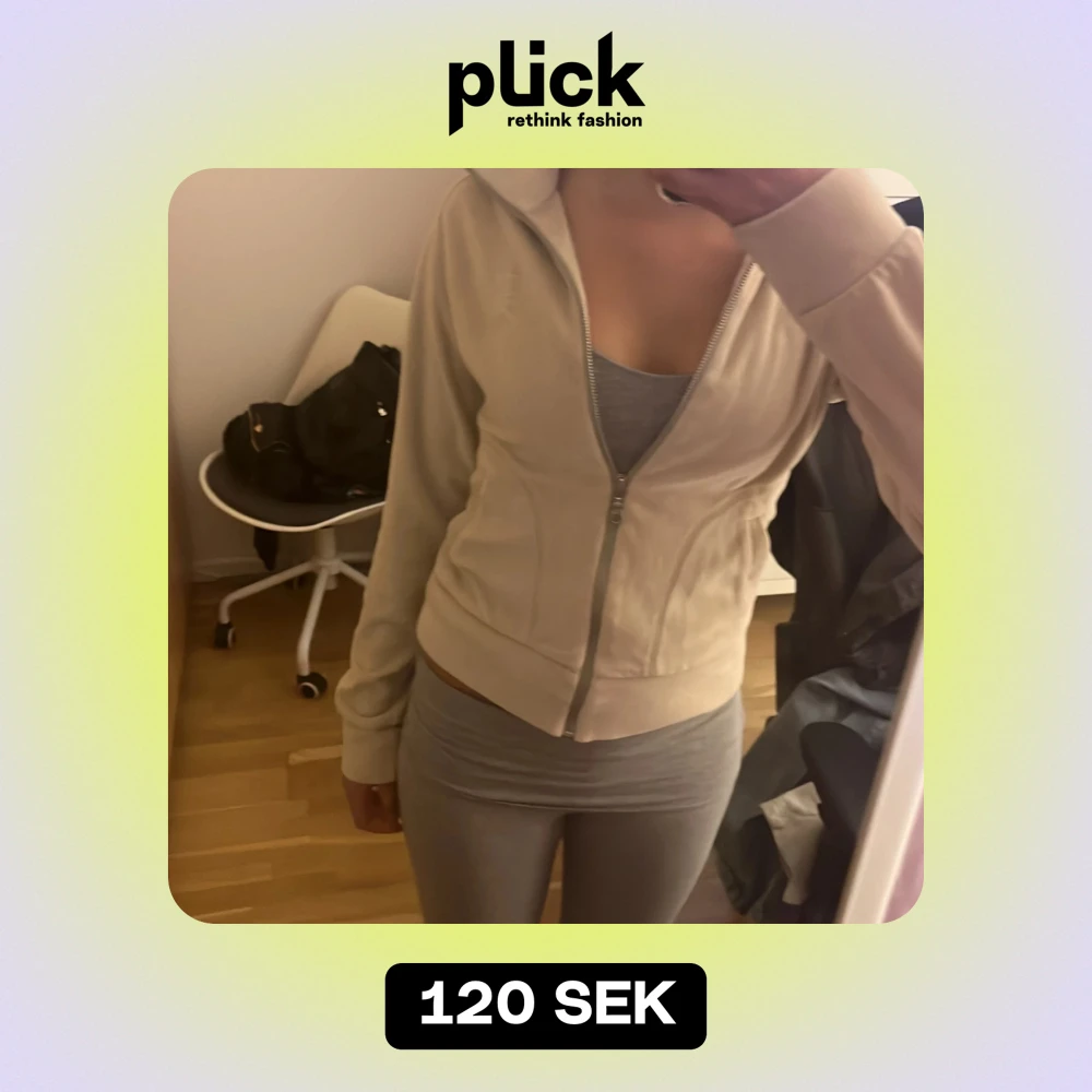 Säljer en beige hoodie med dragkedja framtill. Den har en broderad bokstav på bröstet och långa ärmar. Perfekt för mysiga dagar eller som ett extra lager under jackan. Passar till både vardag och chill.
