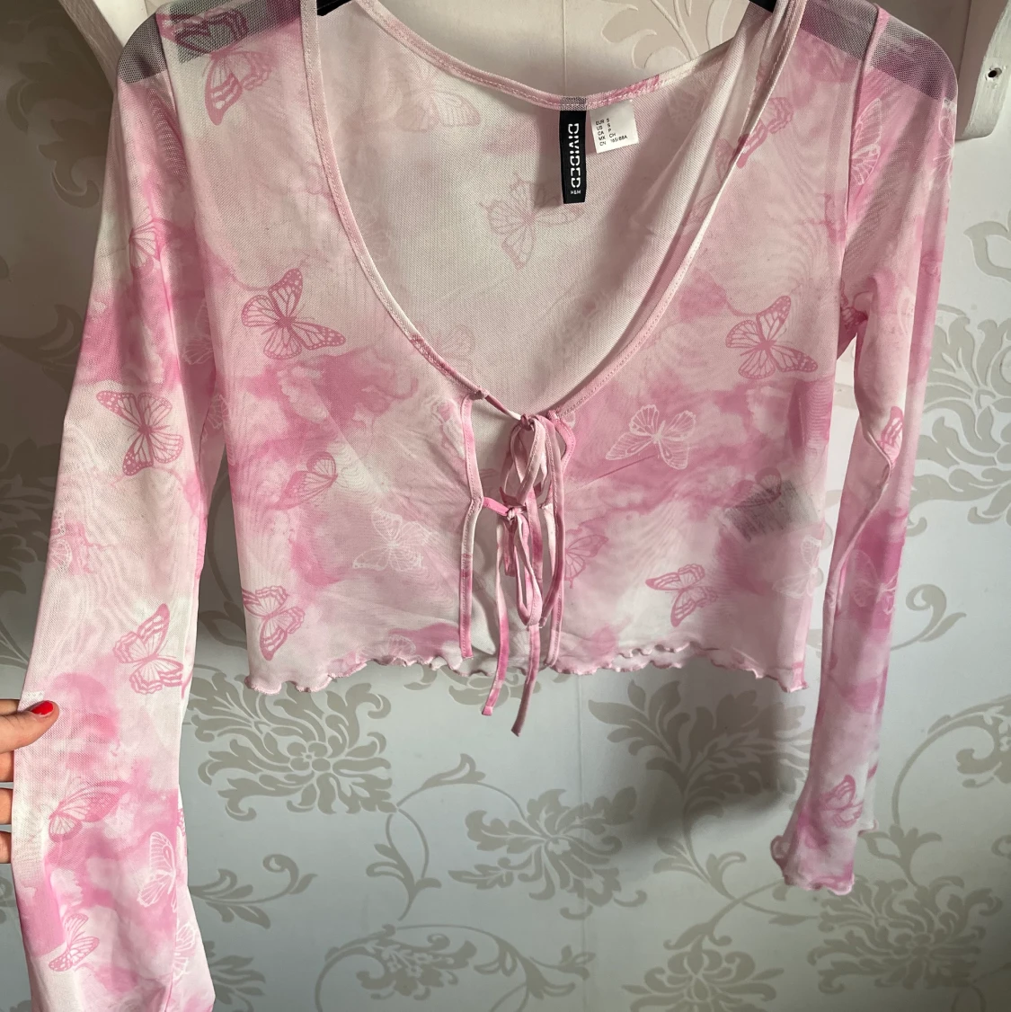 Supersöt kofta i vitt och rosa med rosetter. Har aldrig kommit till användning, genomskinligt material. 🌸