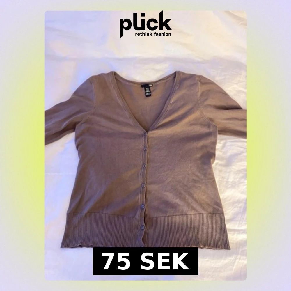 Snygg beige kofta från H&M i storlek L. Den har v-ringad hals, långa ärmar och knappar hela vägen framtill. Materialet är mjukt och tunt, perfekt för lager-på-lager. Ribbad kant nedtill och vid ärmslut ger en schysst detalj.