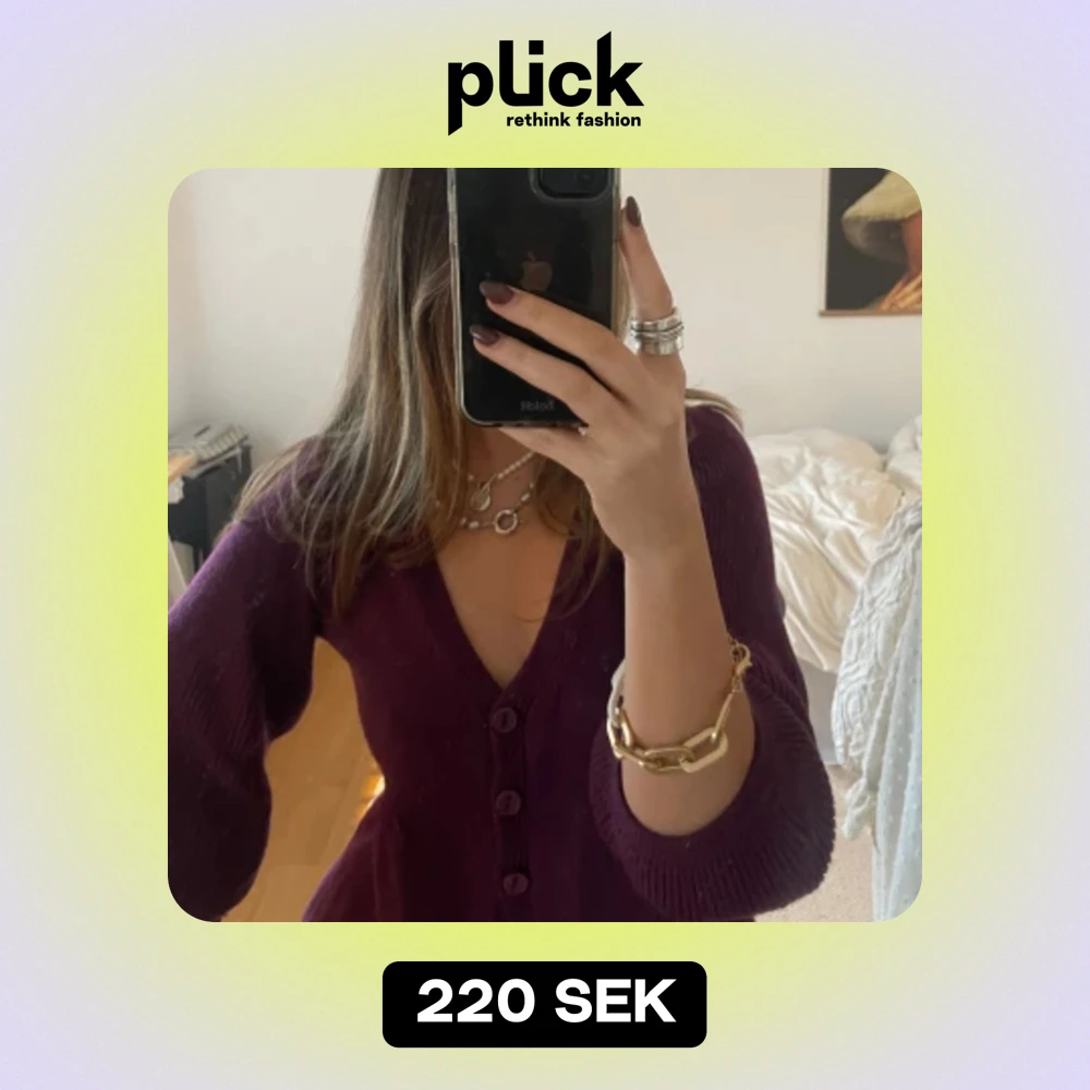 Jättesöt mörklila kofta som ibland kan skifta till en lite vinröd ton. Koftan är förövrigt i ett väldigt bra skick och består utav ett väldigt skönt stickat material. Perfekt nu till hösten! Hör gärna av dig vid fler frågor💋💋