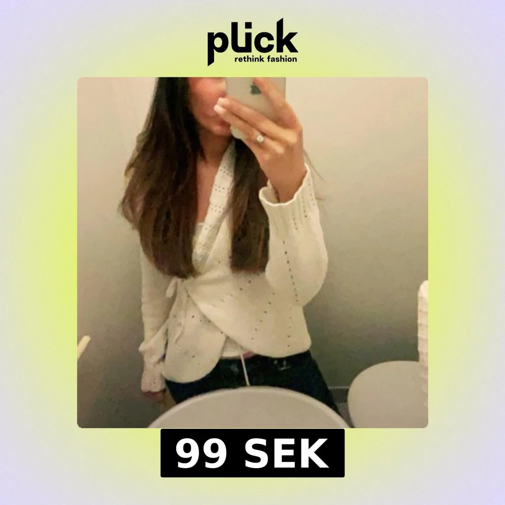 Säljer en vit omlott kofta med knyt i midjan. Koftan har lång ärm och är stickad med små hålmönster för en extra detalj. Perfekt för lager-på-lager och passar till mycket.