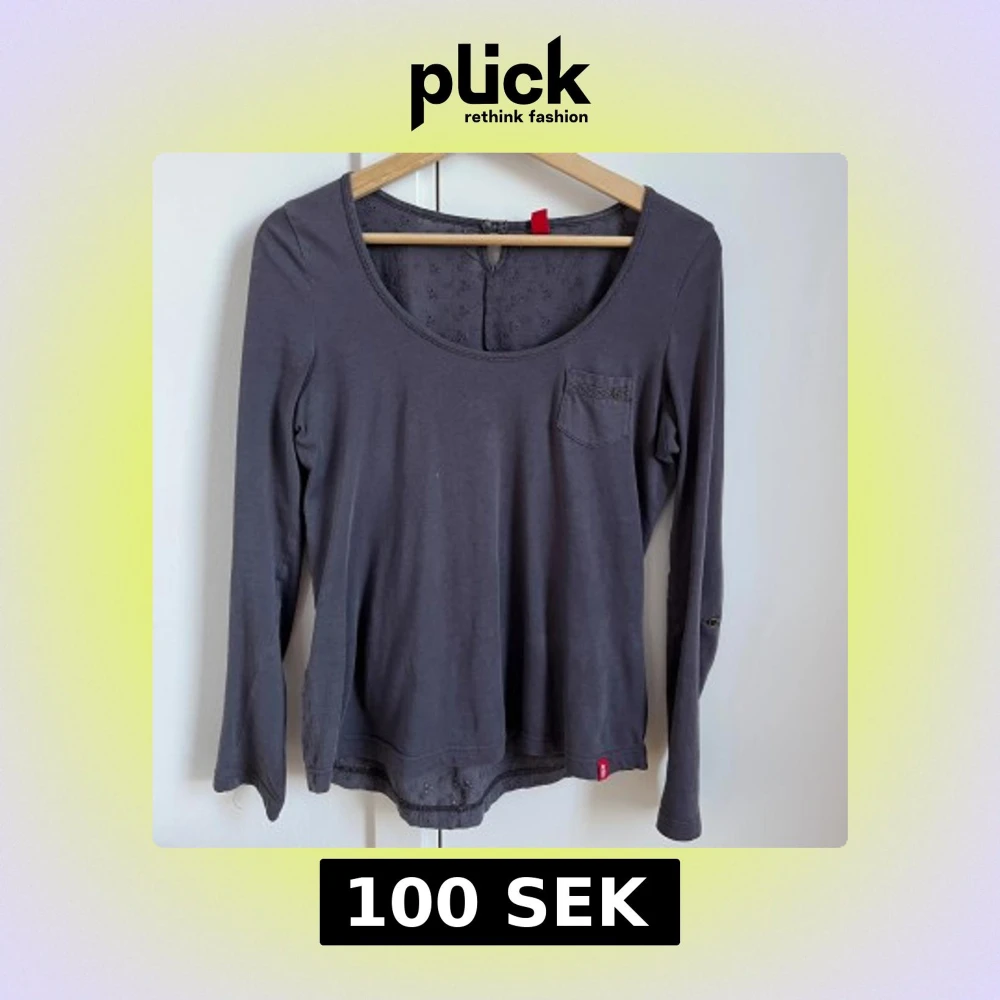 Supersnygg mörkgrå/lila långärmad topp från Esprit med rund halsringning, liten bröstficka och broderade spetsdetaljer på ryggen. Mjuk bomullskänsla och knapp i nacken och armarna. Perfekt för dig som gillar stilrena plagg med en twist. 💜