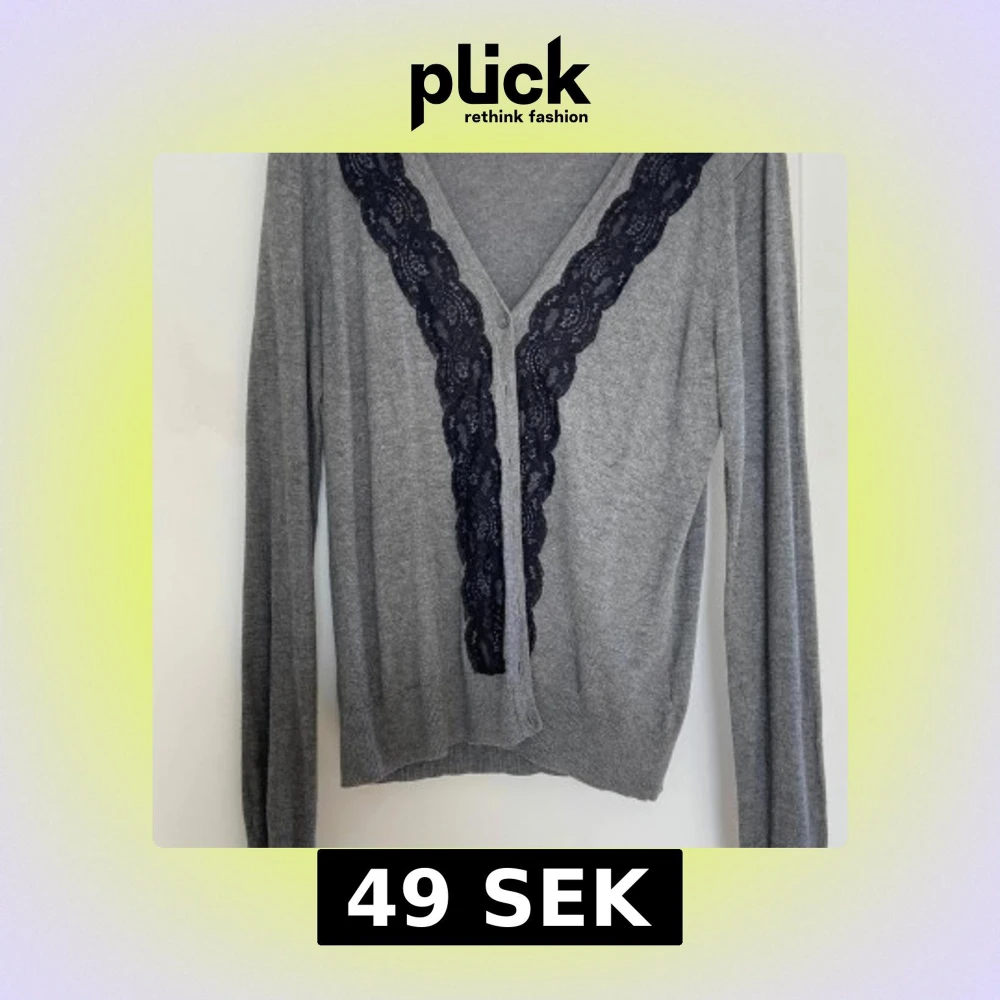 Säljer en elegant grå kofta med svarta spetsdetaljer längs den v-ringade öppningen. Koftan har långa ärmar och ribbstickade kanter. Perfekt för en stilren look.
