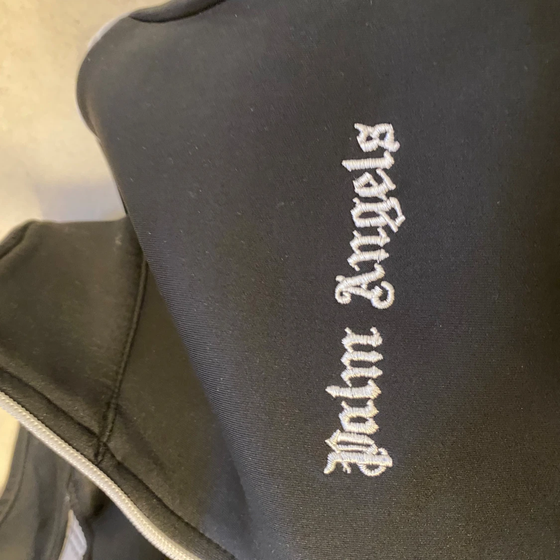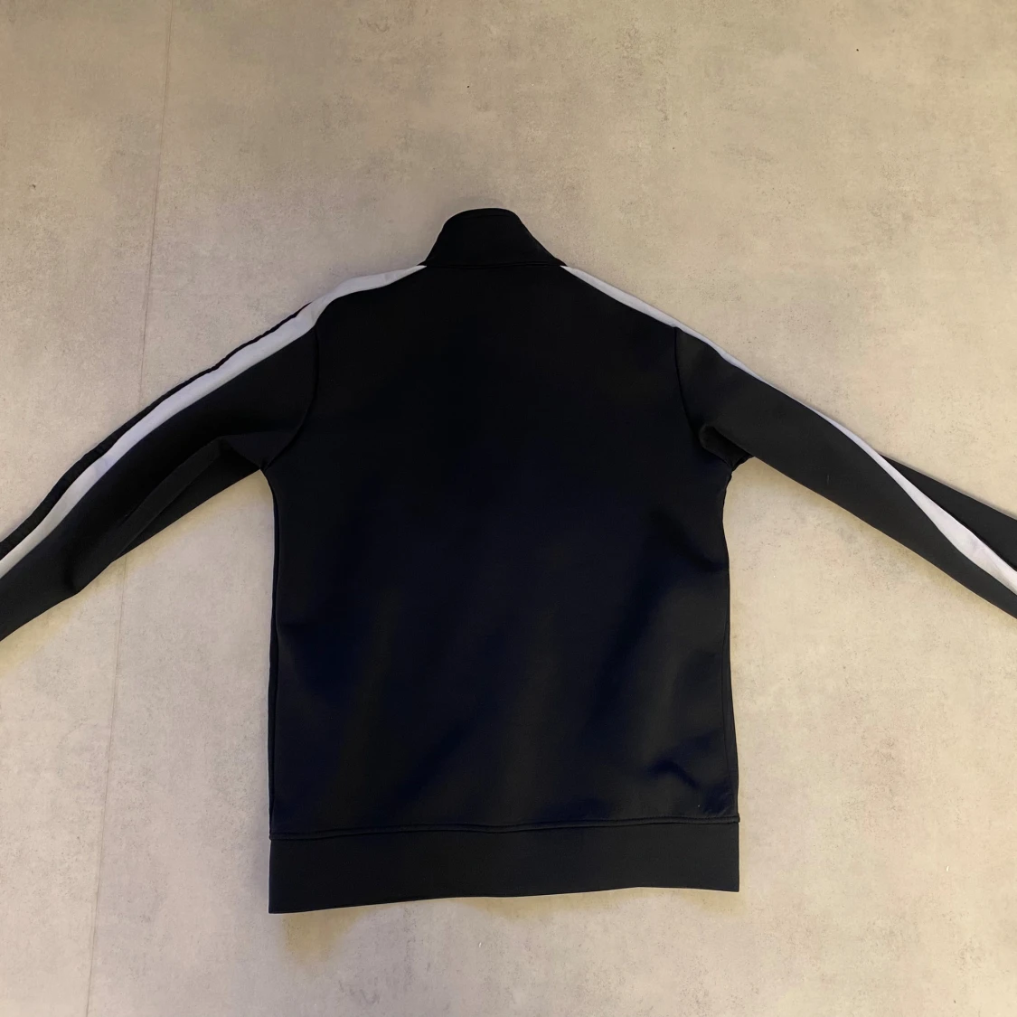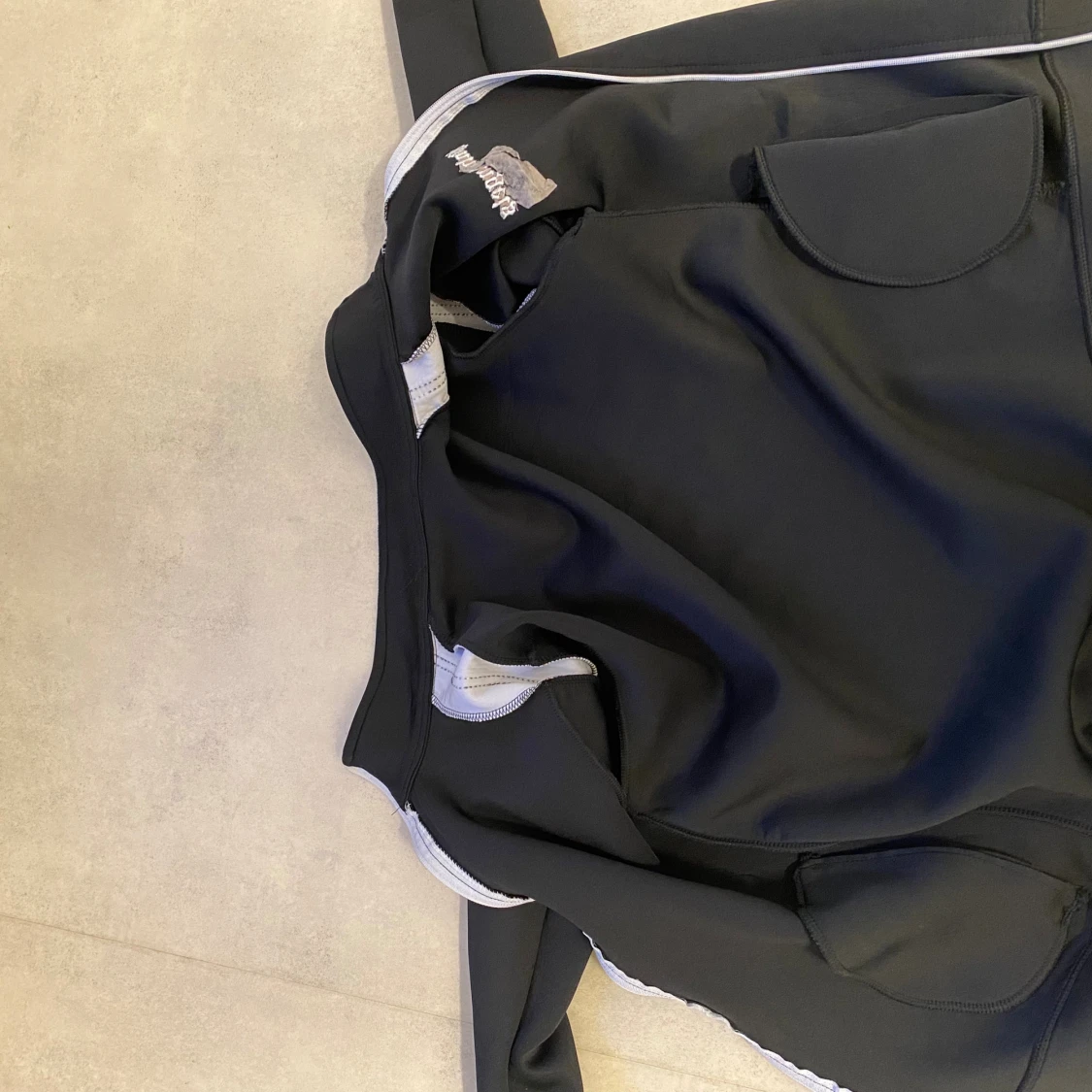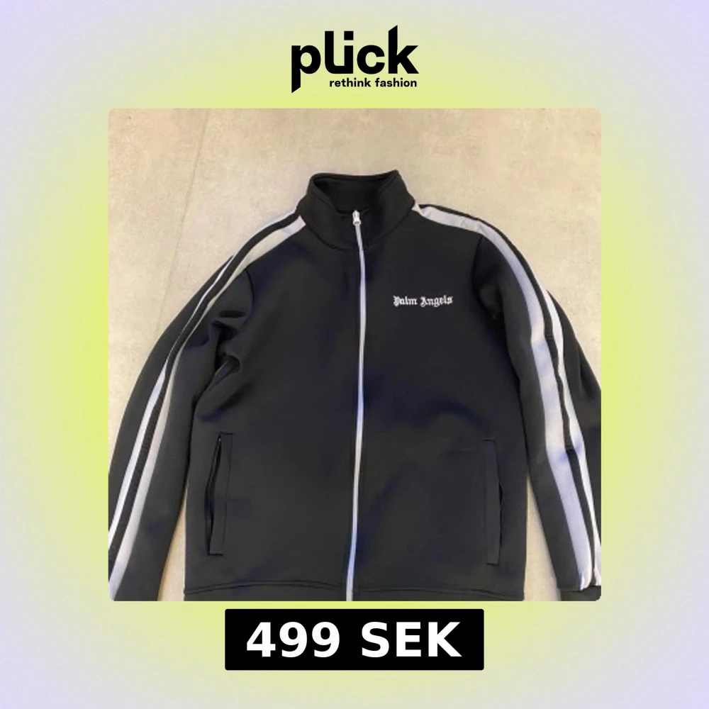 Svart track jacket från Palm Angels med vita ränder längs ärmarna och broderad logga på bröstet. Jackan har hög krage, hel dragkedja framtill och två fickor. Materialet är mjukt och stretchigt, perfekt för en sportig och trendig look. Priset går att sänkas och jackan passar Xs också.