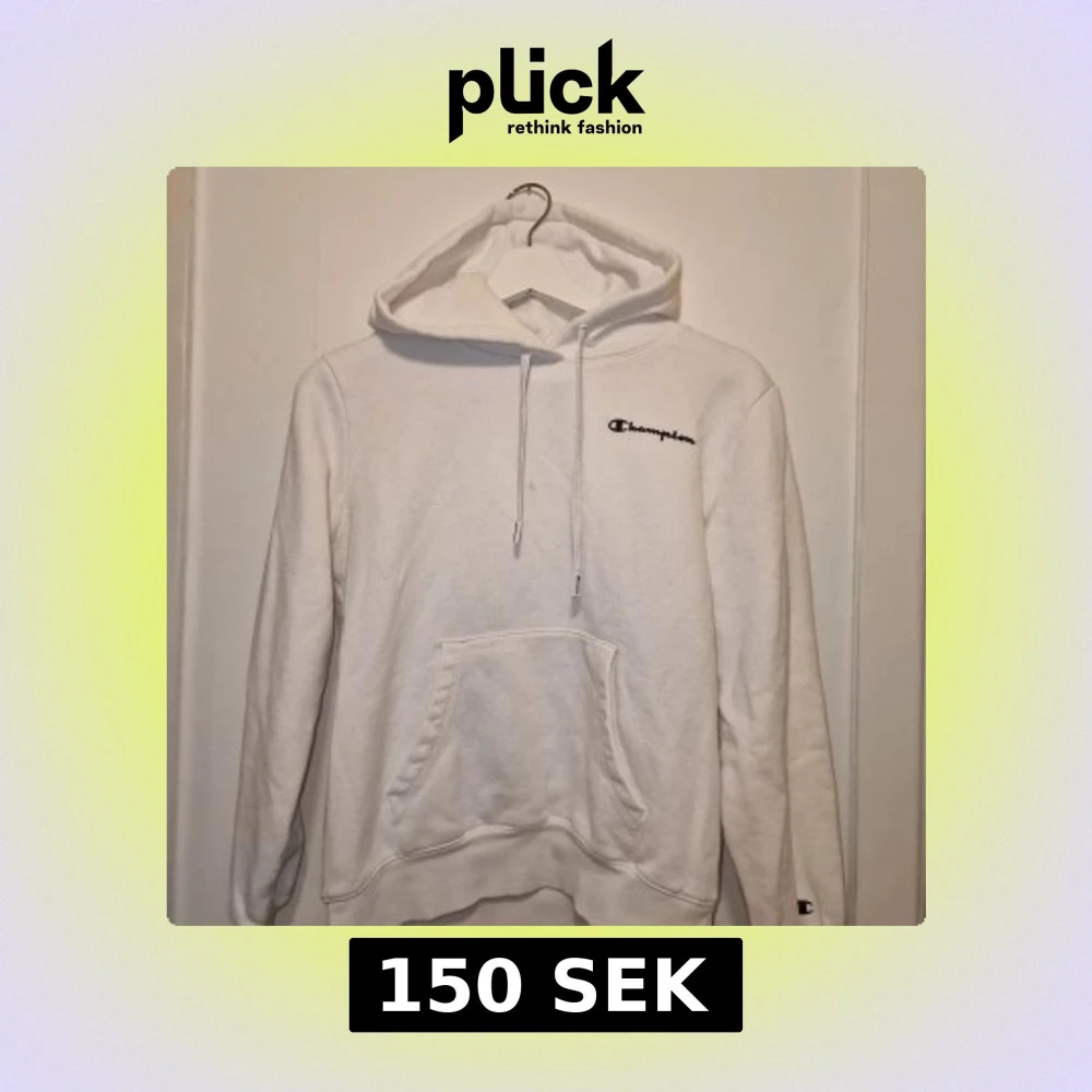 Vit hoodie från Champion i storlek medium. Mjuk och skön bomullsmix, perfekt för chill eller streetwear. Har en liten fläck på framsidan (se första bilden) annars i väldigt fint skick. Passar även S.